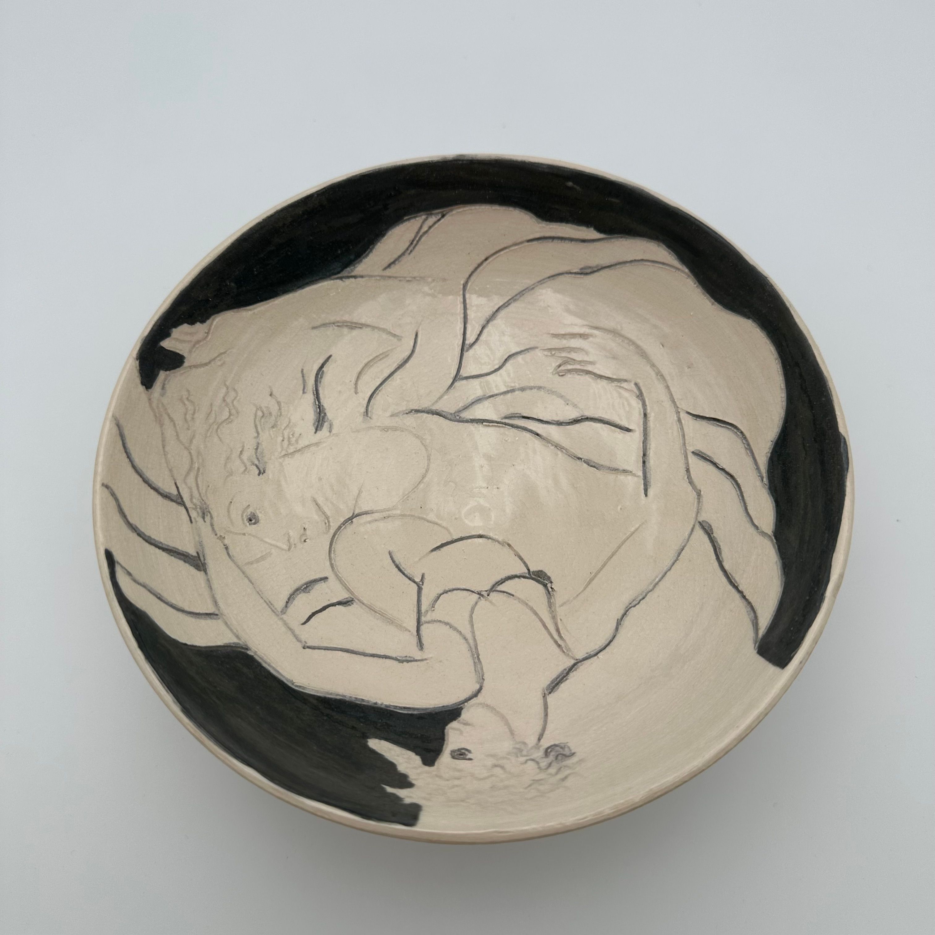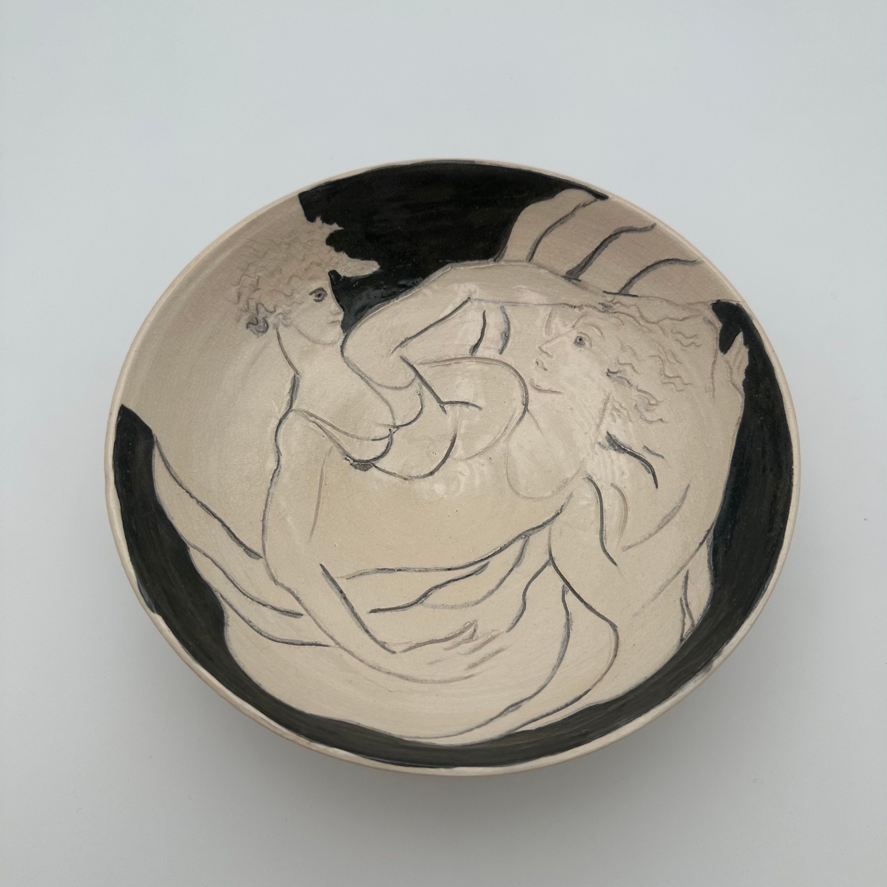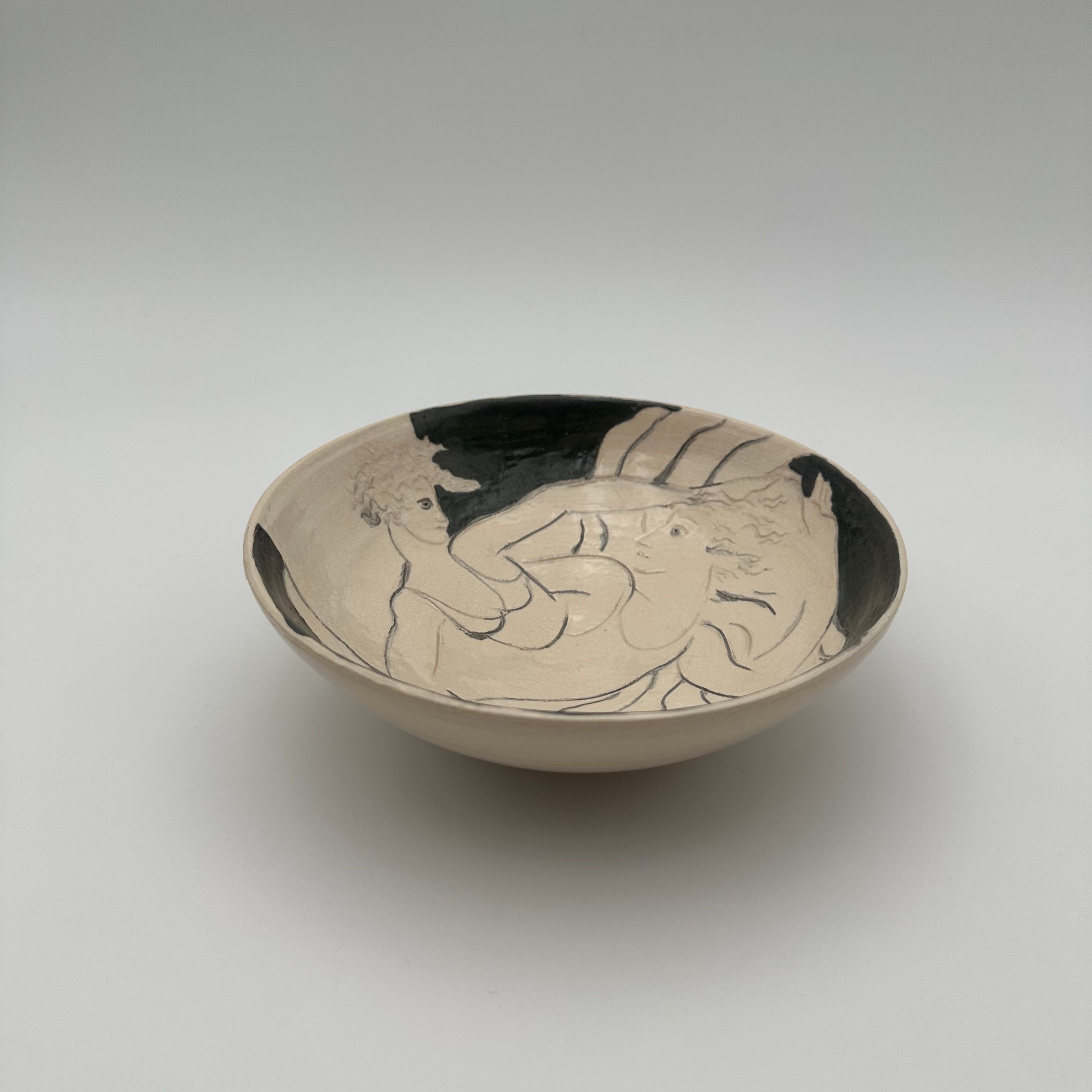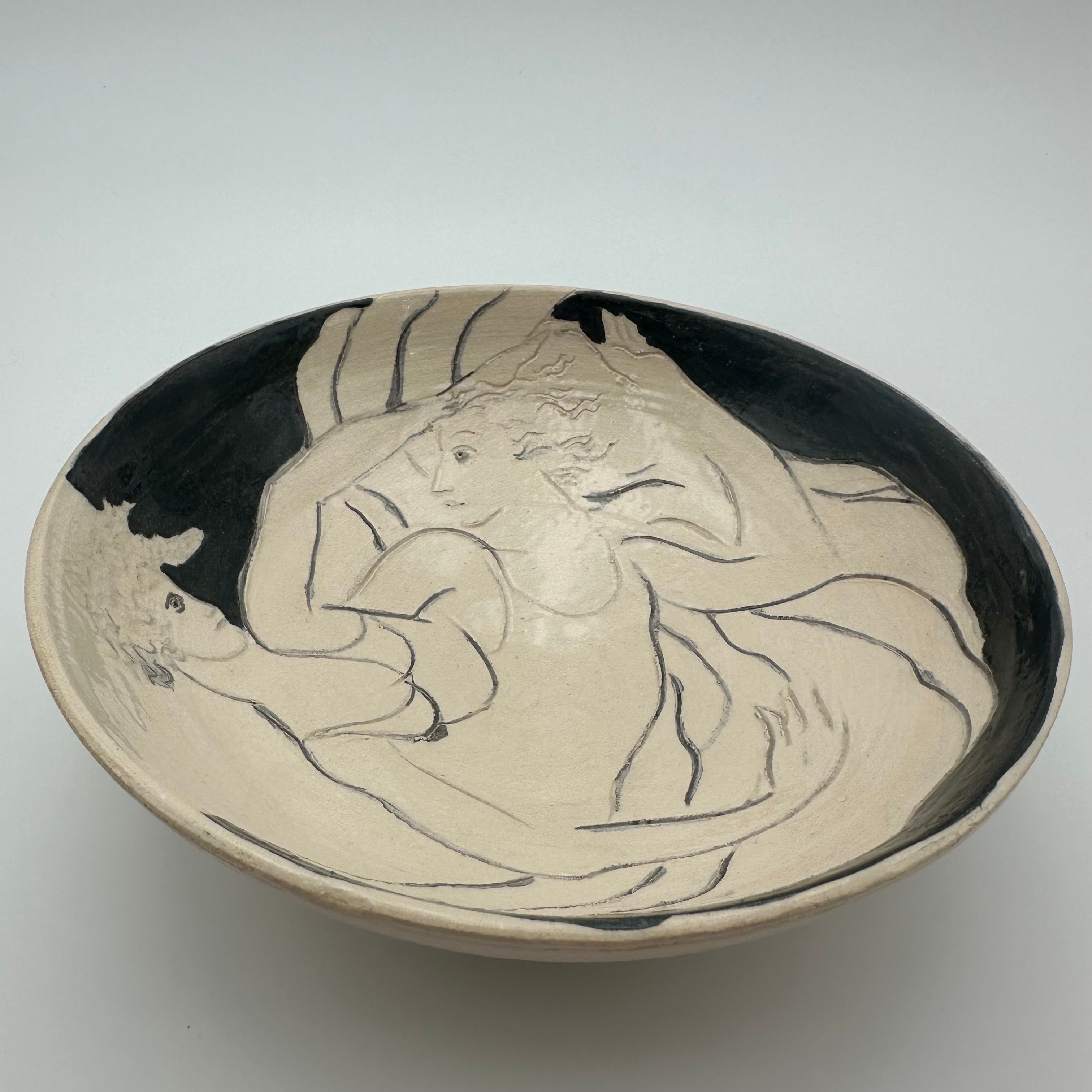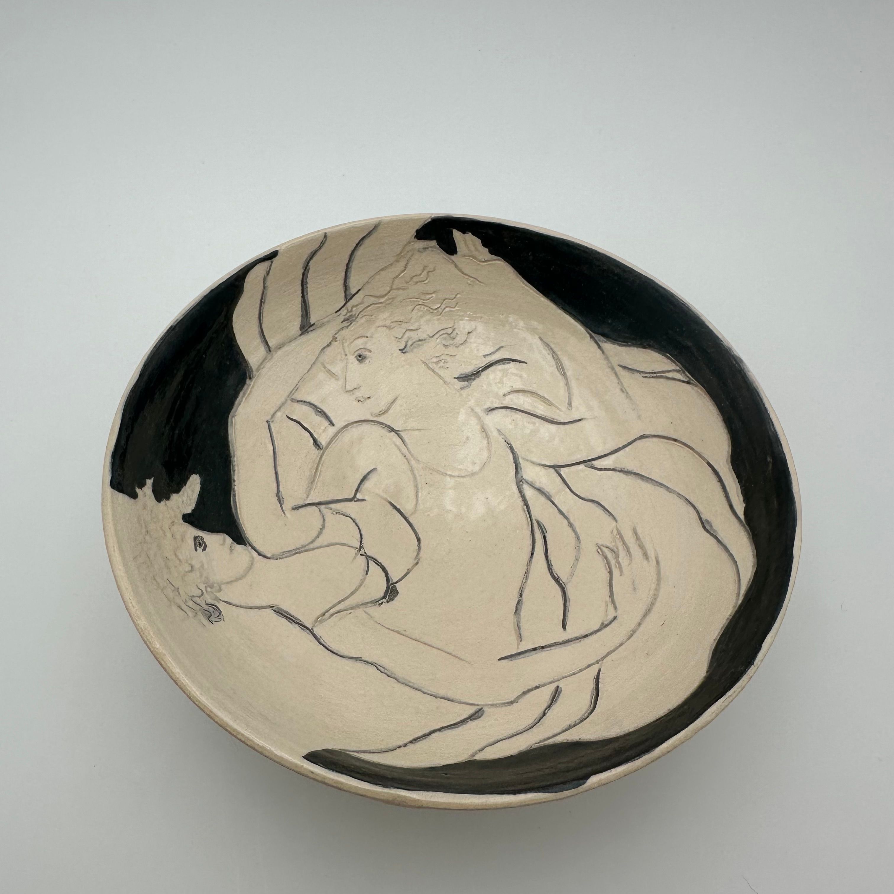 Ceramic bowl decorated with a drawn representation of two women, executed in a free and expressive style.