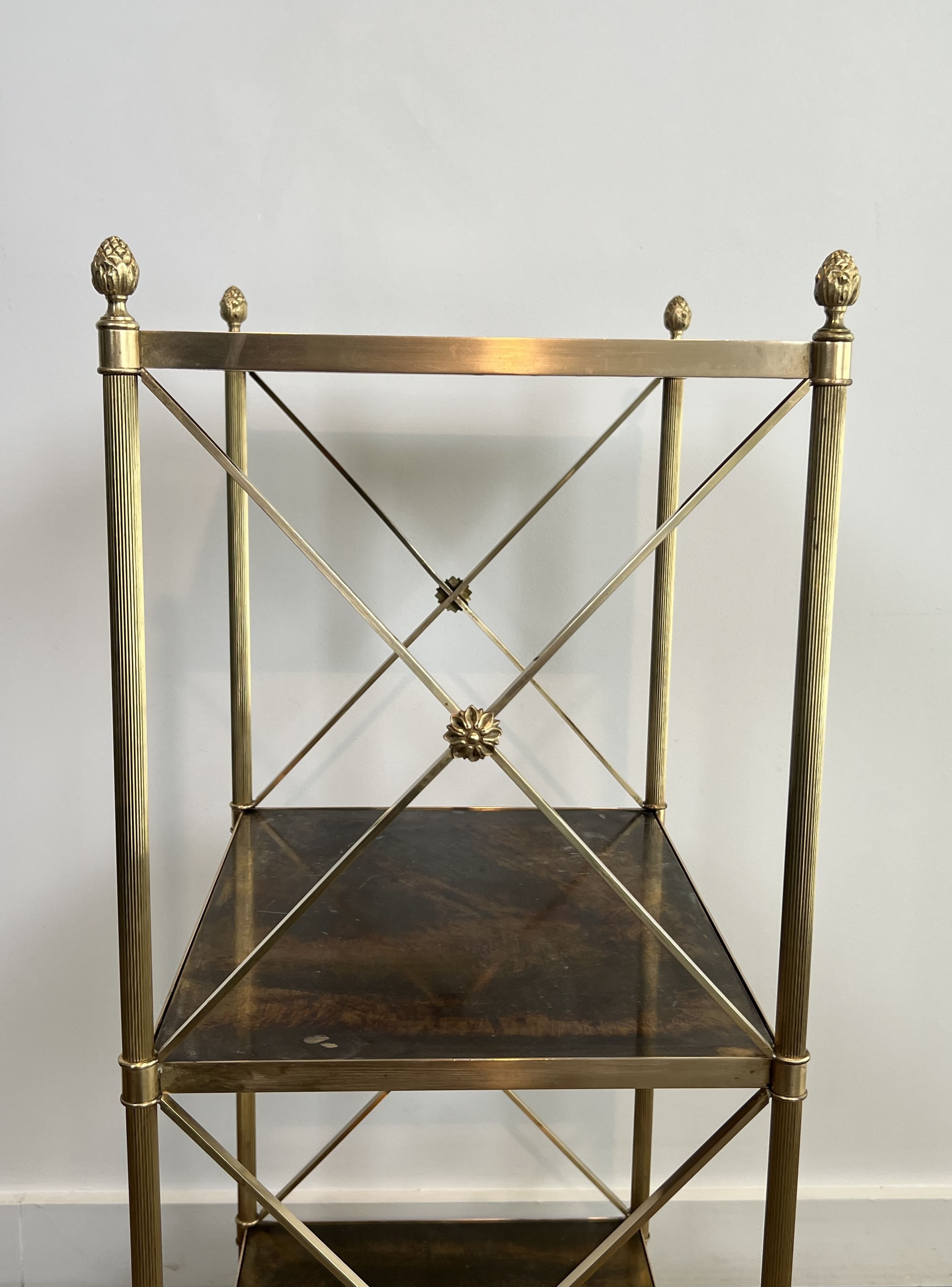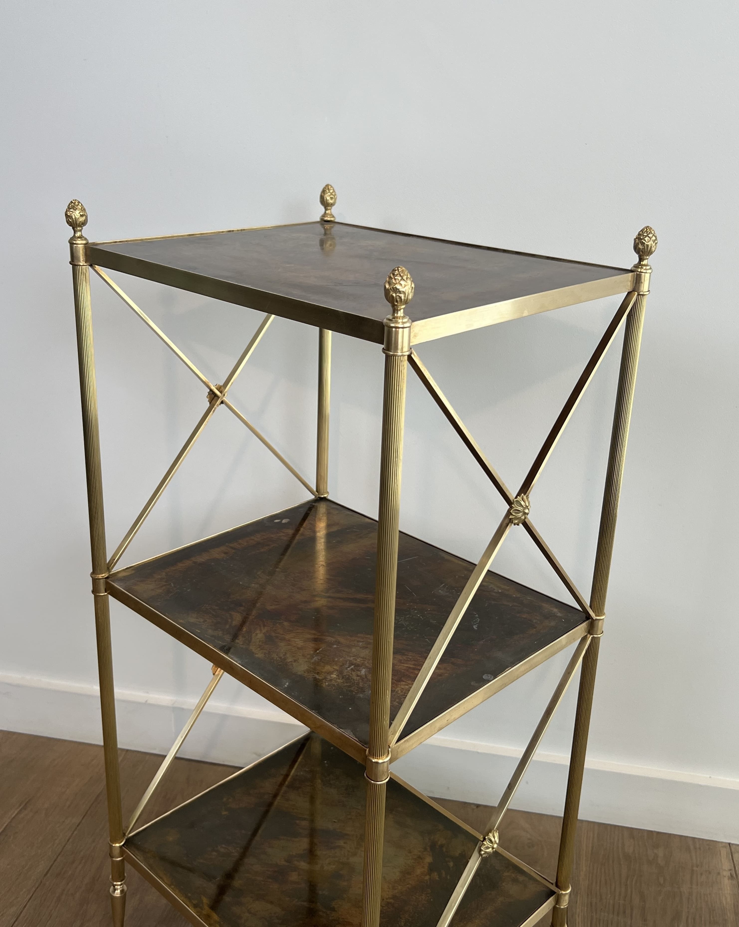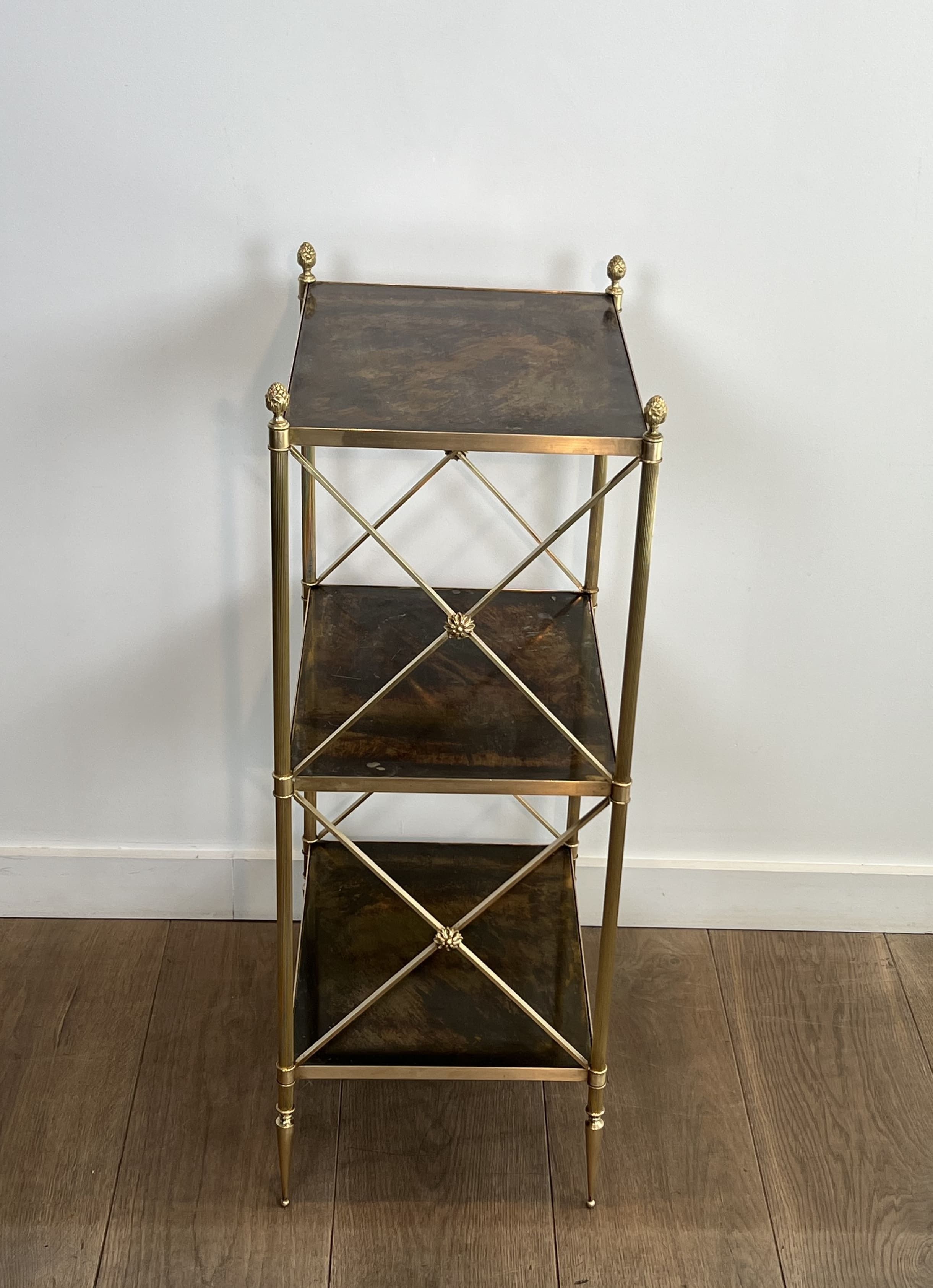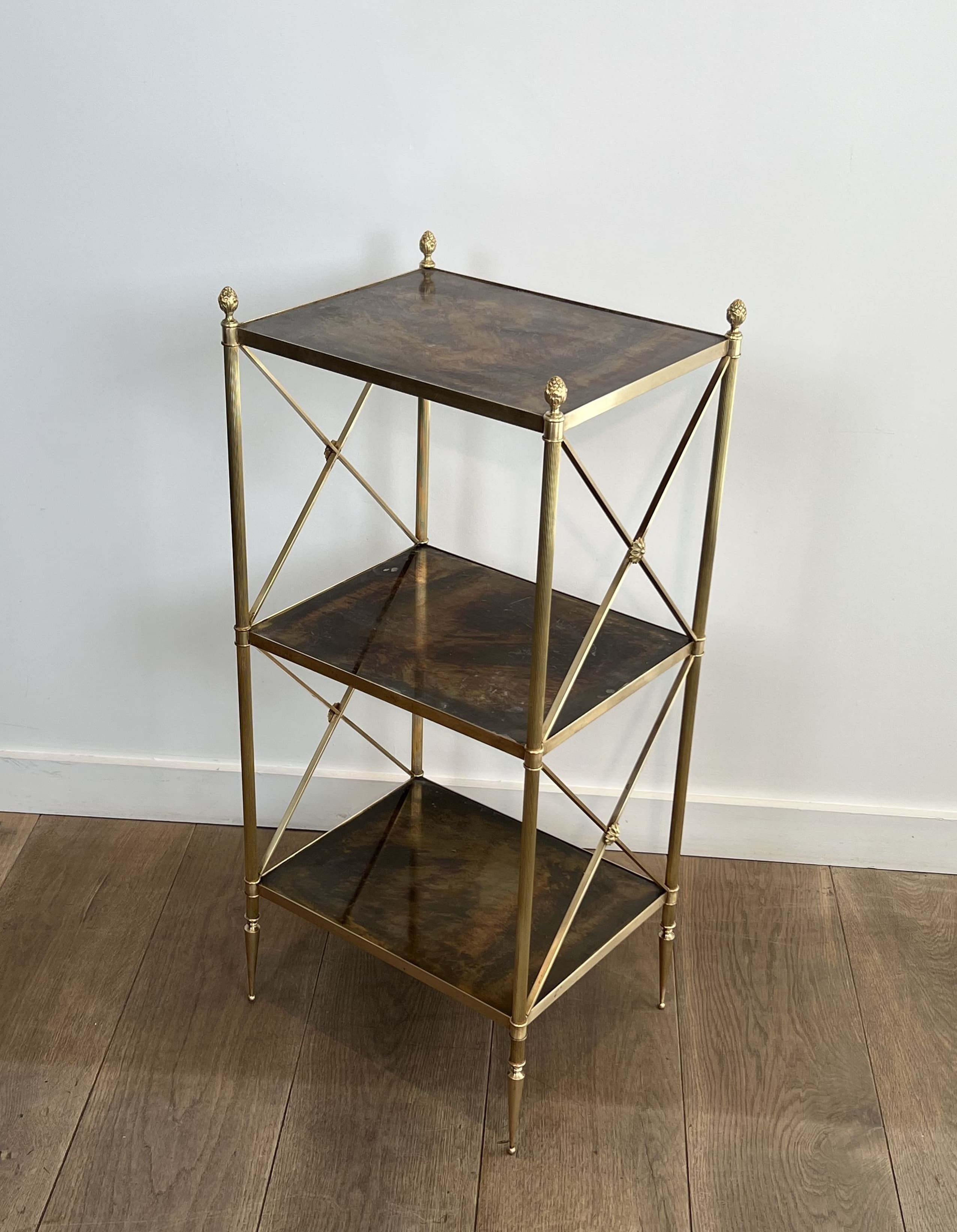 This elegant freestanding shelf is a characteristic example of mid-20th-century high-end Parisian occasional furniture. The structural design relies on four solid brass uprights detailed with fine fluting. These shafts terminate at the base in tapered feet and are crowned at the top with pinecone finials. The rigidity of the frame is ensured on the lateral and rear faces by X-shaped cross-stretchers, secured at their centers by small rosettes. The piece features three rectangular tiers holding eglomise glass plates. These display a rich mottled pattern in brown and ochre tones, finely imitating tortoiseshell or precious burl wood. The combination of the neoclassical brass structure (cross-stretchers, fluting) and the eglomise glass allows this piece to be formally attributed to Maison Jansen. Founded in Paris in 1880, Maison Jansen remained the absolute benchmark for international interior decoration for nearly a century. Under the direction of Stéphane Boudin, the house specialized in reinterpreting Directoire and Empire styles, designing highly refined 'mobilier volant' (small tables, shelves, serving carts) for a prestigious clientele, including embassies and high aristocracy. Standing 87 cm tall, this piece is in good overall condition. The brass displays a natural and even patina of use, while the three original eglomise glass plates remain intact. Both an architectural and functional piece, it will naturally serve as an end table, a small display shelf, or an elegant stand in a demanding interior.