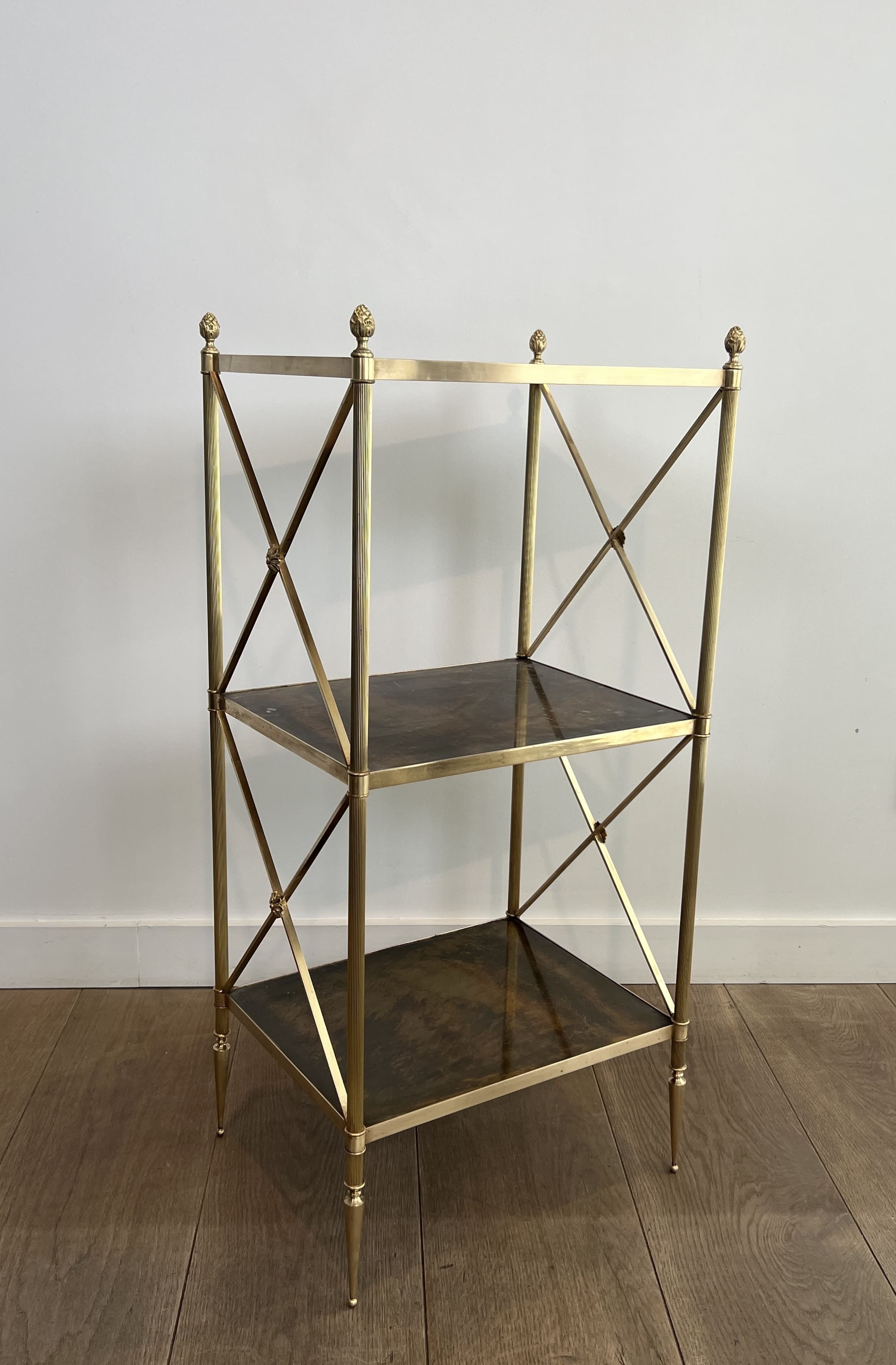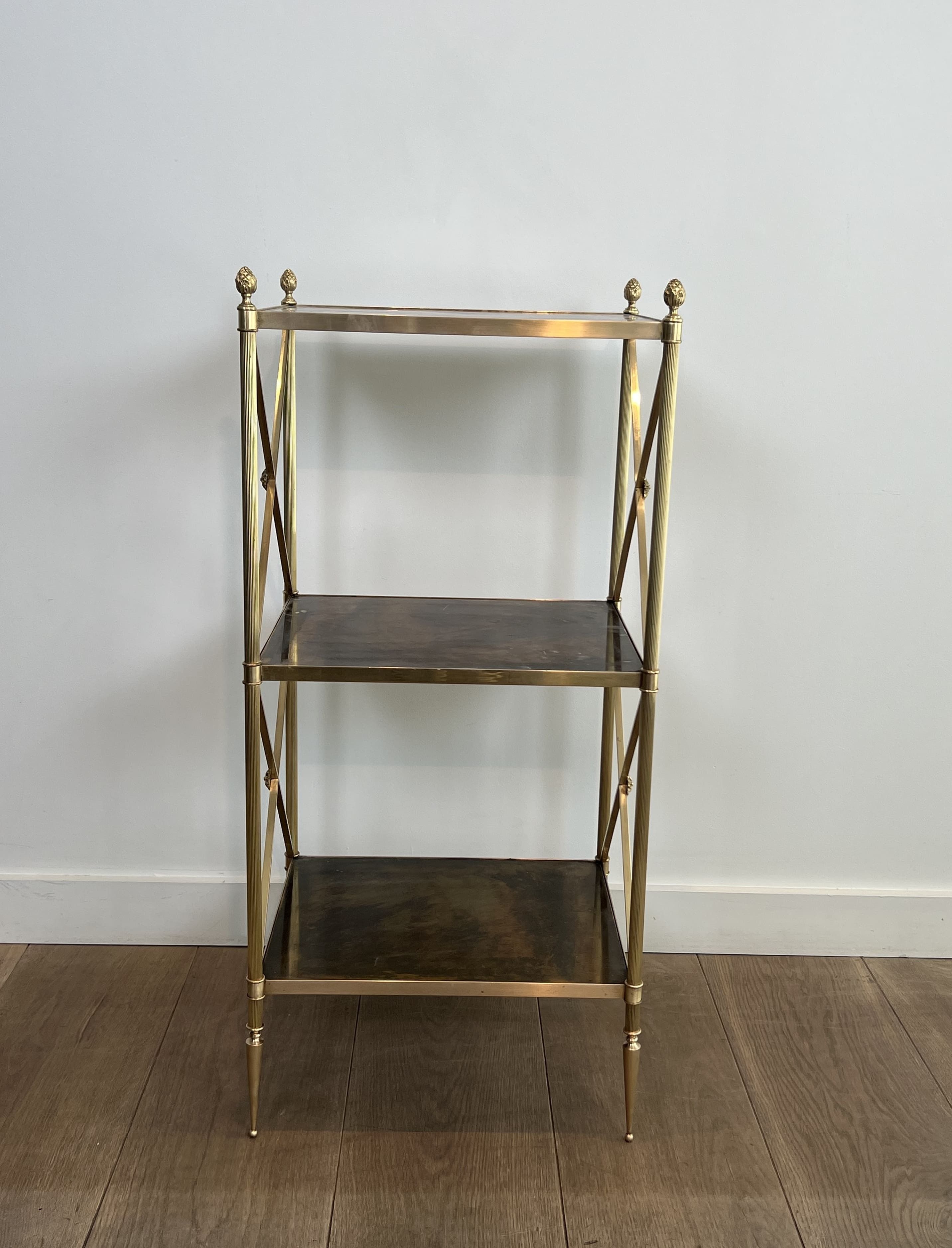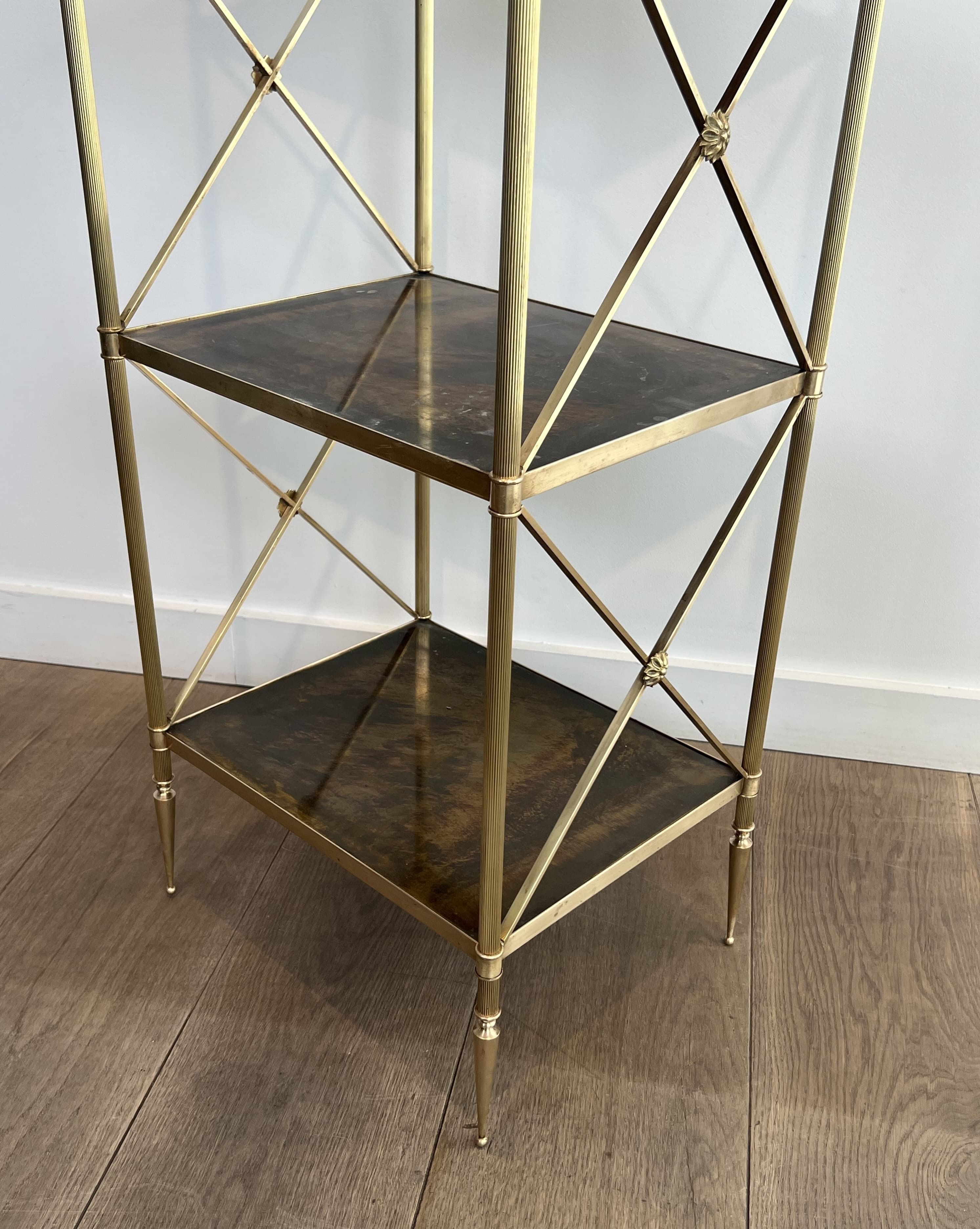 This elegant freestanding shelf is a characteristic example of mid-20th-century high-end Parisian occasional furniture. The structural design relies on four solid brass uprights detailed with fine fluting. These shafts terminate at the base in tapered feet and are crowned at the top with pinecone finials. The rigidity of the frame is ensured on the lateral and rear faces by X-shaped cross-stretchers, secured at their centers by small rosettes. The piece features three rectangular tiers holding eglomise glass plates. These display a rich mottled pattern in brown and ochre tones, finely imitating tortoiseshell or precious burl wood. The combination of the neoclassical brass structure (cross-stretchers, fluting) and the eglomise glass allows this piece to be formally attributed to Maison Jansen. Founded in Paris in 1880, Maison Jansen remained the absolute benchmark for international interior decoration for nearly a century. Under the direction of Stéphane Boudin, the house specialized in reinterpreting Directoire and Empire styles, designing highly refined 'mobilier volant' (small tables, shelves, serving carts) for a prestigious clientele, including embassies and high aristocracy. Standing 87 cm tall, this piece is in good overall condition. The brass displays a natural and even patina of use, while the three original eglomise glass plates remain intact. Both an architectural and functional piece, it will naturally serve as an end table, a small display shelf, or an elegant stand in a demanding interior.