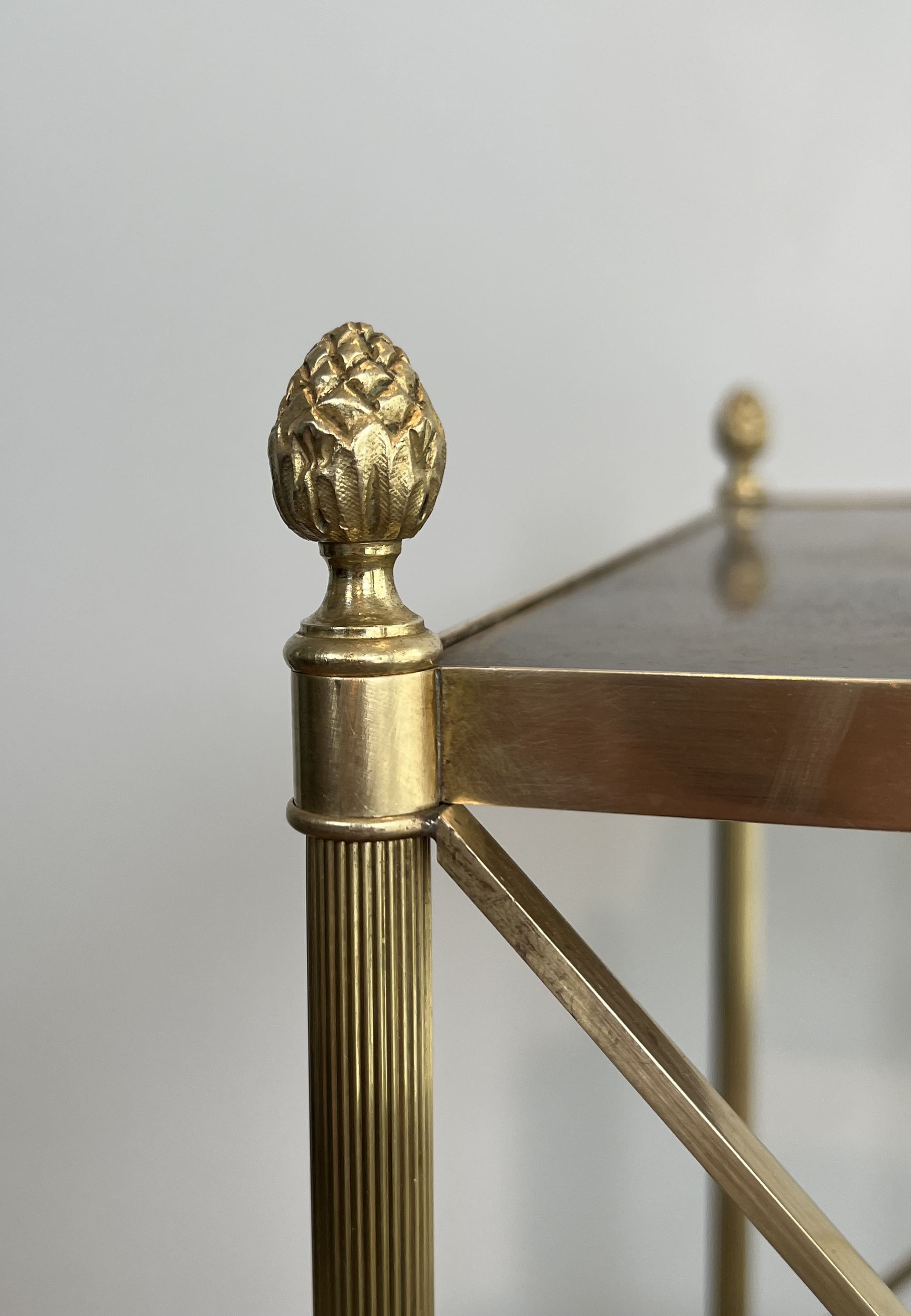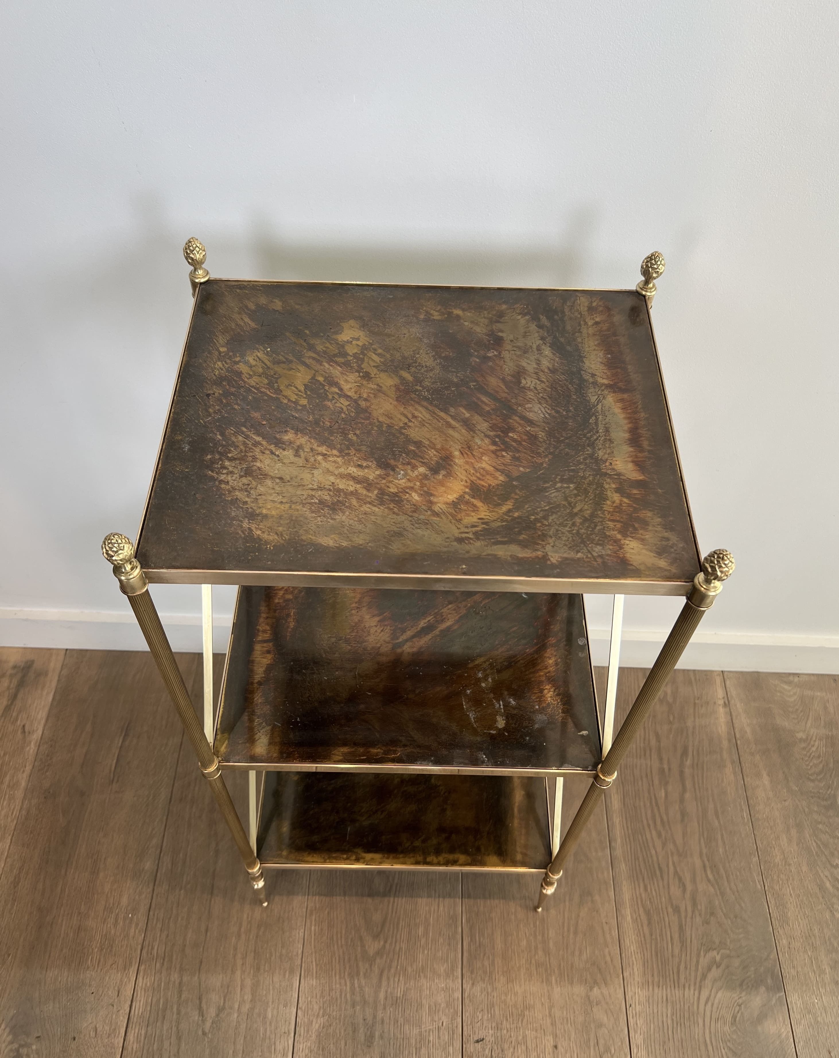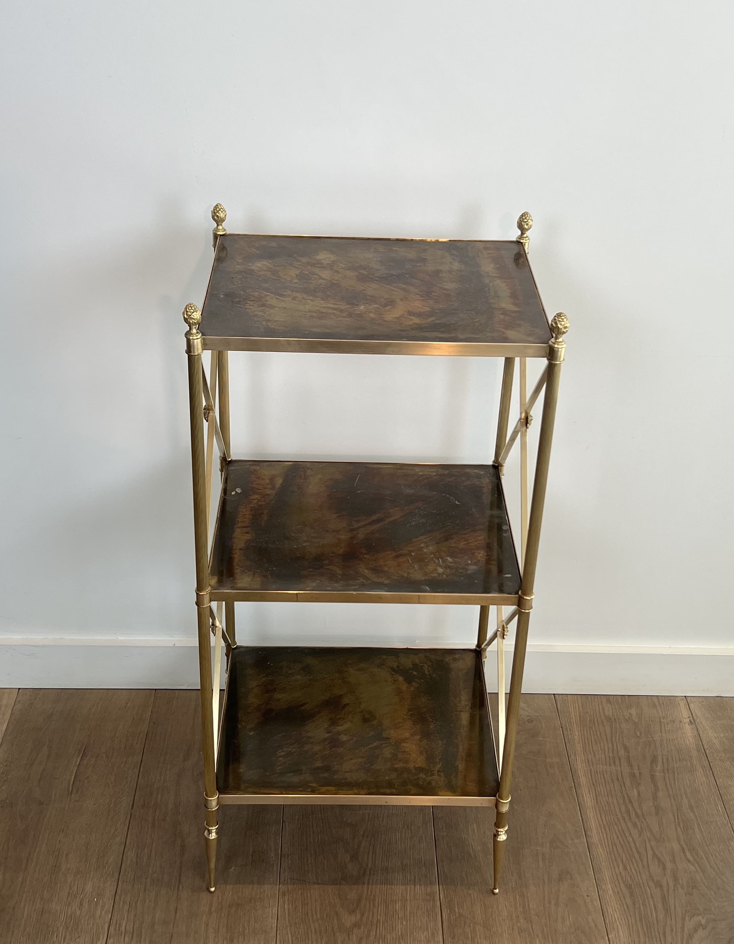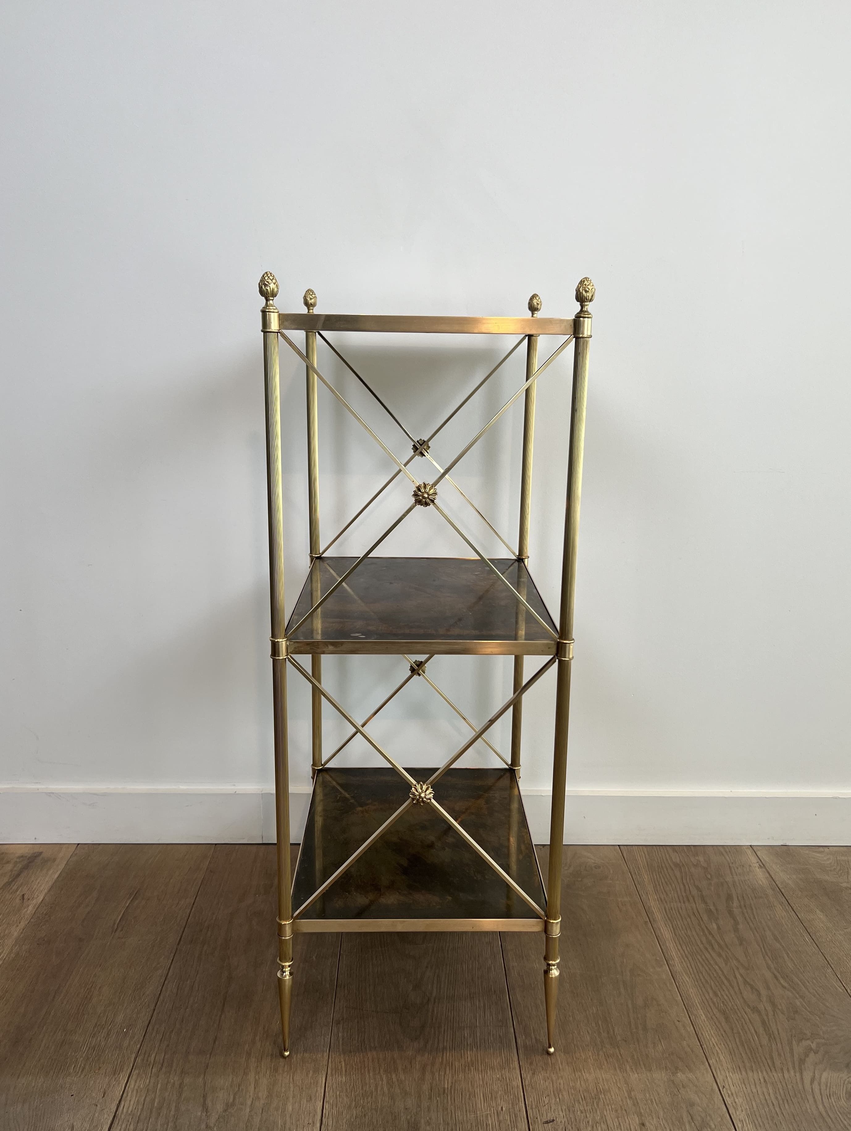 This elegant freestanding shelf is a characteristic example of mid-20th-century high-end Parisian occasional furniture. The structural design relies on four solid brass uprights detailed with fine fluting. These shafts terminate at the base in tapered feet and are crowned at the top with pinecone finials. The rigidity of the frame is ensured on the lateral and rear faces by X-shaped cross-stretchers, secured at their centers by small rosettes. The piece features three rectangular tiers holding eglomise glass plates. These display a rich mottled pattern in brown and ochre tones, finely imitating tortoiseshell or precious burl wood. The combination of the neoclassical brass structure (cross-stretchers, fluting) and the eglomise glass allows this piece to be formally attributed to Maison Jansen. Founded in Paris in 1880, Maison Jansen remained the absolute benchmark for international interior decoration for nearly a century. Under the direction of Stéphane Boudin, the house specialized in reinterpreting Directoire and Empire styles, designing highly refined 'mobilier volant' (small tables, shelves, serving carts) for a prestigious clientele, including embassies and high aristocracy. Standing 87 cm tall, this piece is in good overall condition. The brass displays a natural and even patina of use, while the three original eglomise glass plates remain intact. Both an architectural and functional piece, it will naturally serve as an end table, a small display shelf, or an elegant stand in a demanding interior.