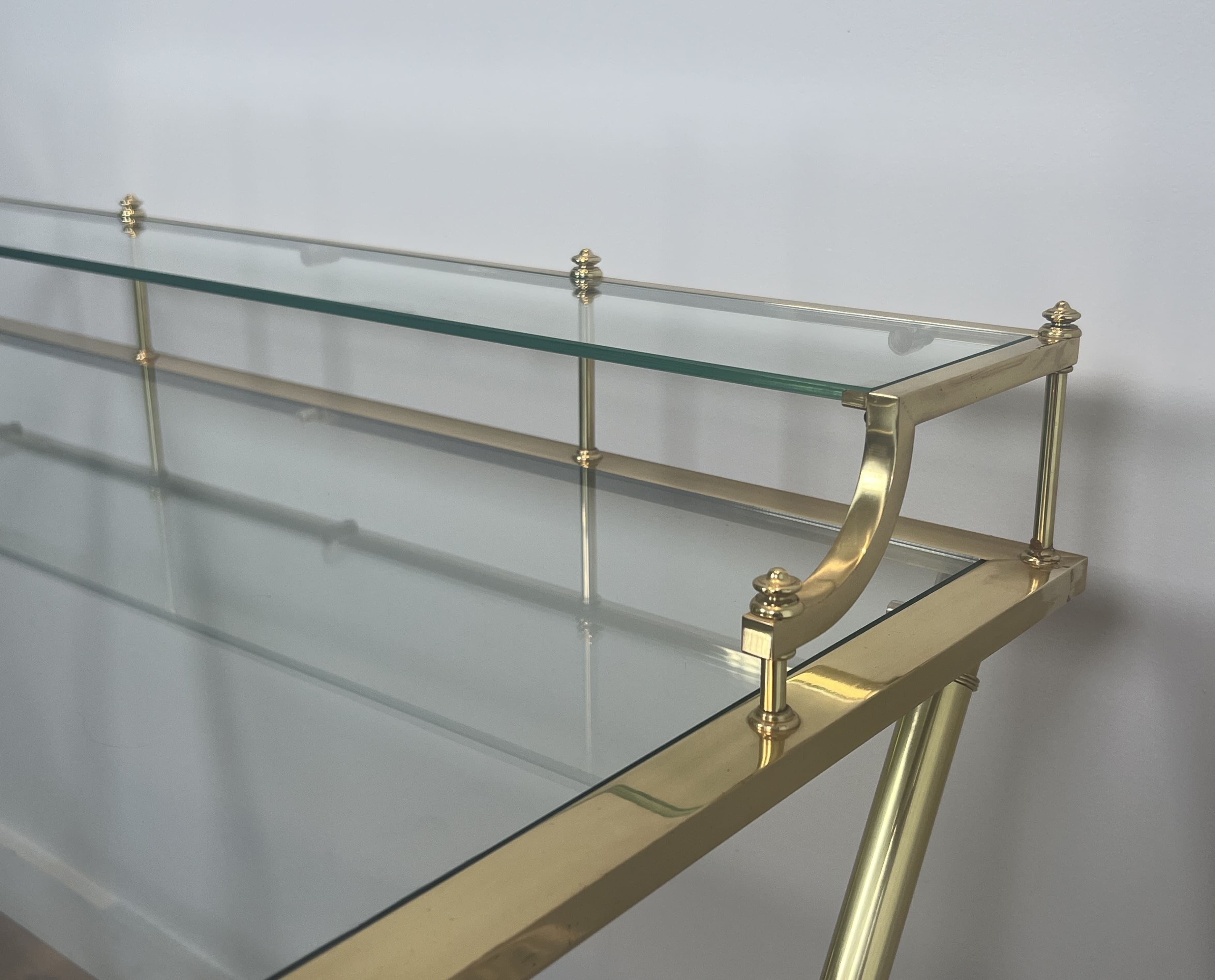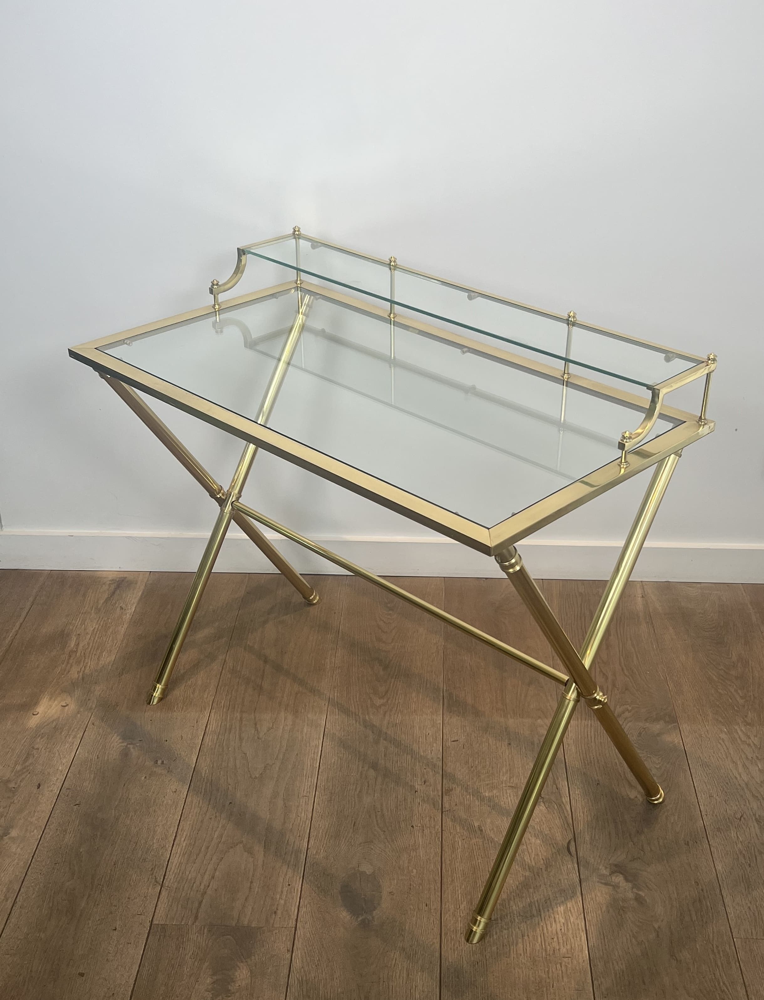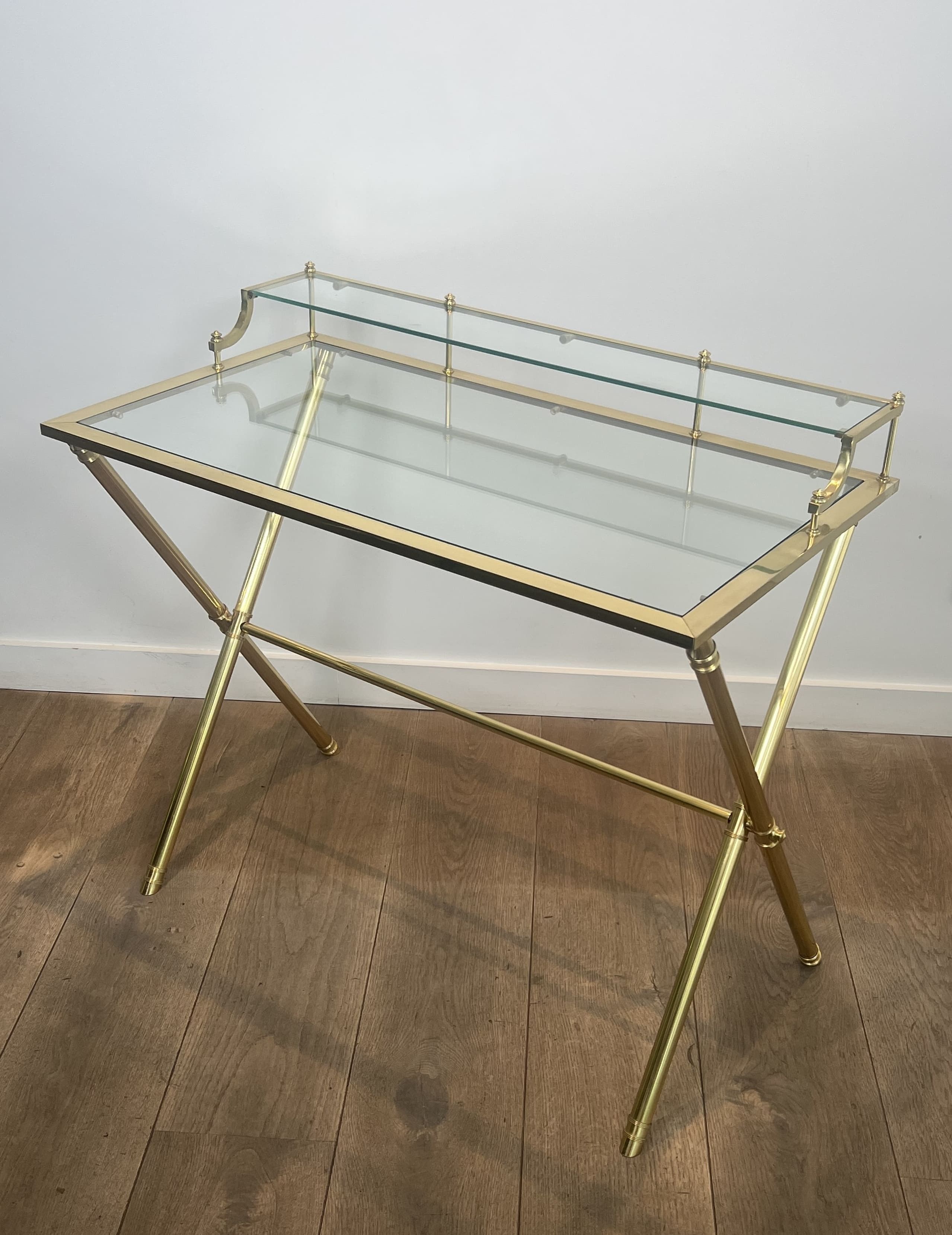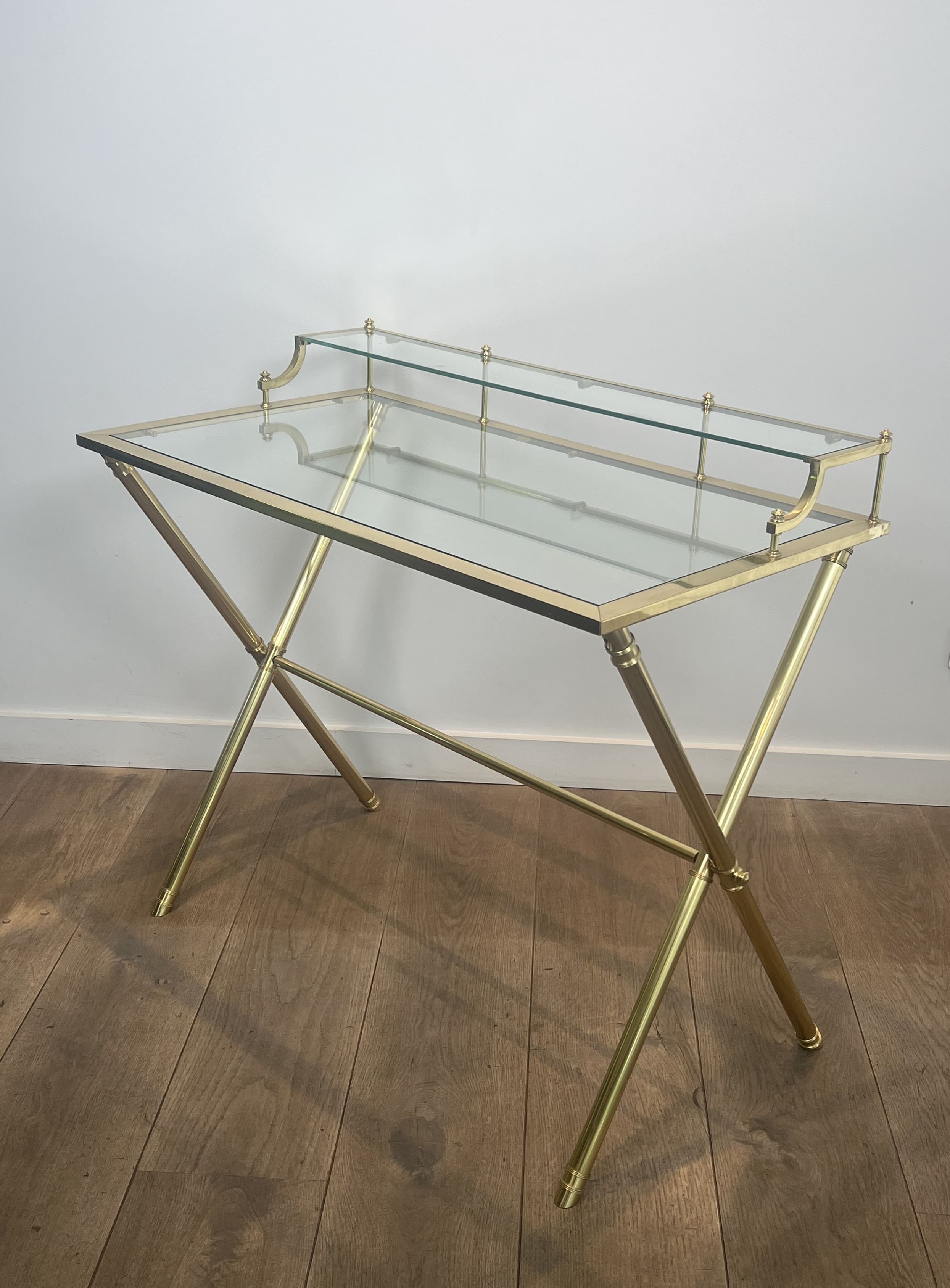 This desk illustrates the great mastery of tubular brass furniture in mid-20th-century French high-end decoration. The structural design relies on a crossed 'X' base (curule inspiration), stiffened by a large central tubular stretcher. The junction points of the structure are highlighted by elegant molded brass rings. The piece offers a rectangular clear glass writing surface, topped at the rear by a gradin (a raised shelf). The latter is supported by slender small columns finished with finials, and flanked laterally by two curved brackets, providing an airy and sophisticated finish to the piece. The rigor of this geometry, drawing directly from the neoclassical and Directoire repertoires while refining it through the use of glass, allows this furniture to be linked to the productions of Maison Jansen. Founded in Paris in 1880, this prestigious firm established itself in the 20th century, under the direction of Stéphane Boudin, as the global benchmark for luxury interior design (furnishing high aristocracy and major embassies). The Parisian house made this type of brass and glass occasional furniture an unmistakable signature to satisfy the demand for bright, sophisticated interiors affiliated with the Hollywood Regency movement. Good overall condition. The solid brass structure displays a natural and even patina of use, with minute traces of oxidation inherent to its age. The two glass plates are intact. Thanks to its transparency and fine lines, this desk will anchor a workspace, a boudoir, or a bedroom without visually weighing down the space.