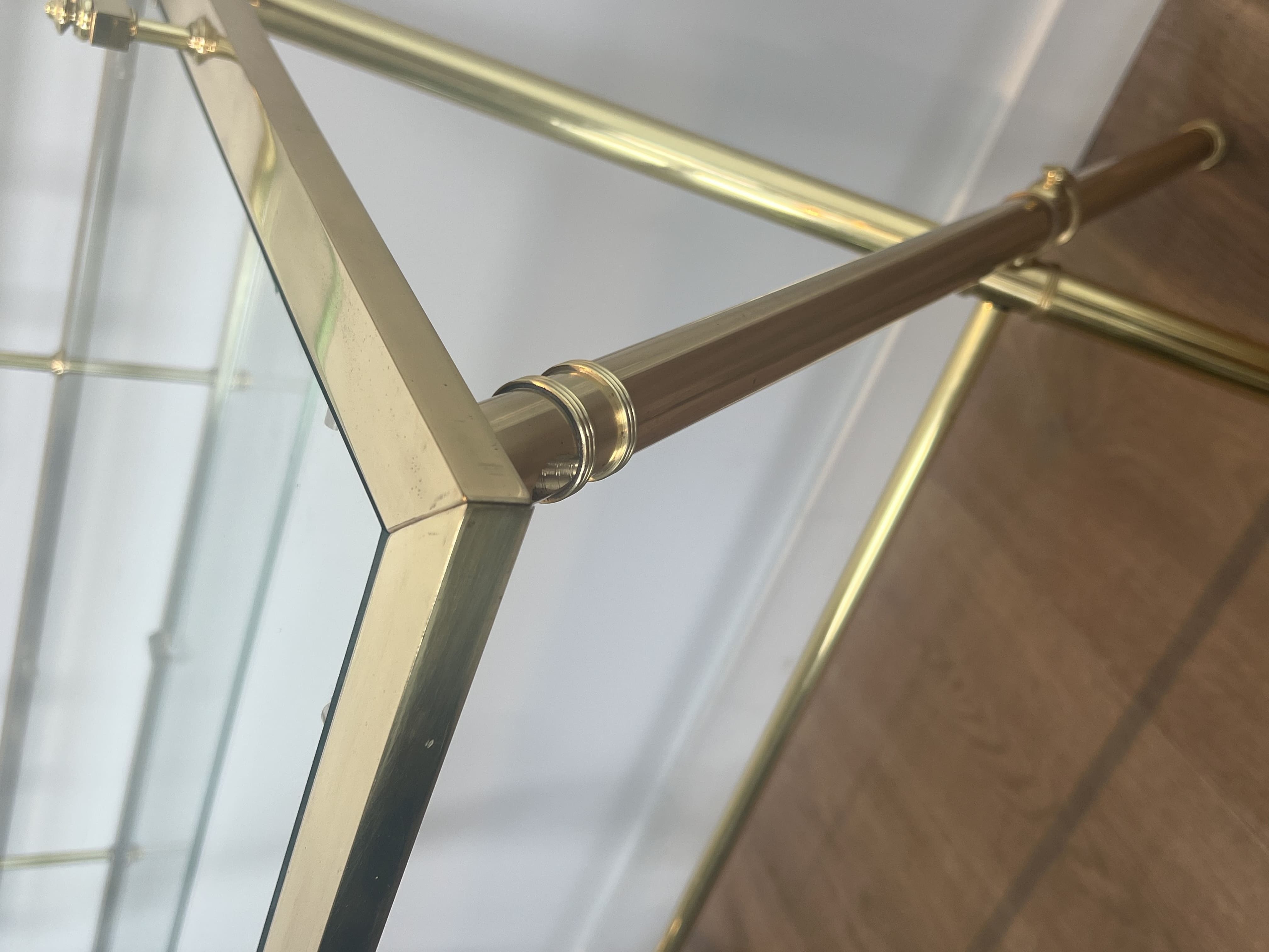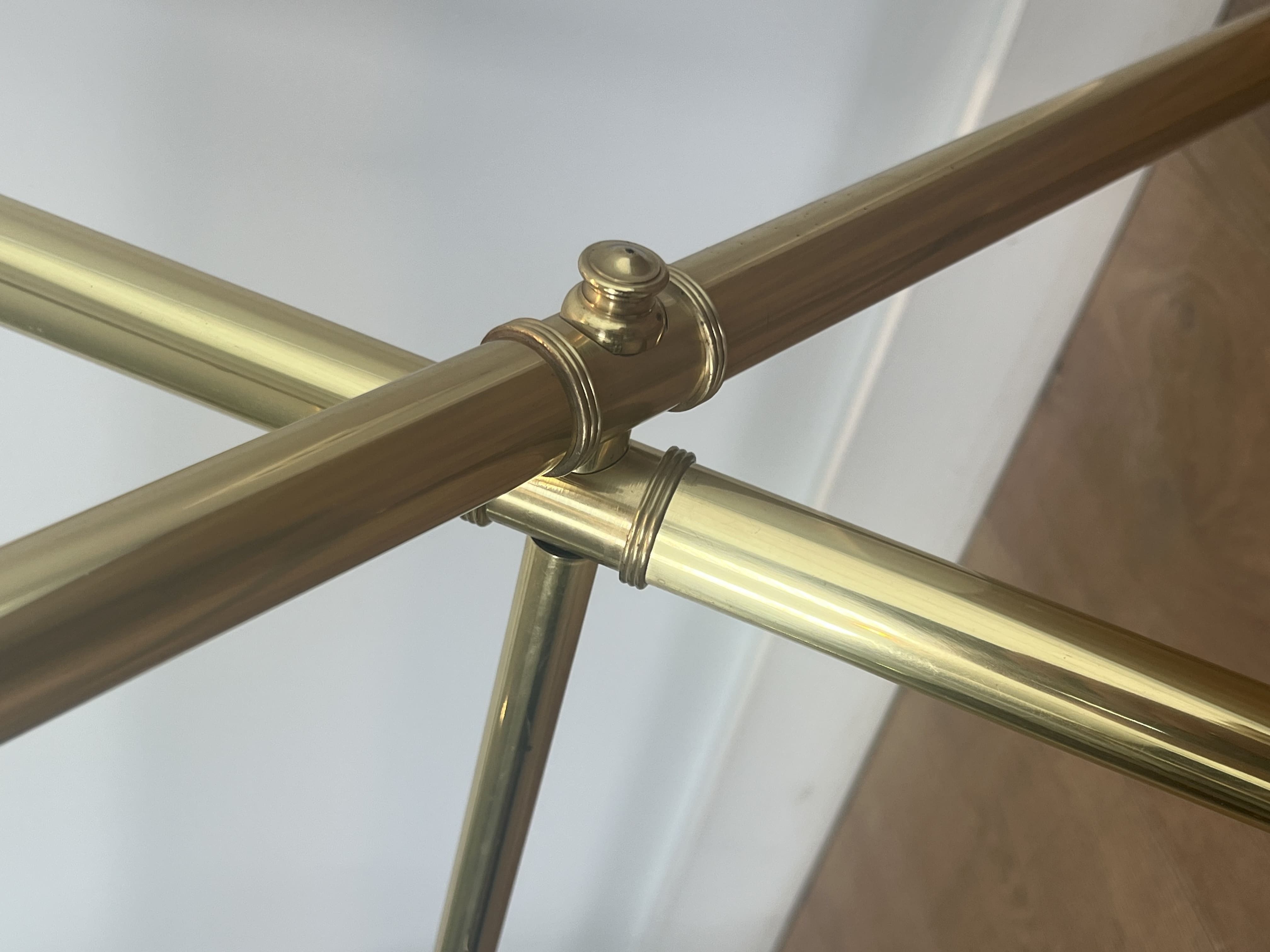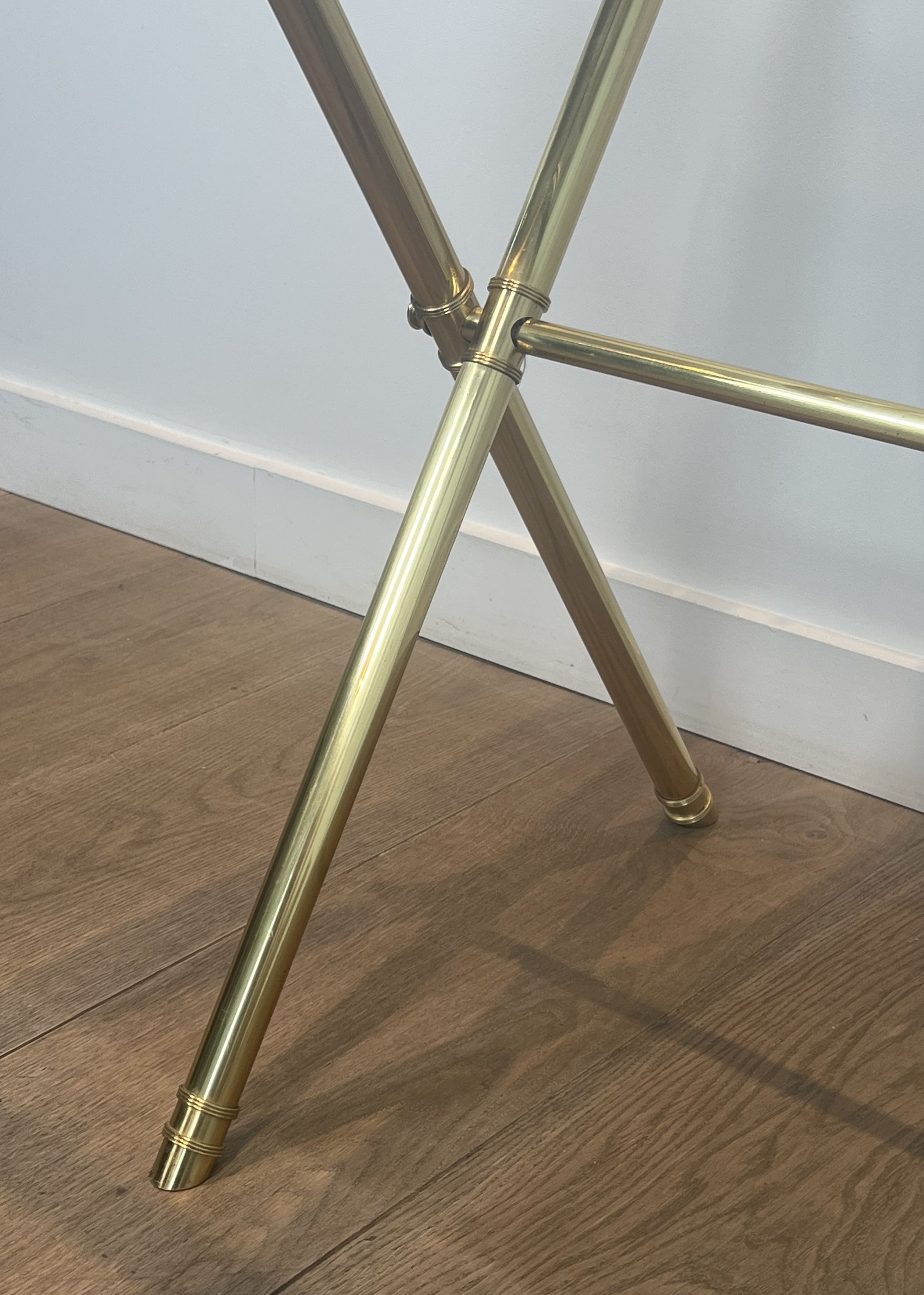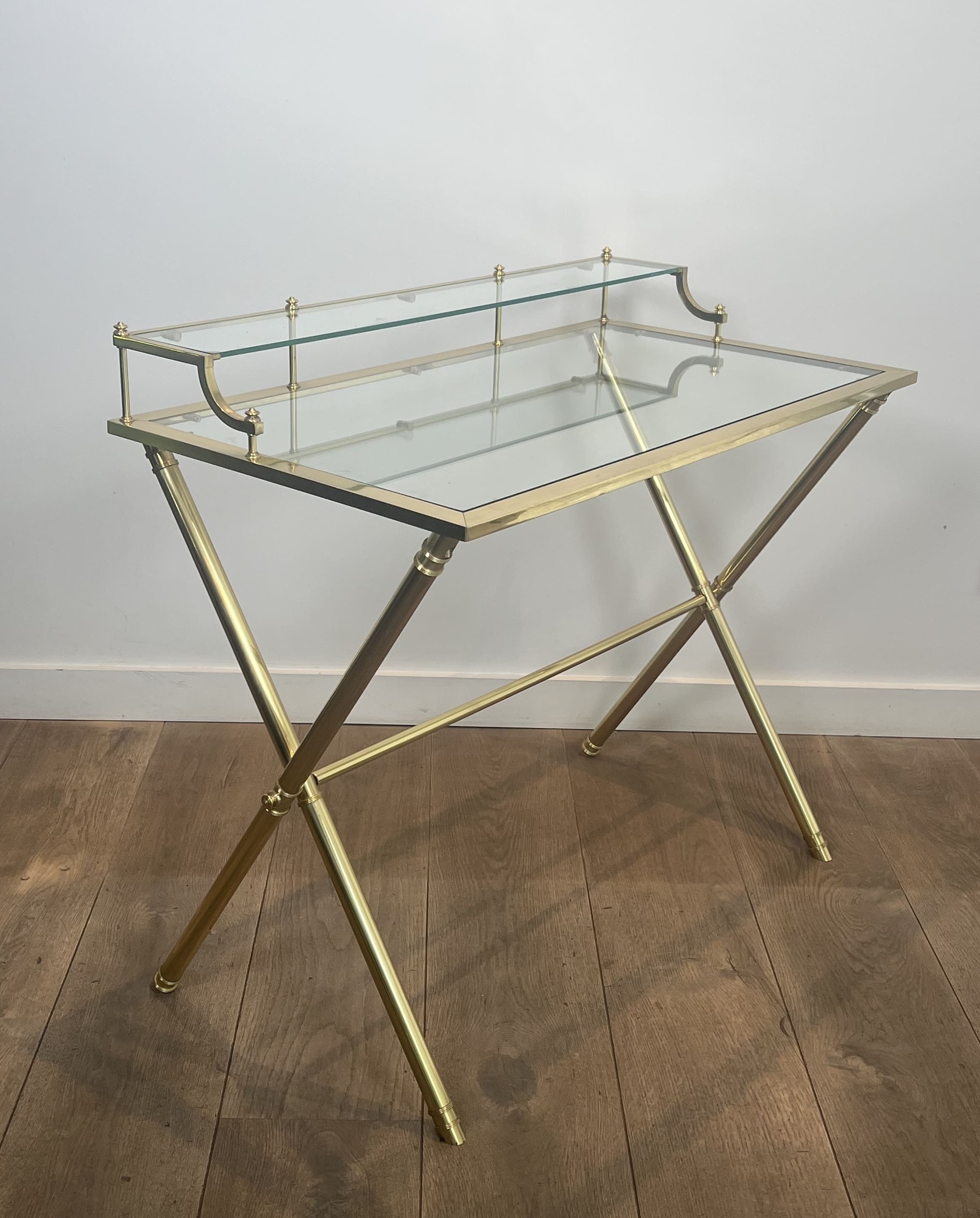 This desk illustrates the great mastery of tubular brass furniture in mid-20th-century French high-end decoration. The structural design relies on a crossed 'X' base (curule inspiration), stiffened by a large central tubular stretcher. The junction points of the structure are highlighted by elegant molded brass rings. The piece offers a rectangular clear glass writing surface, topped at the rear by a gradin (a raised shelf). The latter is supported by slender small columns finished with finials, and flanked laterally by two curved brackets, providing an airy and sophisticated finish to the piece. The rigor of this geometry, drawing directly from the neoclassical and Directoire repertoires while refining it through the use of glass, allows this furniture to be linked to the productions of Maison Jansen. Founded in Paris in 1880, this prestigious firm established itself in the 20th century, under the direction of Stéphane Boudin, as the global benchmark for luxury interior design (furnishing high aristocracy and major embassies). The Parisian house made this type of brass and glass occasional furniture an unmistakable signature to satisfy the demand for bright, sophisticated interiors affiliated with the Hollywood Regency movement. Good overall condition. The solid brass structure displays a natural and even patina of use, with minute traces of oxidation inherent to its age. The two glass plates are intact. Thanks to its transparency and fine lines, this desk will anchor a workspace, a boudoir, or a bedroom without visually weighing down the space.