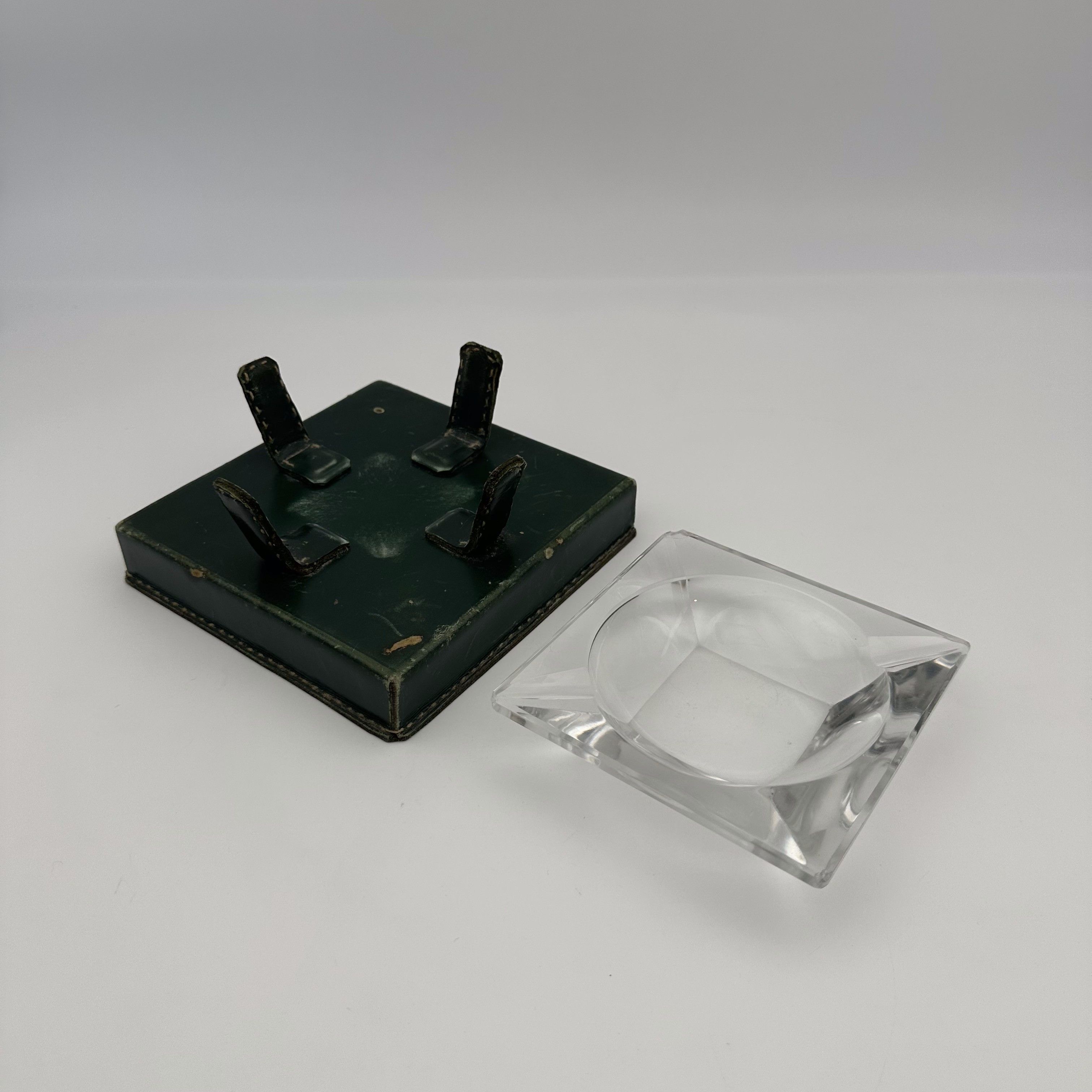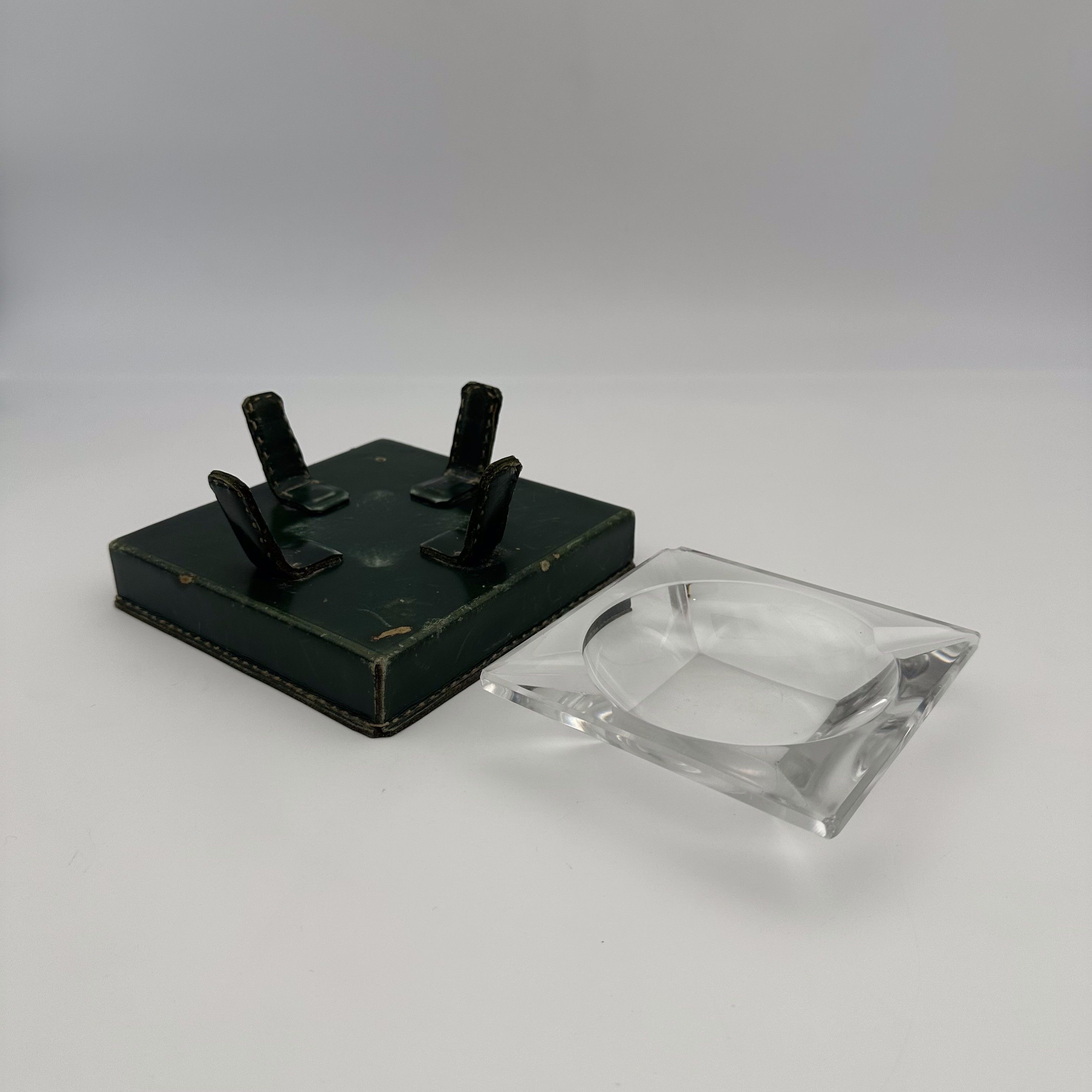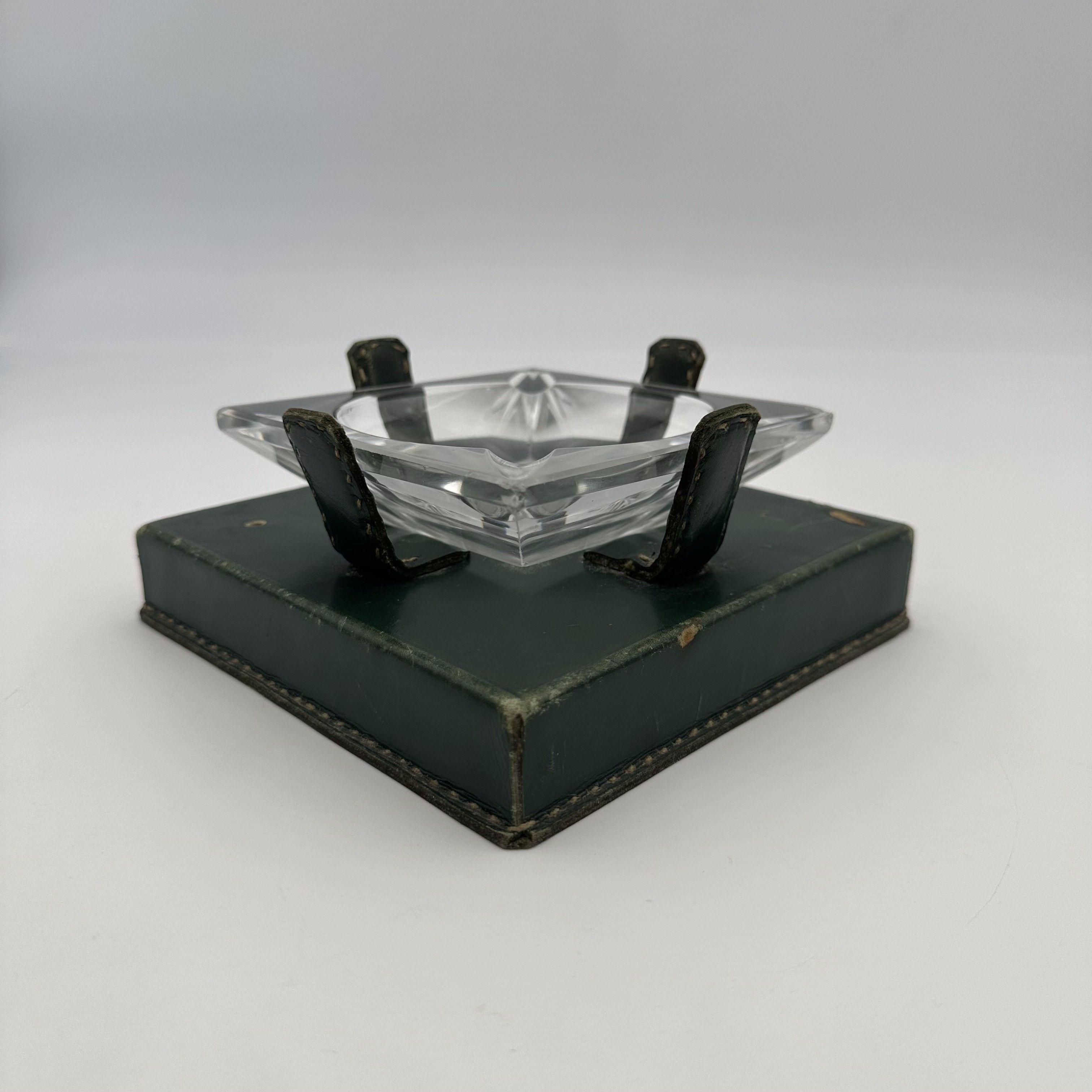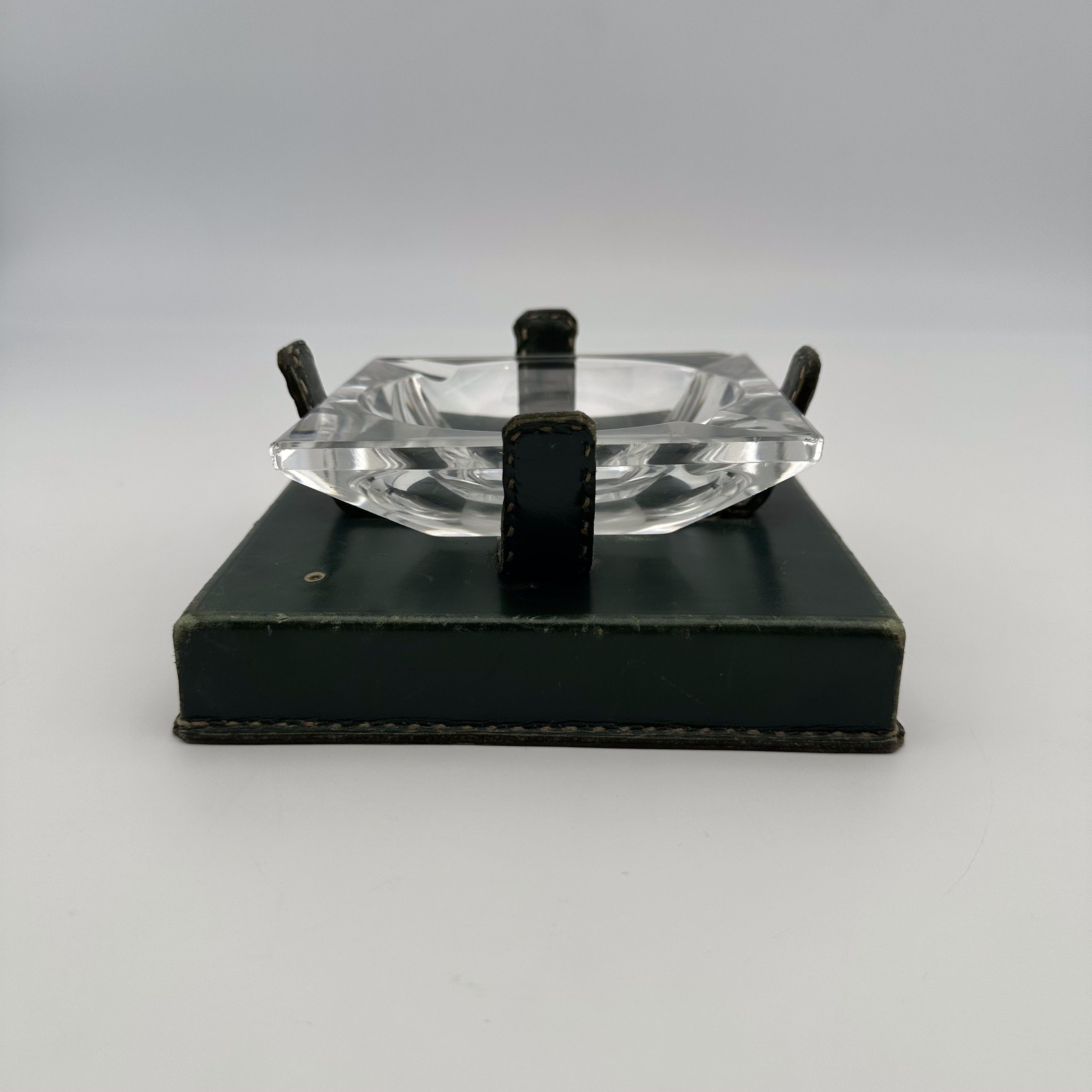 This superb desktop ashtray embodies all the elegance and refinement of 1950s French design. Strongly inspired by the work of the great decorator Jacques Adnet and the equestrian aesthetic of the Hermès house, this object brilliantly combines the luxury of noble materials with modernist rigor. With its 15 cm square base, the object reveals a magnificent contrast of textures. The base and the four metal supports are entirely wrapped in an intense forest green leather, delicately highlighted by 'saddle' stitching. This warm structure suspends a heavy, transparent crystal receptacle with beveled geometric lines, creating a superb interplay of transparency and reflections. Offered in its authentic, untouched condition, this beautiful curiosity object shows signs of use, rubbing, and slight leather loss. This patina of time, inherent in antique desktop objects that have seen genuine use, guarantees its absolute authenticity and gives it an undeniable vintage charm. A very 'Gentleman's Club' accessory, ideal for enhancing a walnut desk or a coffee table.