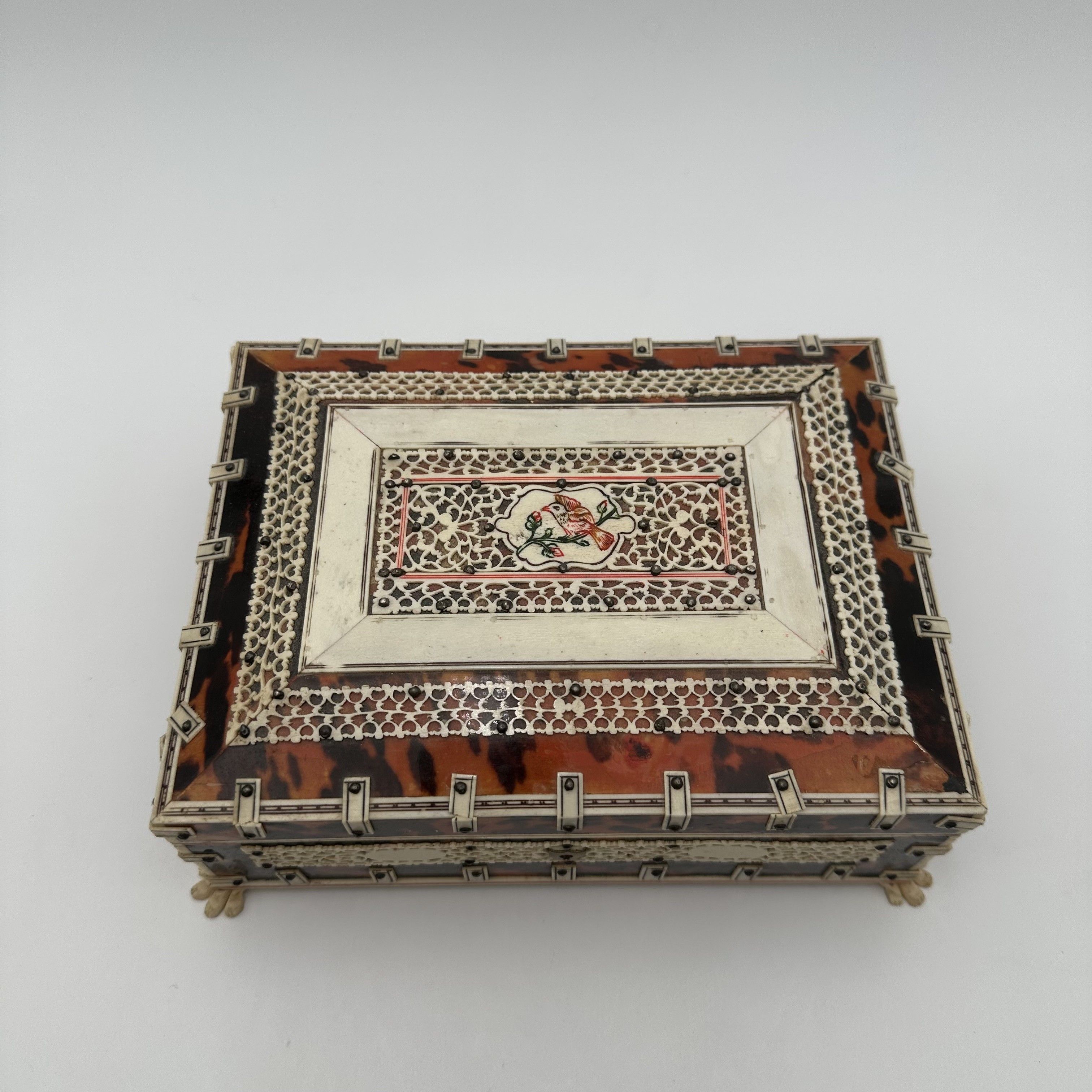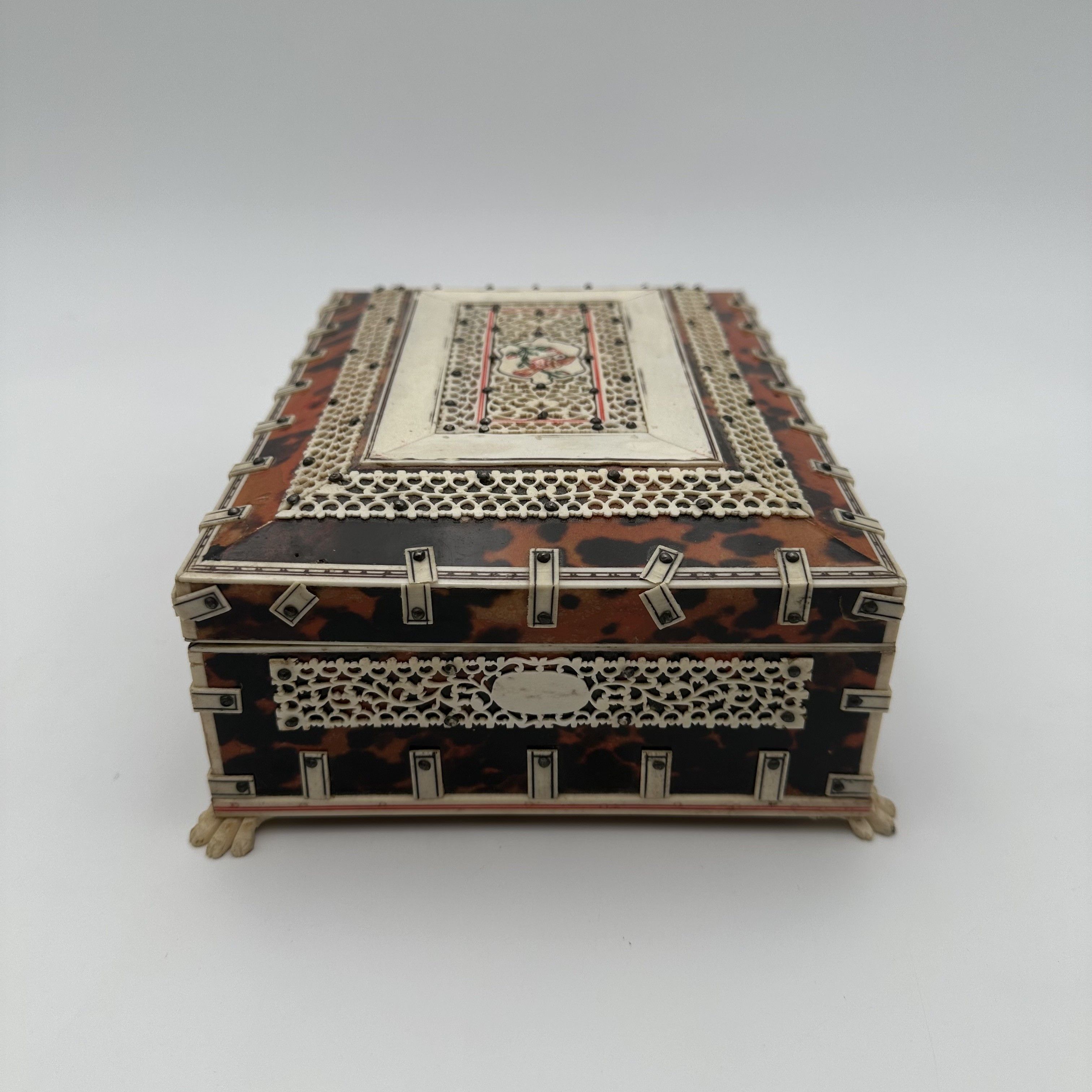 This sumptuous jewelry casket perfectly illustrates the refinement and excellence of 19th-century Anglo-Indian craftsmanship. A renowned specialty of the artisans from the Vizagapatam region (on the Coromandel Coast of India), these luxurious veneered objects were created during the Victorian era to appeal to the aristocracy and wealthy merchants of the British East India Company. Today, they represent the pinnacle of colonial decorative arts and are highly sought after by collectors. The object, featuring very elegant proportions (15.5 x 20.5 cm and 8 cm high) and resting on four charming small carved lion paw feet, reveals a striking contrast of materials. The wooden core of the casket is covered in a rich veneer of genuine tortoiseshell, whose amber and dark brown hues glow under the light. This dark background masterfully highlights an exceptional overlay of bone and ivory. The white plaques are cut and pierced into a delicate lace of floral and geometric fretwork, then meticulously secured by tiny black pins, typical of this specific production. The lid is further enhanced by a richly decorated central medallion. Offered in good antique condition for its age, this casket—over a century and a half old—shows minor expected wear and tiny losses or slight lifting, inherent to the organic nature and great fragility of tortoiseshell and bone.