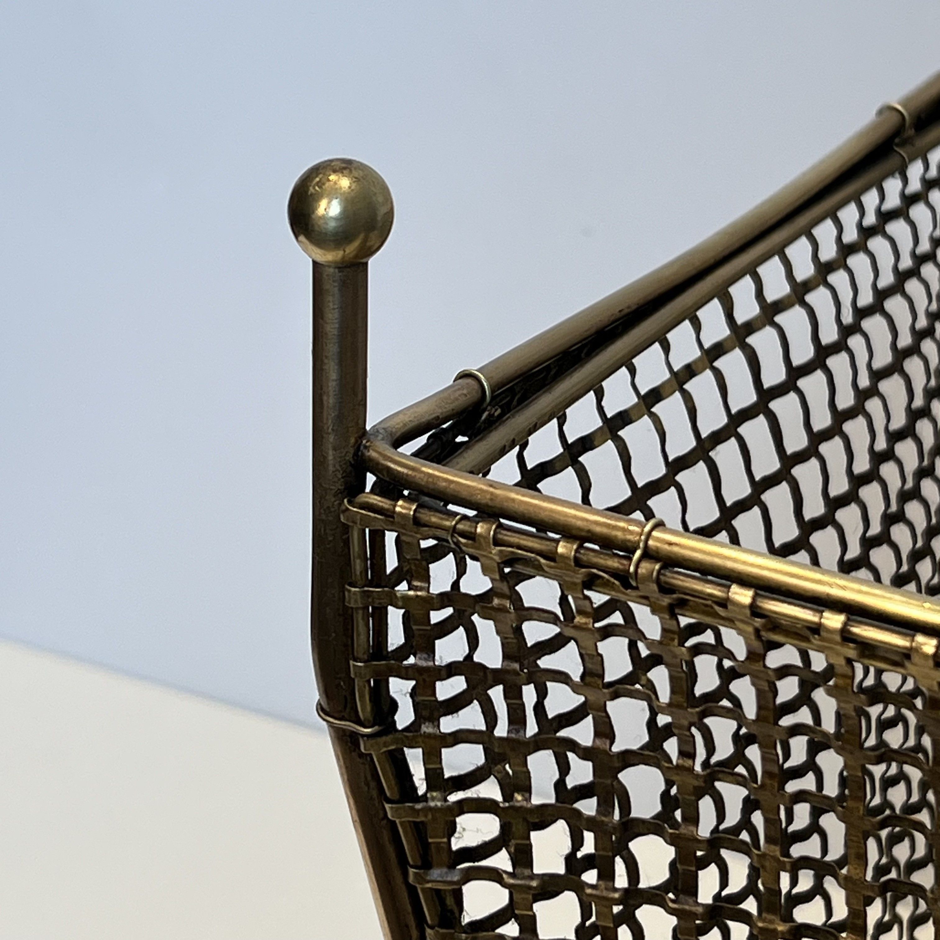This wastepaper basket is a characteristic example of high-end mid-20th-century office accessories. The structural design adopts a quadrangular shape that flares upwards. The four sides, as well as the base, consist of meticulously interwoven solid brass lattice, mimicking basketry techniques but executed in metal. The structure is supported by four tubular corner uprights that terminate at the base in small splayed feet for stability, and at the top with solid spherical finials. During the 1950s, brass became the material of choice for European interior decorators (particularly in Italy and Austria, following the style of Carl Auböck) for creating small metalwork items. The use of openwork lattice visually lightens the object while maintaining the nobility and golden shine of the metal. These pieces were intended to furnish executive offices or affluent interiors associated with the Hollywood Regency movement. Good structural condition. The brass shows natural oxidation and an even patina of use, guaranteeing its age. No major deformation of the weaving is noted. In addition to its primary function next to a desk, this object can be elegantly repurposed as a magazine rack or to hold a large planter in a classic or modernist interior.