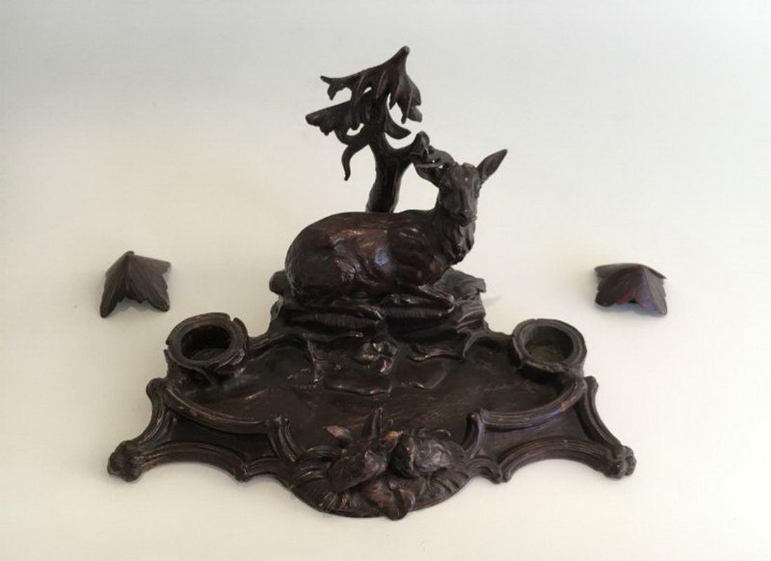 Black forest carved wood inkwellBlack forest carved wood inkwell. Deer and birds in the forest. 19th centuryRequest priceDimensionsWidth13.78 inch35 cmDepth8.66 inch22 cmHeight8.86 inch22.5 cmInformationProduct codeAni-56