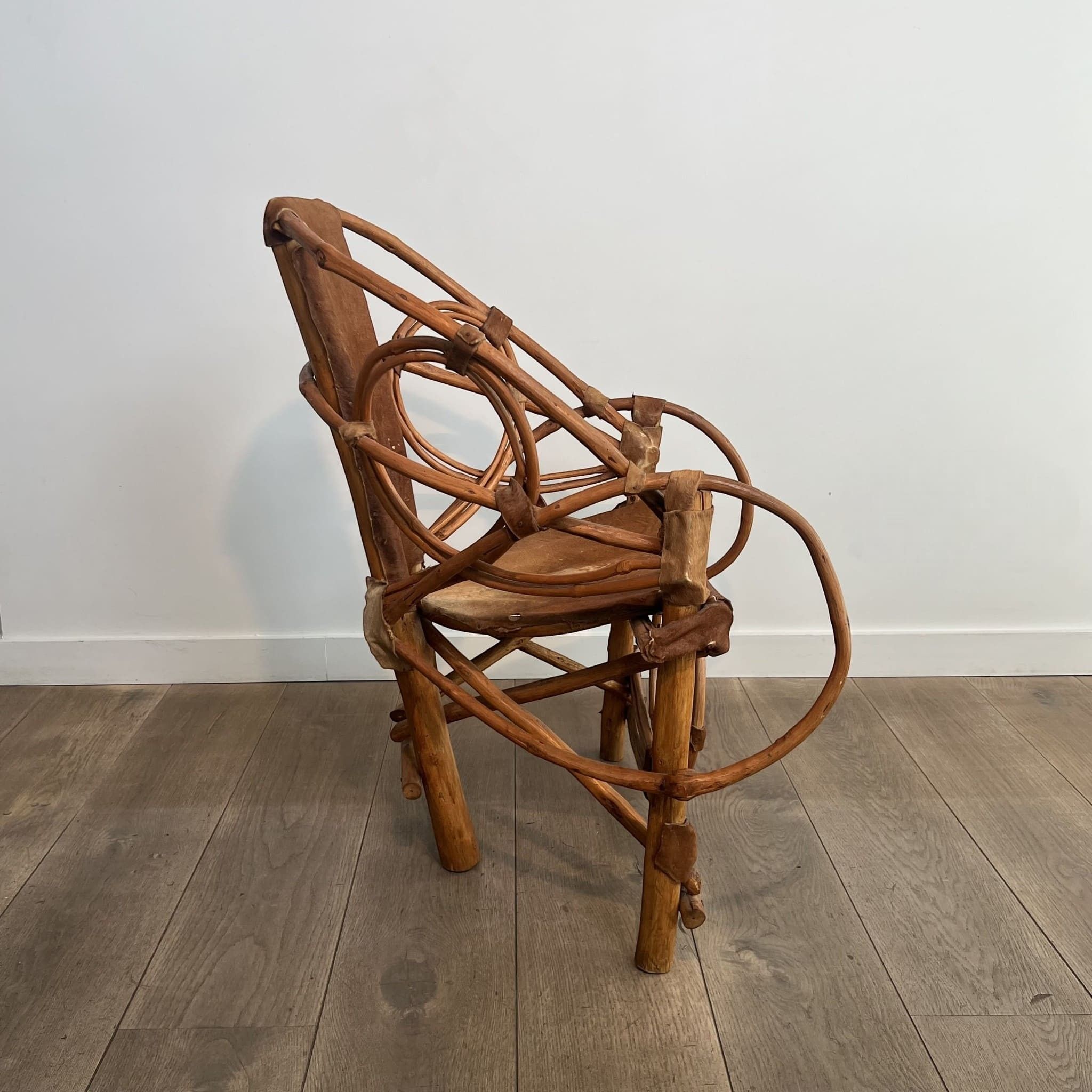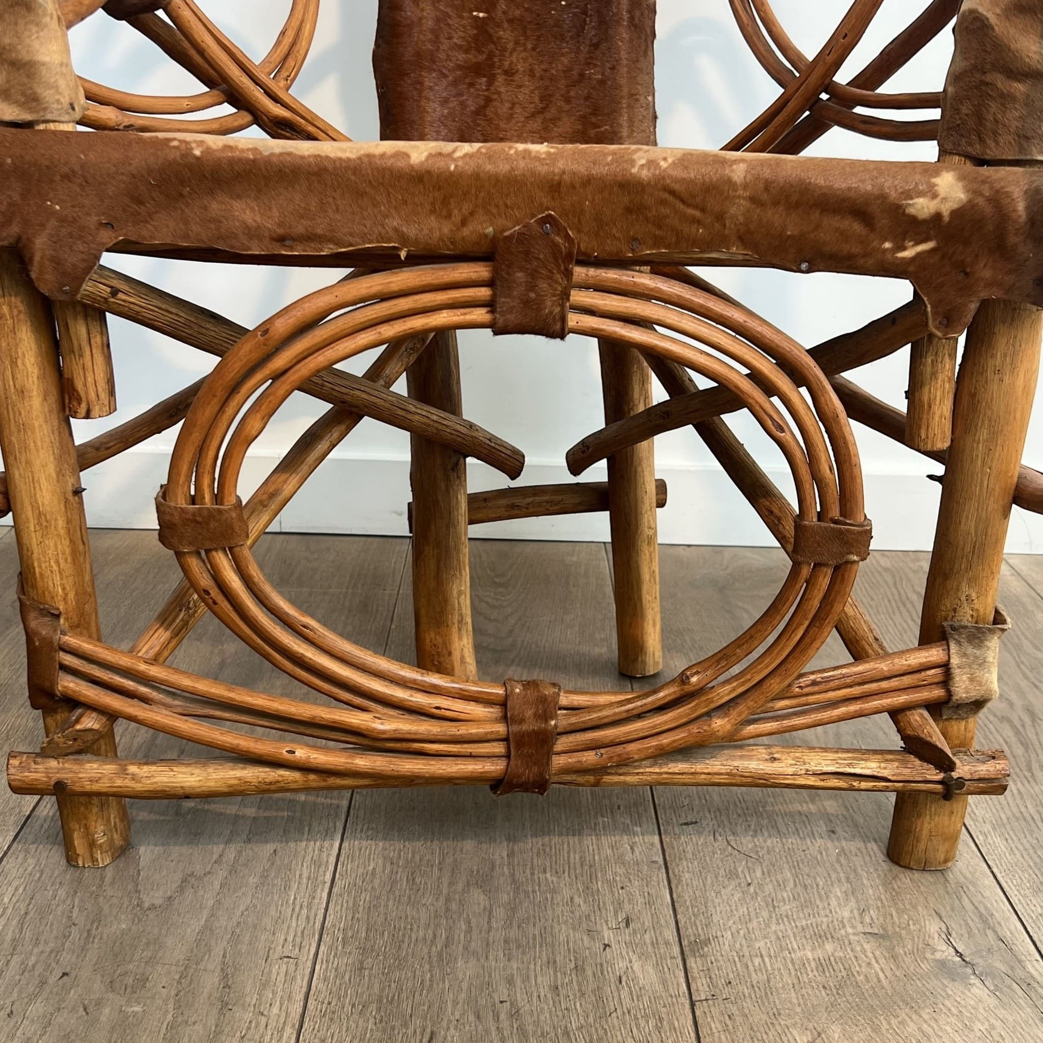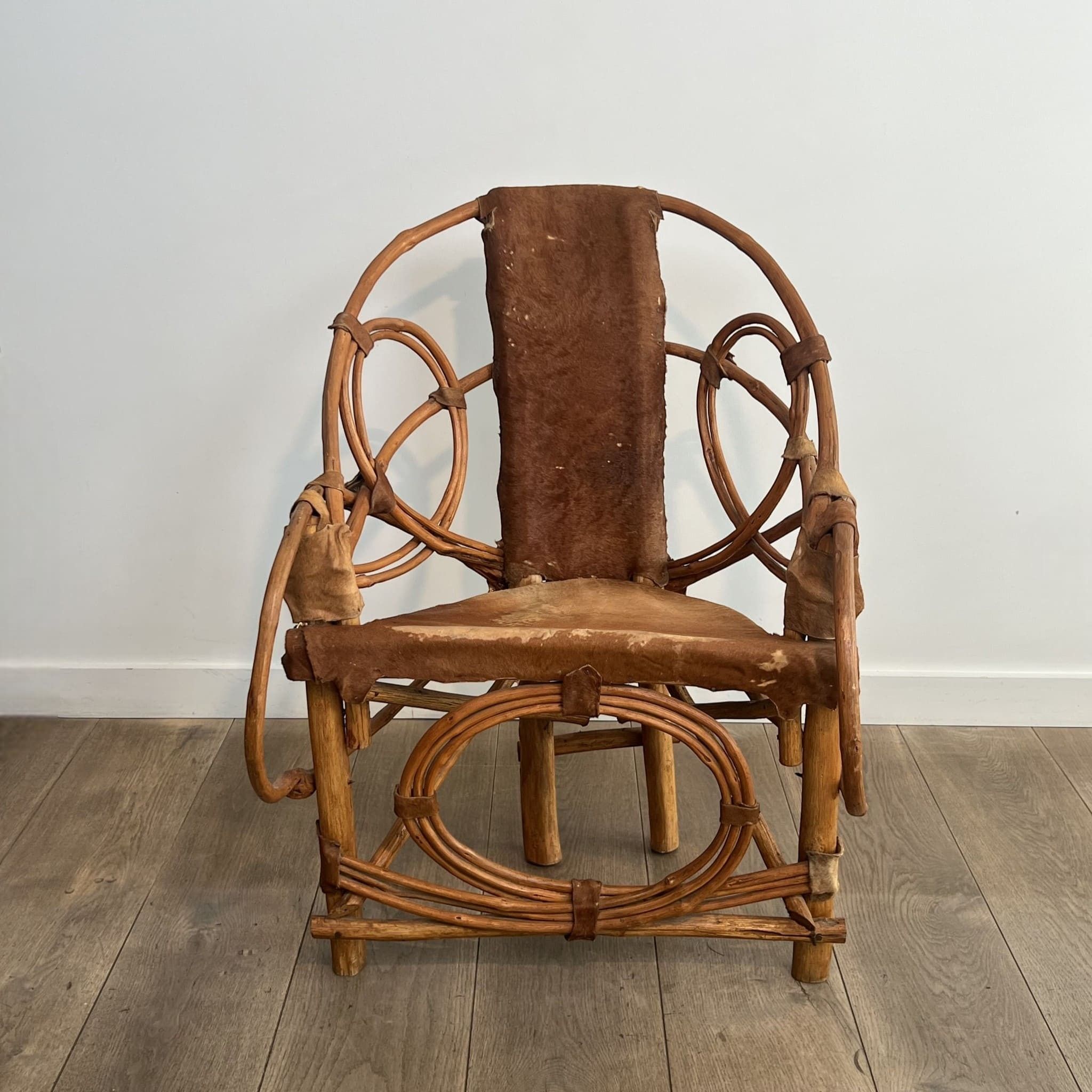 This armchair illustrates the sculptural and organic approach of Italian furniture in the second half of the 20th century. The structural design relies on a frame of thick rattan poles. The main uprights extend to form the armrests and backrest in a continuous fluid movement. The architecture is punctuated on the lateral sides and front apron by imposing circular volutes. The mechanical joints are not hidden but aesthetically embraced through sturdy leather strap lashings. The trapezoidal seat and the vertical band forming the backrest are upholstered in natural cowhide, stretched and tacked directly onto the frame. During the 1960s and 1970s, Italian design heavily explored vernacular materials (rattan, wicker, raw leather). The goal was to marry bold modernist geometry with raw, natural materials, giving rise to the 'Safari chic' trend or organic modernism. Used condition with beautiful patina of time. The rattan structure is sound and stable. The cowhide upholstery shows normal signs of use that reinforce the 'wabi-sabi' and brutalist character of the piece.