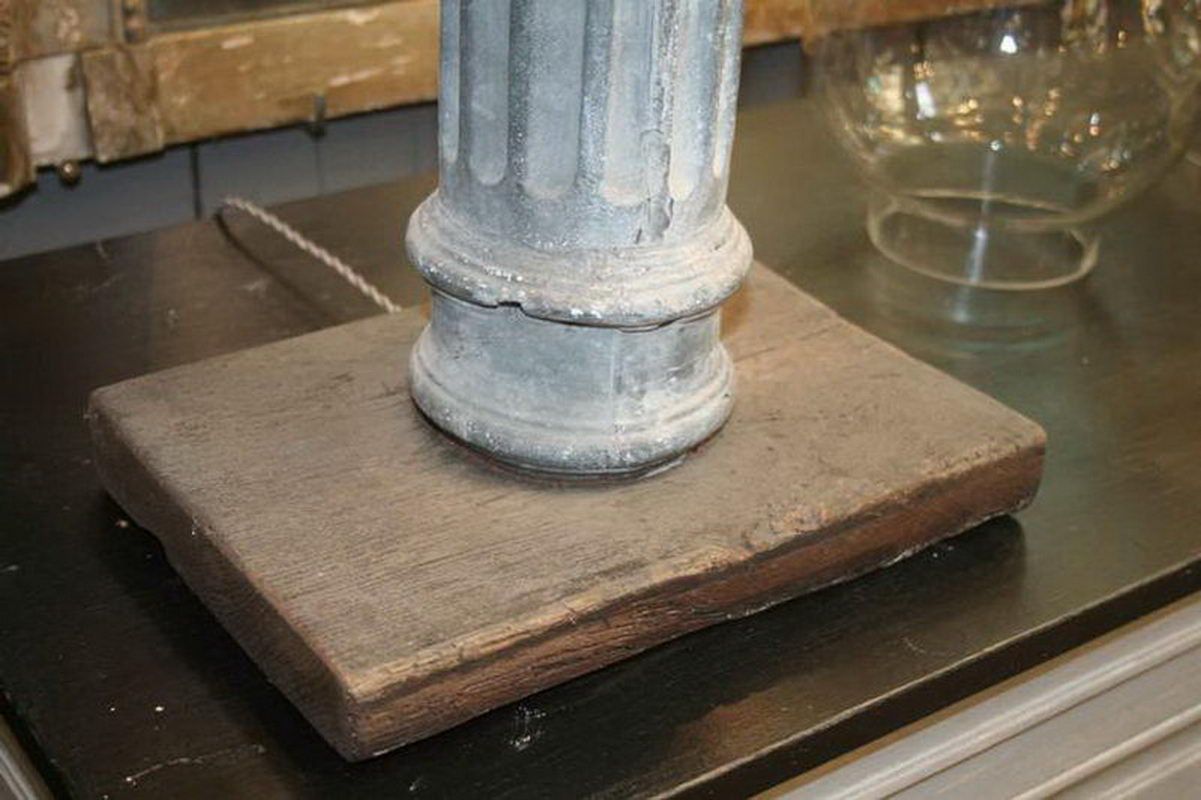 FL (206) Paire de lampes colonnes en zincPaire de grandes lampes en zinc et piètement en bois avec abat-jour en tissu gris et intéreur doré.Request priceDimensions