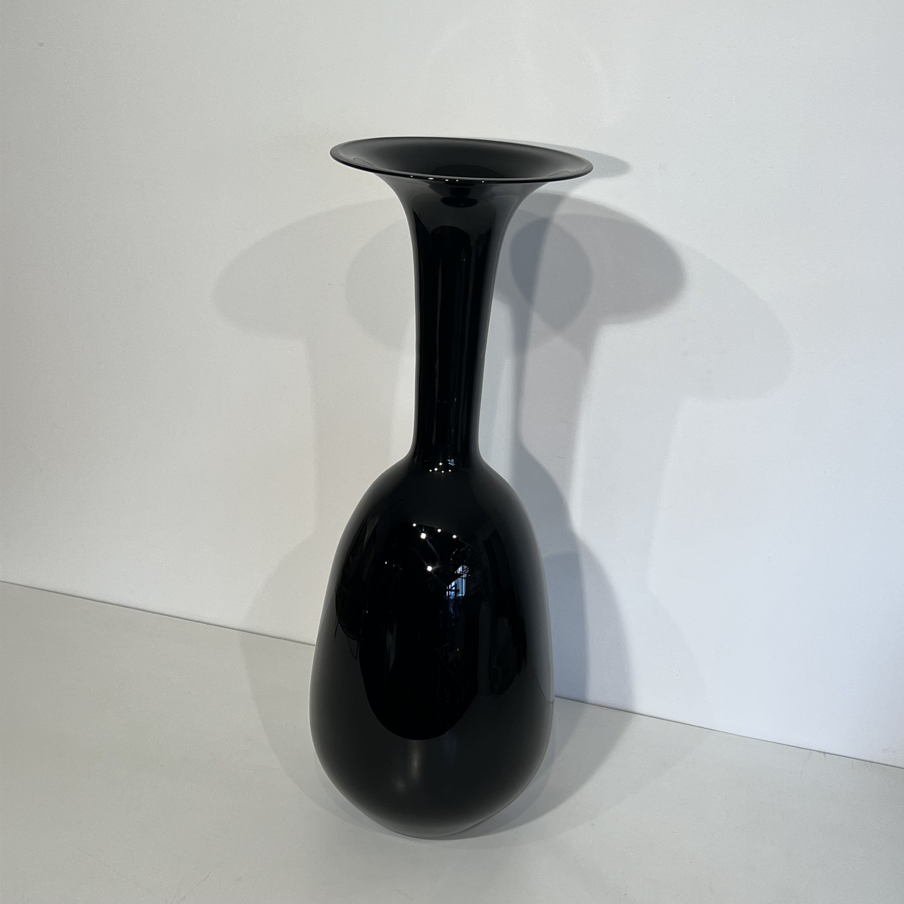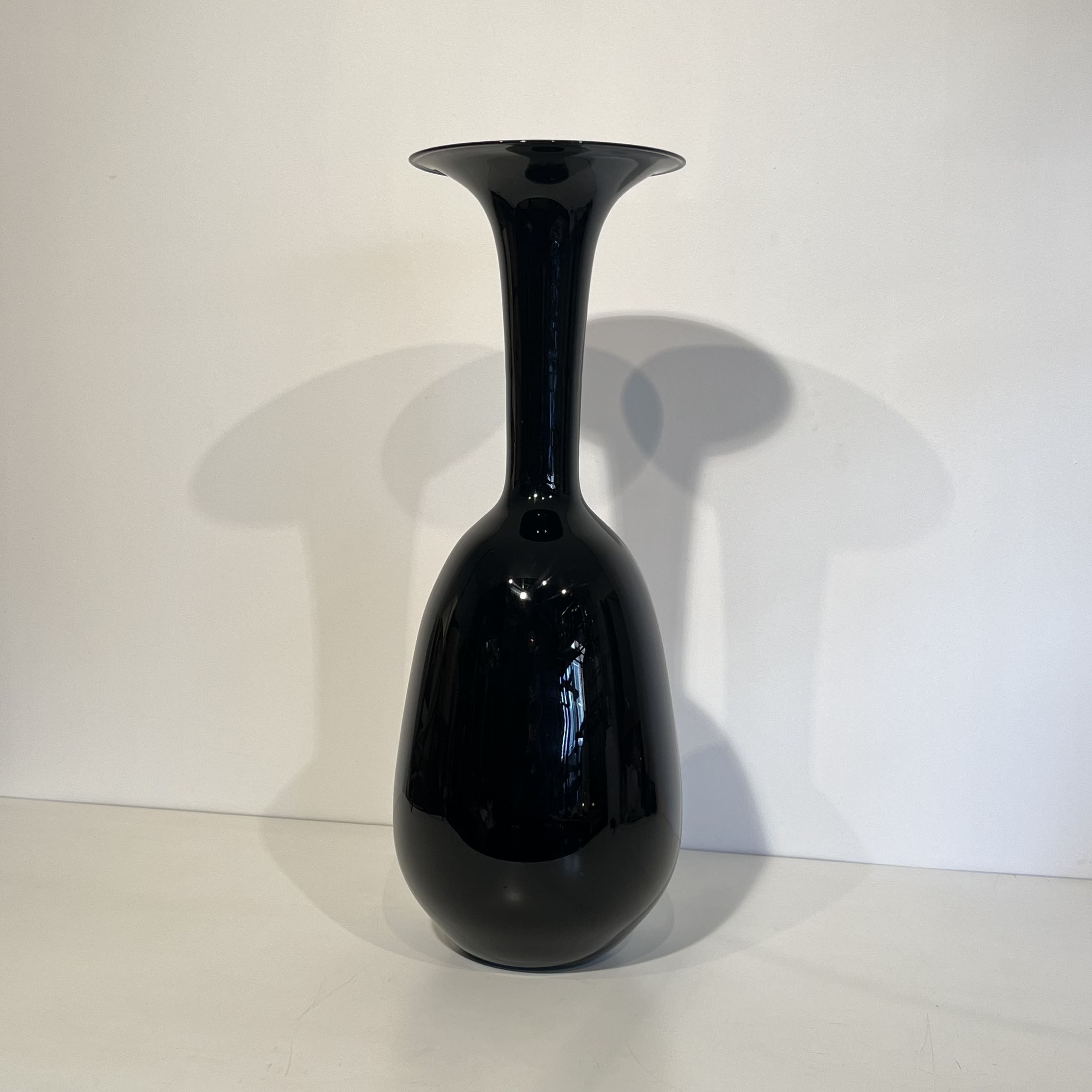 This vase of exceptional proportions (nearly 80 cm in height) is highly representative of late 20th-century architectural ceramics. Crafted from porcelain, the structural design relies on a generous ovoid body extending into a very long, slender cylindrical neck, terminating in a widely flared, flat corolla-like lip. The entire piece is covered in a monochrome black glaze of absolute brilliance. This surface treatment, acting as a dark mirror, emphasizes the rigor of the lines and the total absence of superfluous ornamentation. Aligning with the minimalist design movement of the 1970s and 1980s, this piece illustrates the desire of European manufactories to design objects of spectacular dimensions, intended to structure space rather than serve a merely utilitarian purpose. The use of lacquered black and a highly elongated profile calls to mind the radical elegance of Italian design or post-modern productions of the era, where the object transcends its function to become a true autonomous sculpture. Condition report: Excellent condition. The glaze presents an even shine and shows no structural defects. Through its scale and highly graphic profile, this vase will stand out as a decorative centerpiece.