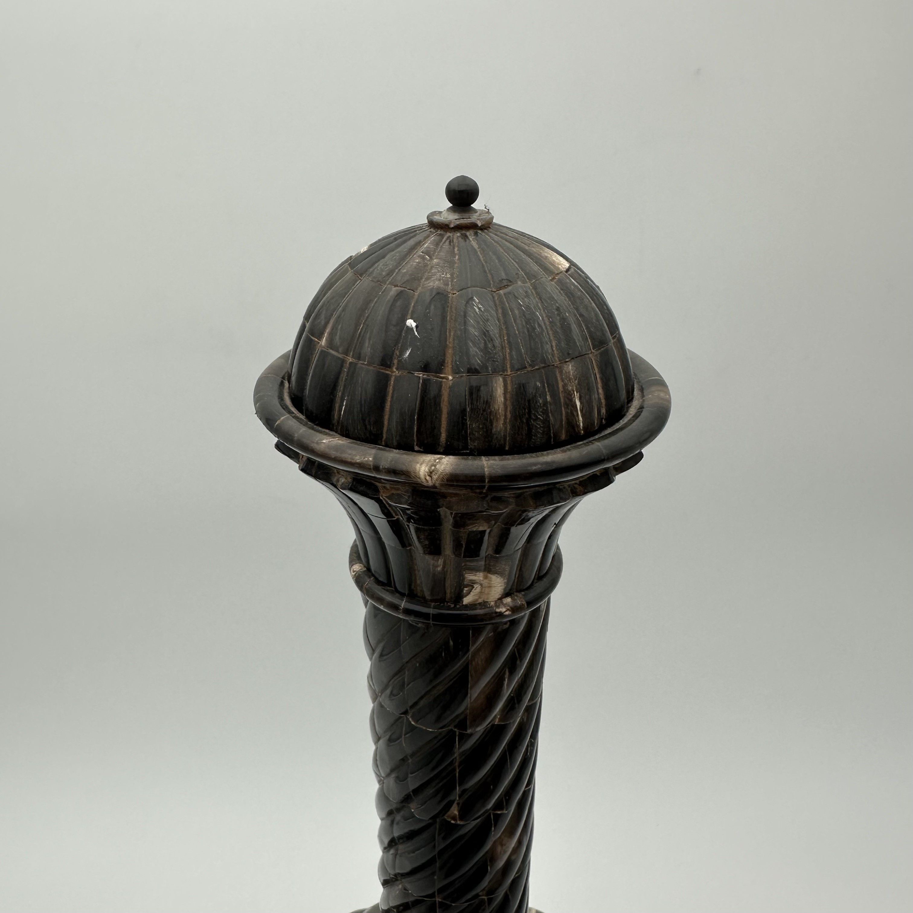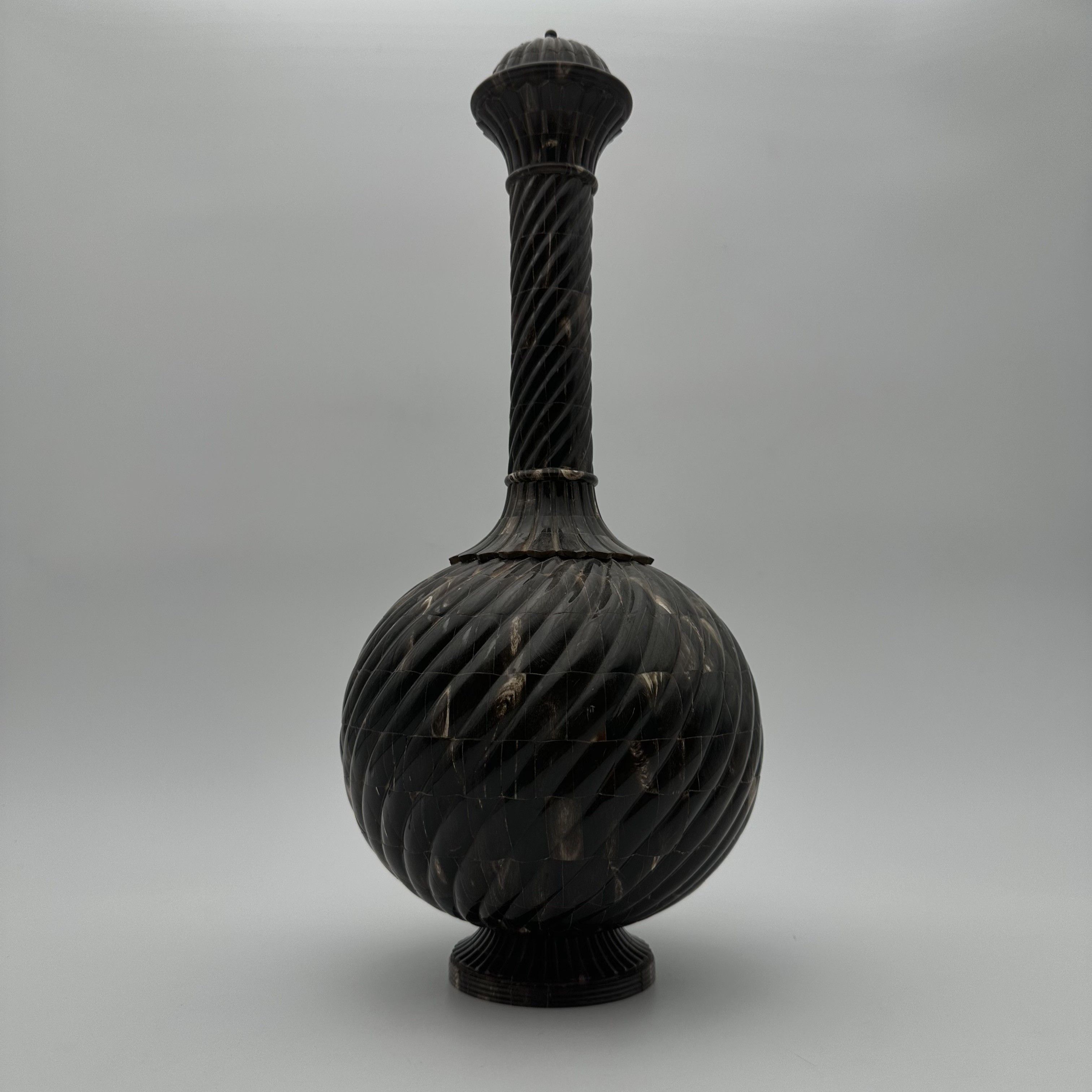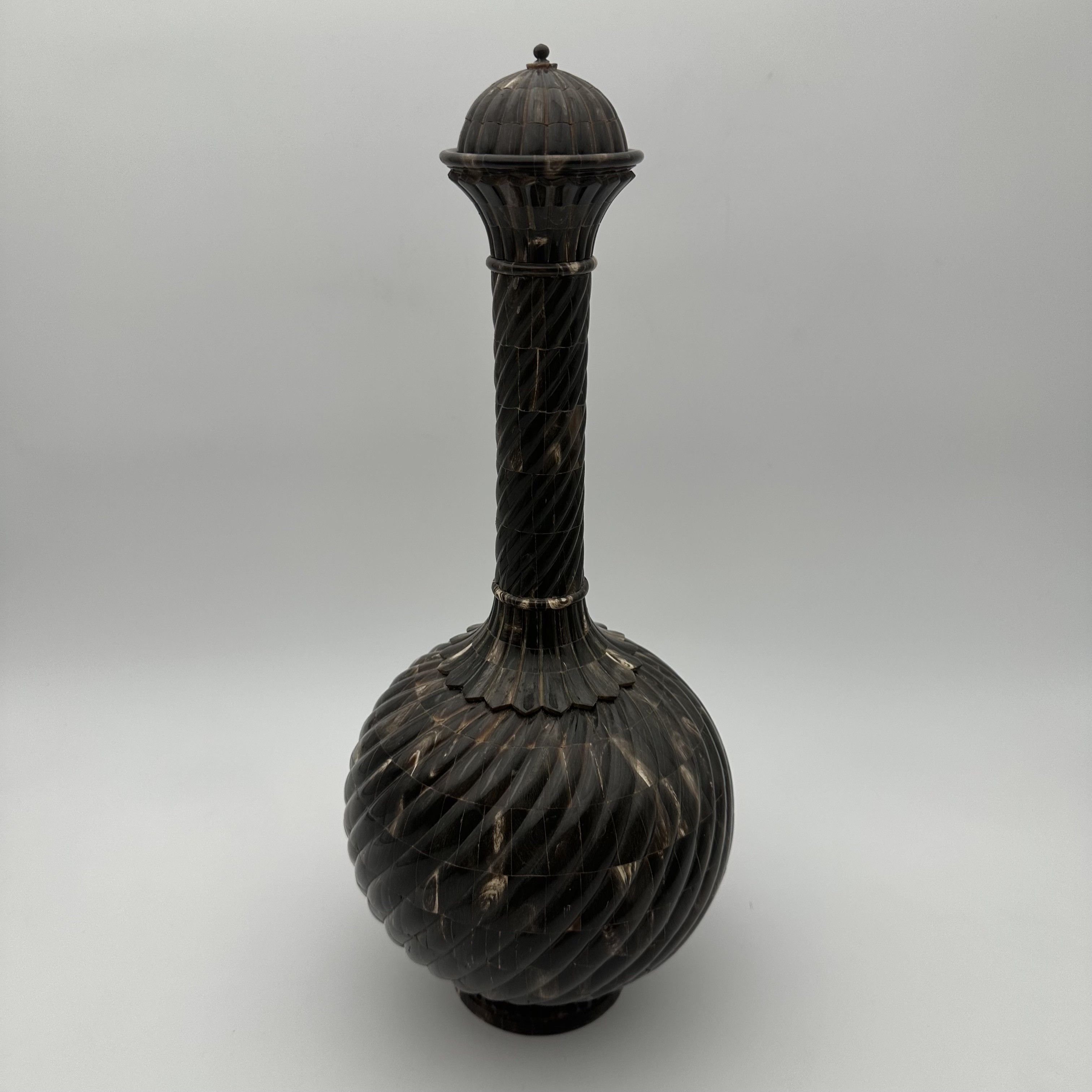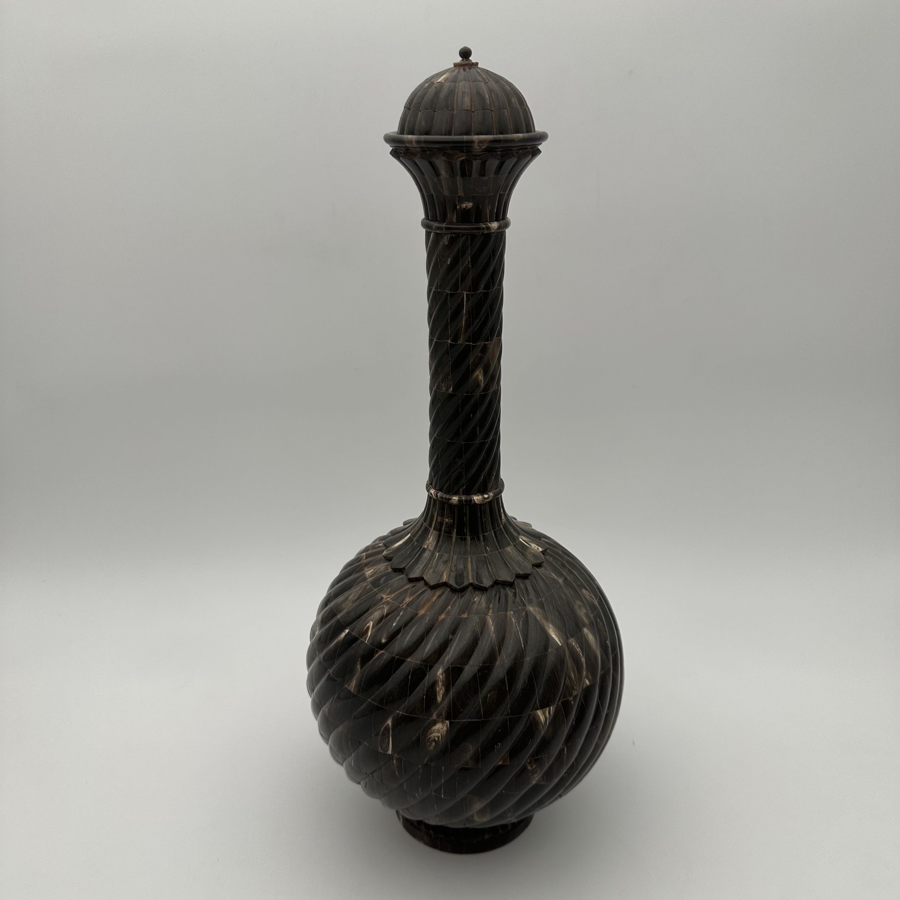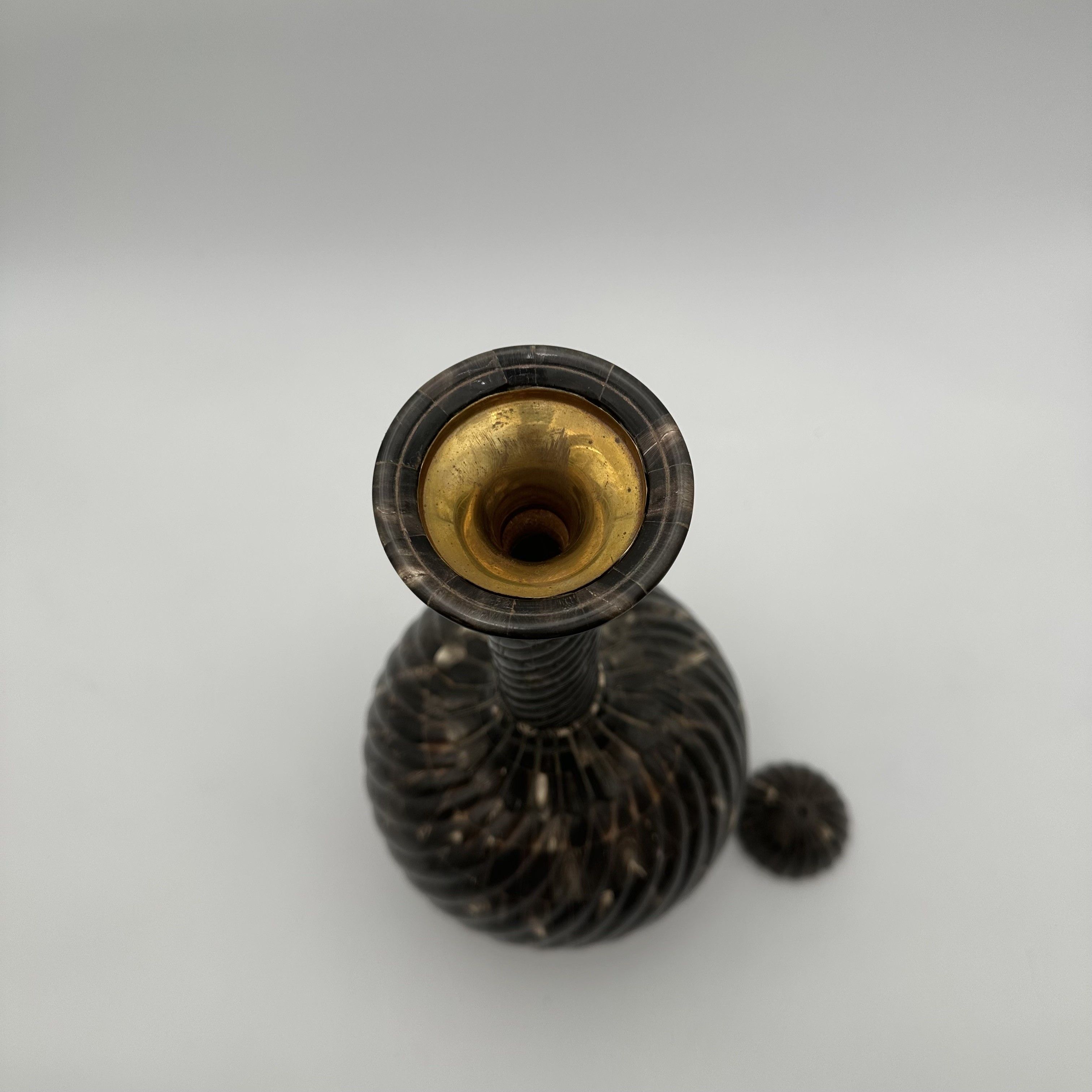 This fascinating sculptural bottle is an exceptional decorative object, worthy of the finest contemporary cabinets of curiosities. Made in the 1980s, it draws inspiration from traditional Asian or Oriental votive forms. Probably designed as a ceremonial vase or a highly symbolic object, it captivates with its mysterious allure and the incredible complexity of its craftsmanship, combining noble materials with strong symbolism. Standing an impressive 43 cm tall, the piece commands attention with its harmonious proportions. The turned wooden core, forming a generous 20 cm bulbous body, is entirely covered in a luxurious horn veneer worked into twisted gadroons. This raised pattern subtly catches the light on the brown and translucent reflections of the organic material. The refinement is taken to its peak with an elegant neck and stopper crafted from solid brass, delicately crowned with a decorative pearl finial. As a remarkable hidden detail, the base of the bottle reveals a delicate inlay depicting a lotus flower, the ultimate symbol of spiritual awakening. Offered in beautiful condition, this bottle is a true work of artisanal art. A majestic piece, it will stand proudly on a console table, a mantelpiece, or in the center of a bookcase, bringing a touch of refined exoticism and mystery to a classic or contemporary interior.