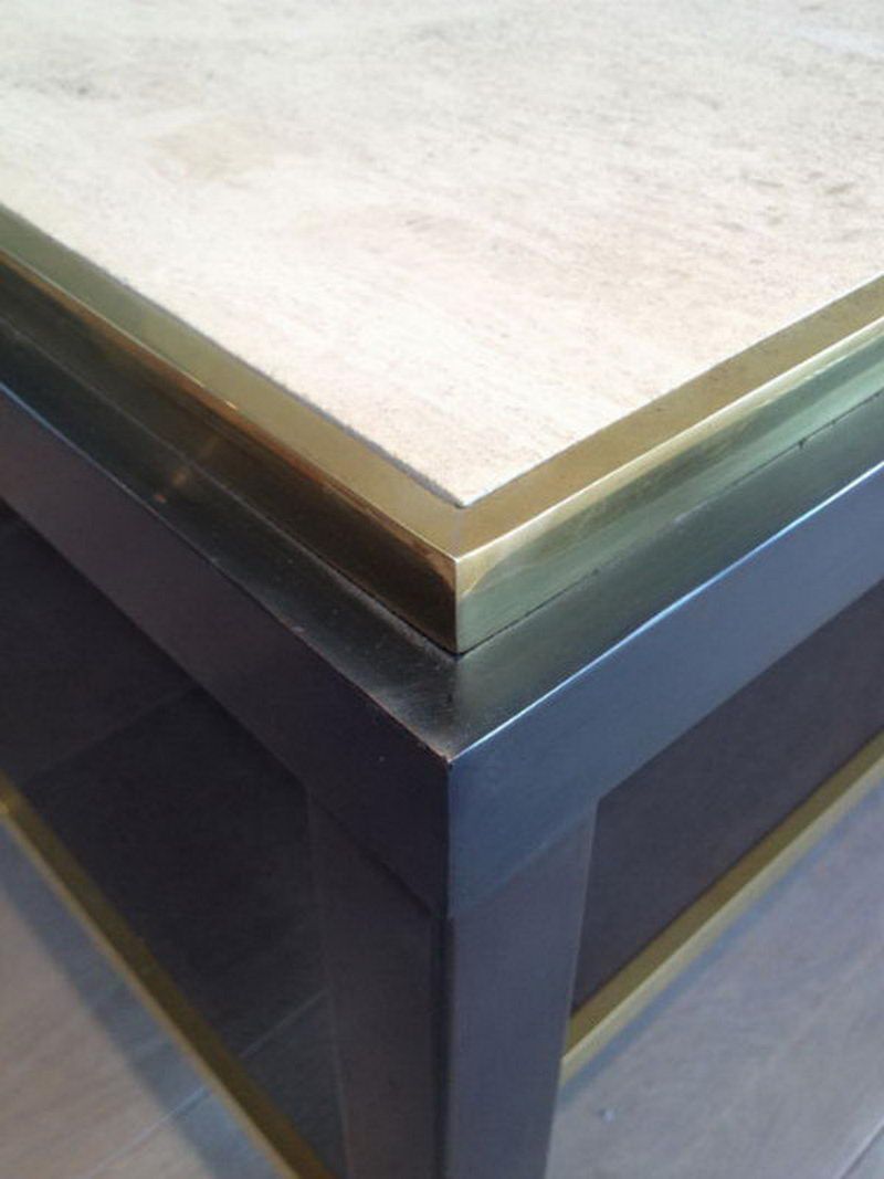 Beautiful Large Gun Metal Coffee Table with Travertine TopBeautiful Large Gun Metal Coffee Table with Travertine Top. French. Circa 1970.Request priceDimensionsWidth53.15 inch135 cmDepth31.5 inch80 cmHeight24.21 inch61.5 cmInformationProduct code50's 3421