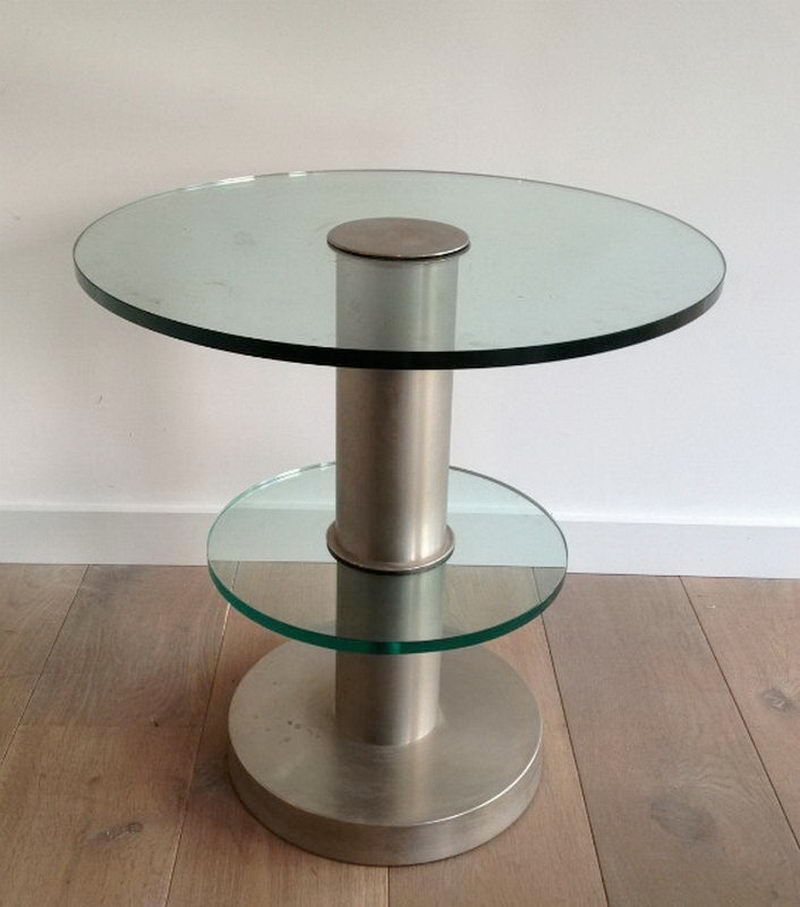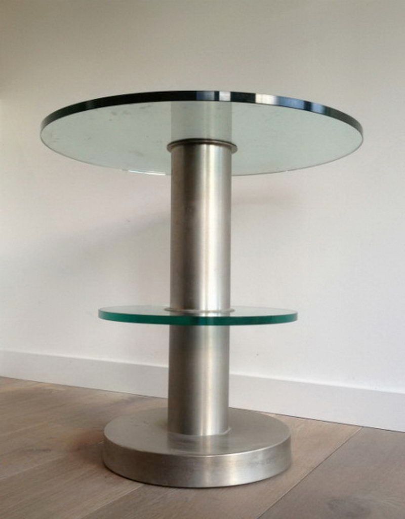 Very nice brushed metal and glass round occasionable tableVery nice brushed metal and glass round occasionable table. Circa 1960Request priceDimensionsWidth24.02 inch61 cmDepth24.02 inch61 cmHeight24.41 inch62 cmInformationProduct code50’s-10157