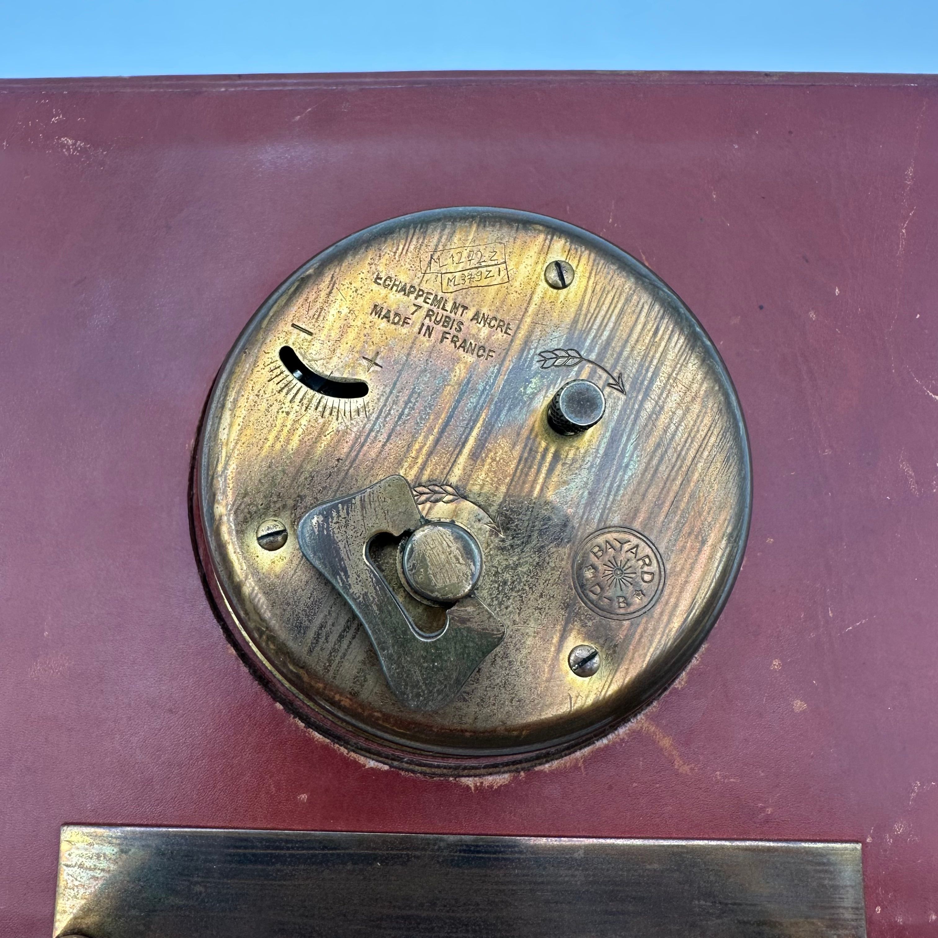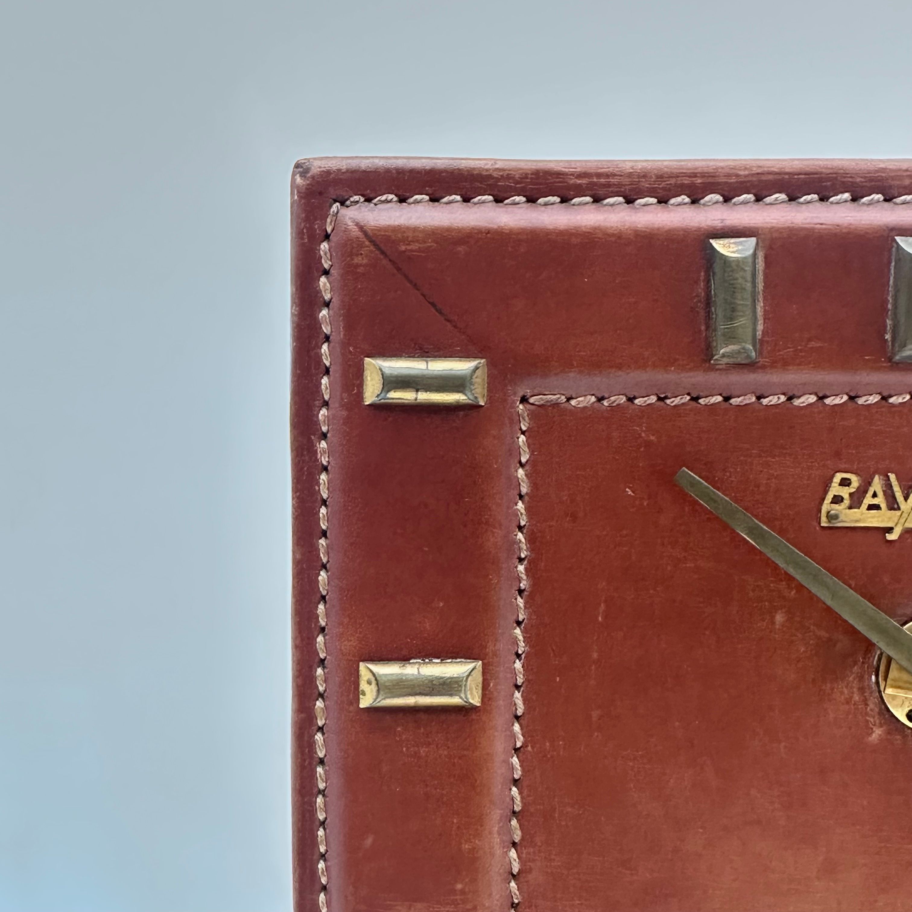 Art Deco desk clock by the French manufacturer Bayard, dated 1953. This model is distinguished by its brown leather-covered case, enhanced with gilt metal and brass details, notably the hour markers, hands, and base.