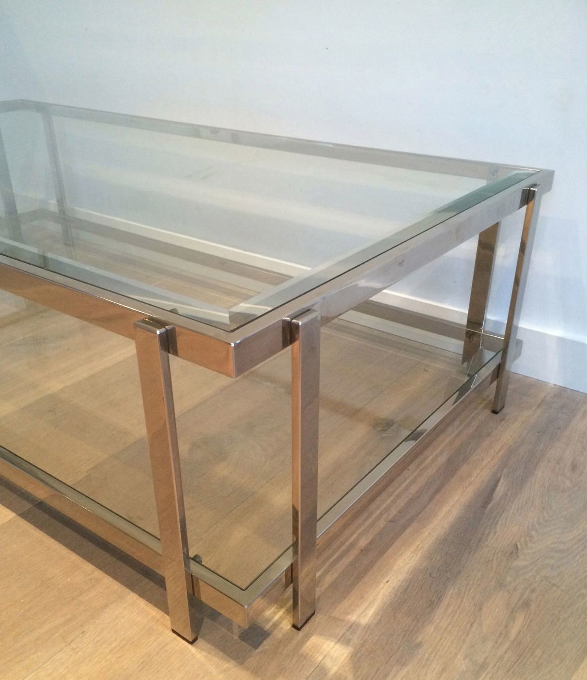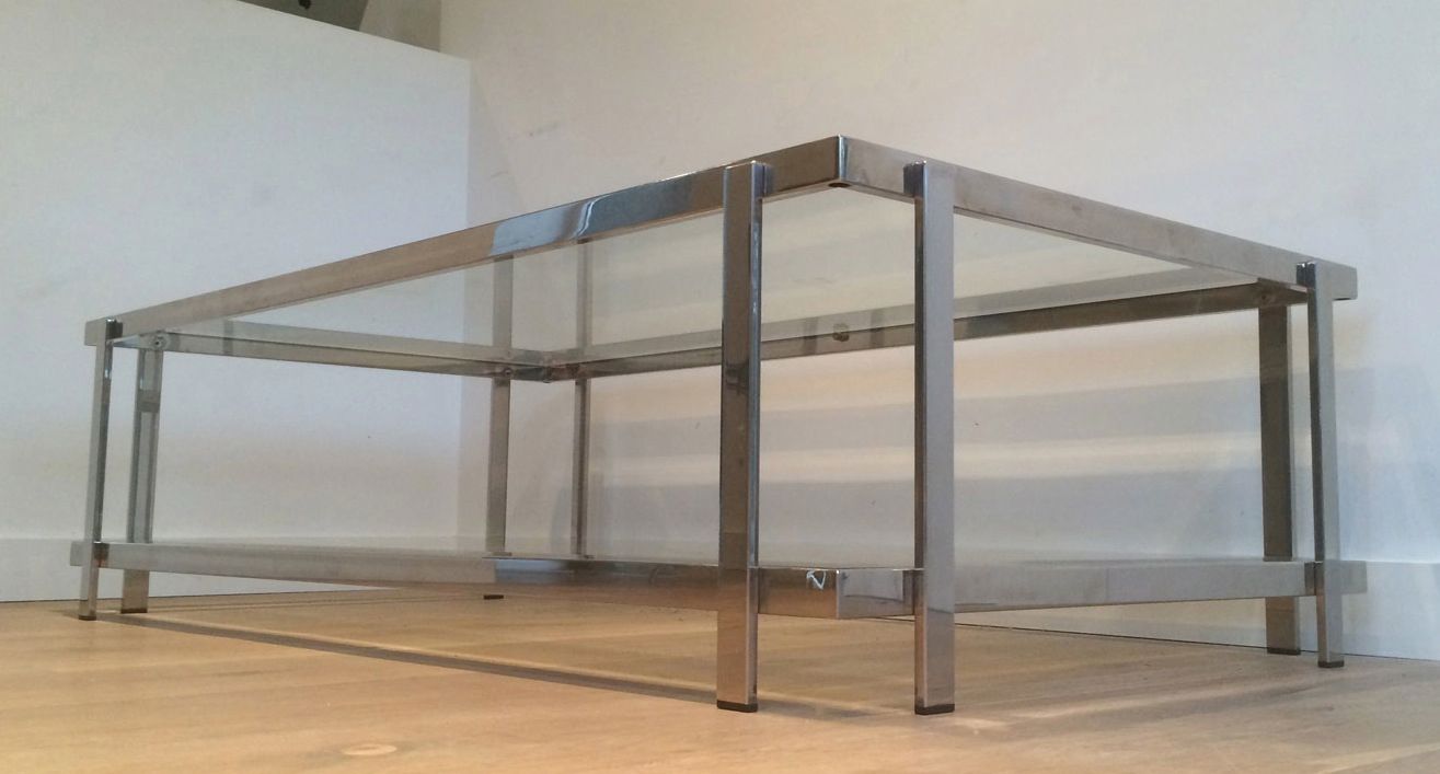Large Chrome Coffee TableLarge chrome coffee table with two glass shelves. French. Circa 1970Request priceDimensionsWidth51.57 inch131 cmDepth28.15 inch71.5 cmHeight14.17 inch36 cmInformationProduct code50's-11284
