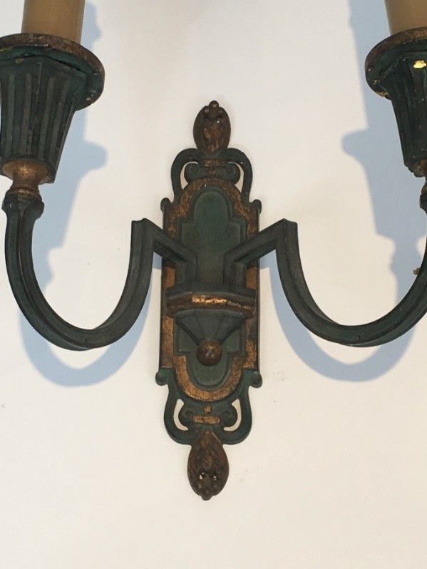 Interesting Pair of Bronze Sconces with Green and Gild PatinaInteresting Pair of Bronze Sconces with Green and Gild Patina. French. Circa 1940Request priceDimensionsWidth9.25 inch23.5 cmDepth6.69 inch17 cmHeight8.27 inch21 cmInformationProduct codeBS-166