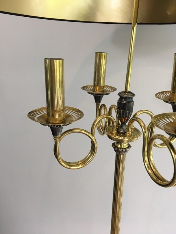Neoclassical brushed steel and brass floor lamp with hunting horns. French work in the style of Maison Charles. . Circa 1940