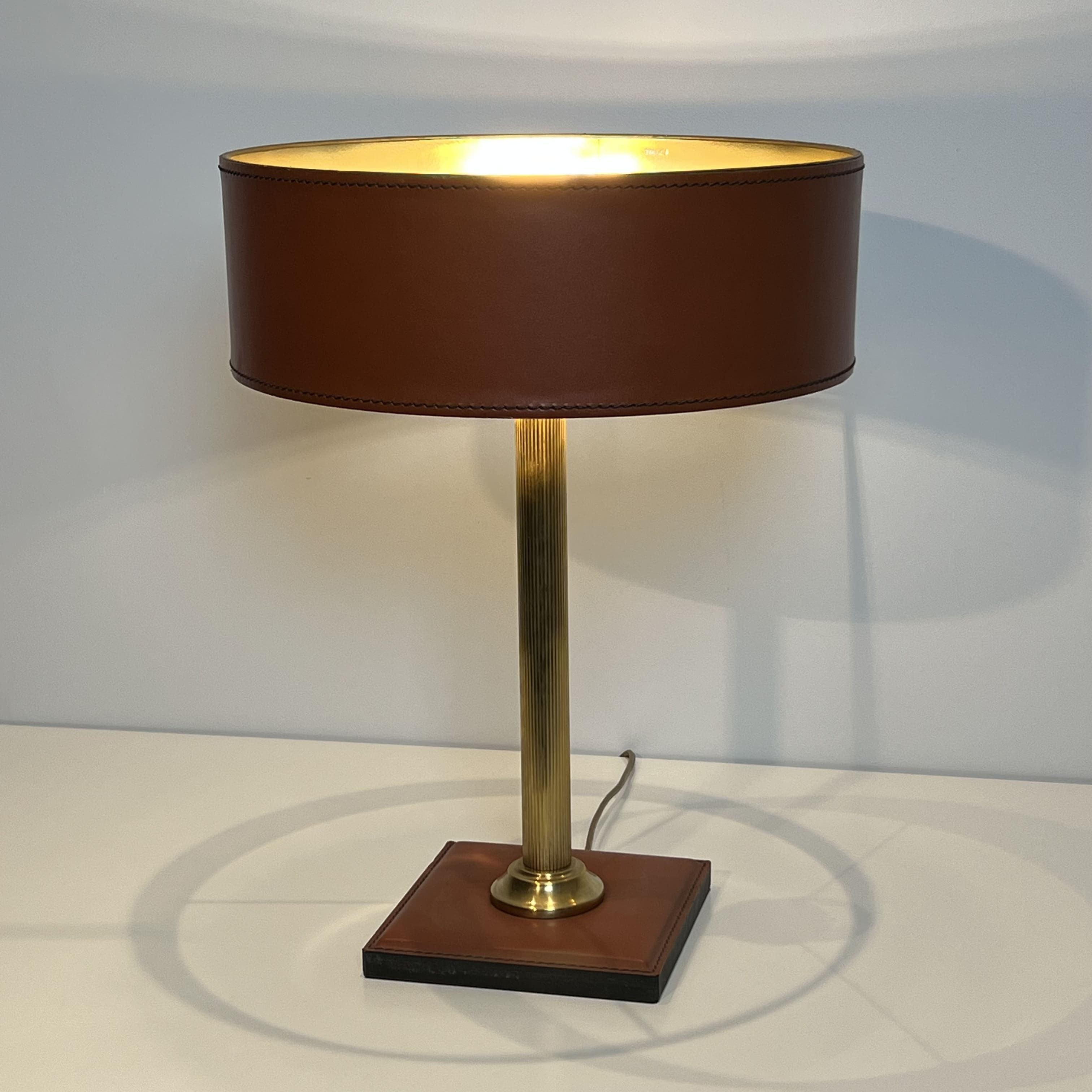 This desk lamp illustrates the rigorous aesthetic of mid-20th-century French luxury leatherwork (gainerie). The structural design relies on a weighted square base, entirely sheathed in smooth camel brown leather, strictly highlighted on its edges with contrasting 'saddle' stitching. The center of the base holds a solid brass cylindrical stem detailed with fine fluting. The piece is crowned by its original short-drum cylindrical lampshade, also wrapped in matching stitched leather. The interior of the shade features a reflective gold finish, technically designed to optimize and warm the downward diffusion of light. The combination of the geometric rigor of brass and the equestrian leather treatment allows this piece to be formally placed in the lineage of Jacques Adnet's creations. Director of the Compagnie des Arts Français from 1928 to 1959, Adnet established himself as a master of luxury modernism. Very good overall condition. The leather displays a natural and subtle patina of use, with no structural alteration or major tears.