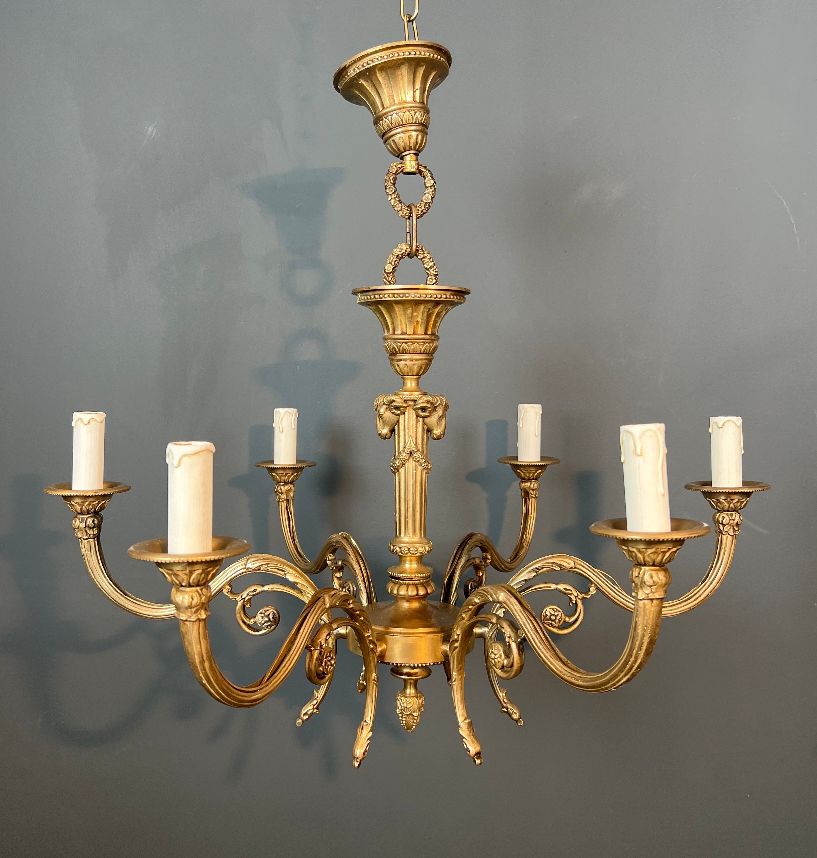 Bronze chandelier with ram's heads. French work in the Louis XVI style. In the style of Maison Jansen. Circa 1940