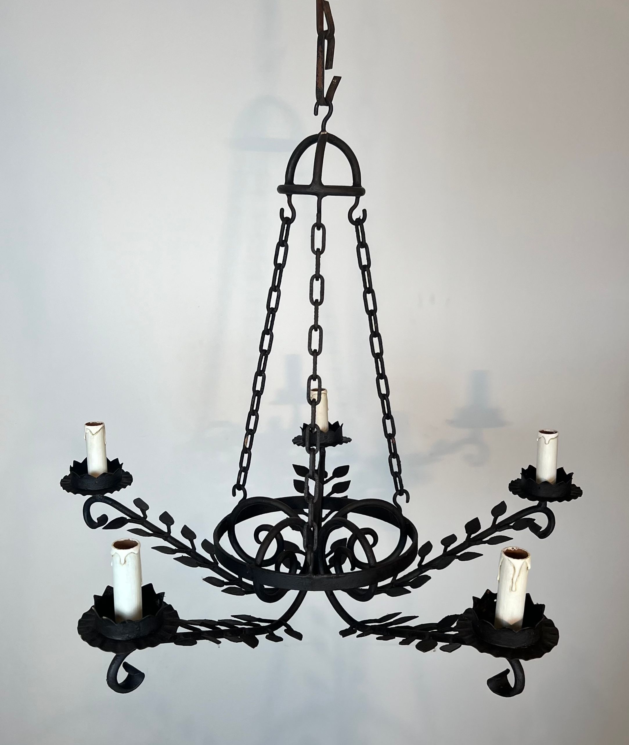 5 Arms Wrought Iron Chandelier with Leaves5 arms wrought iron chandelier with Leaves. French work. Circa 1950Request priceDimensionsWidth29.53 inch75 cmDepth29.53 inch75 cmHeight25.98 inch66 cmInformationProduct codeIC-2310
