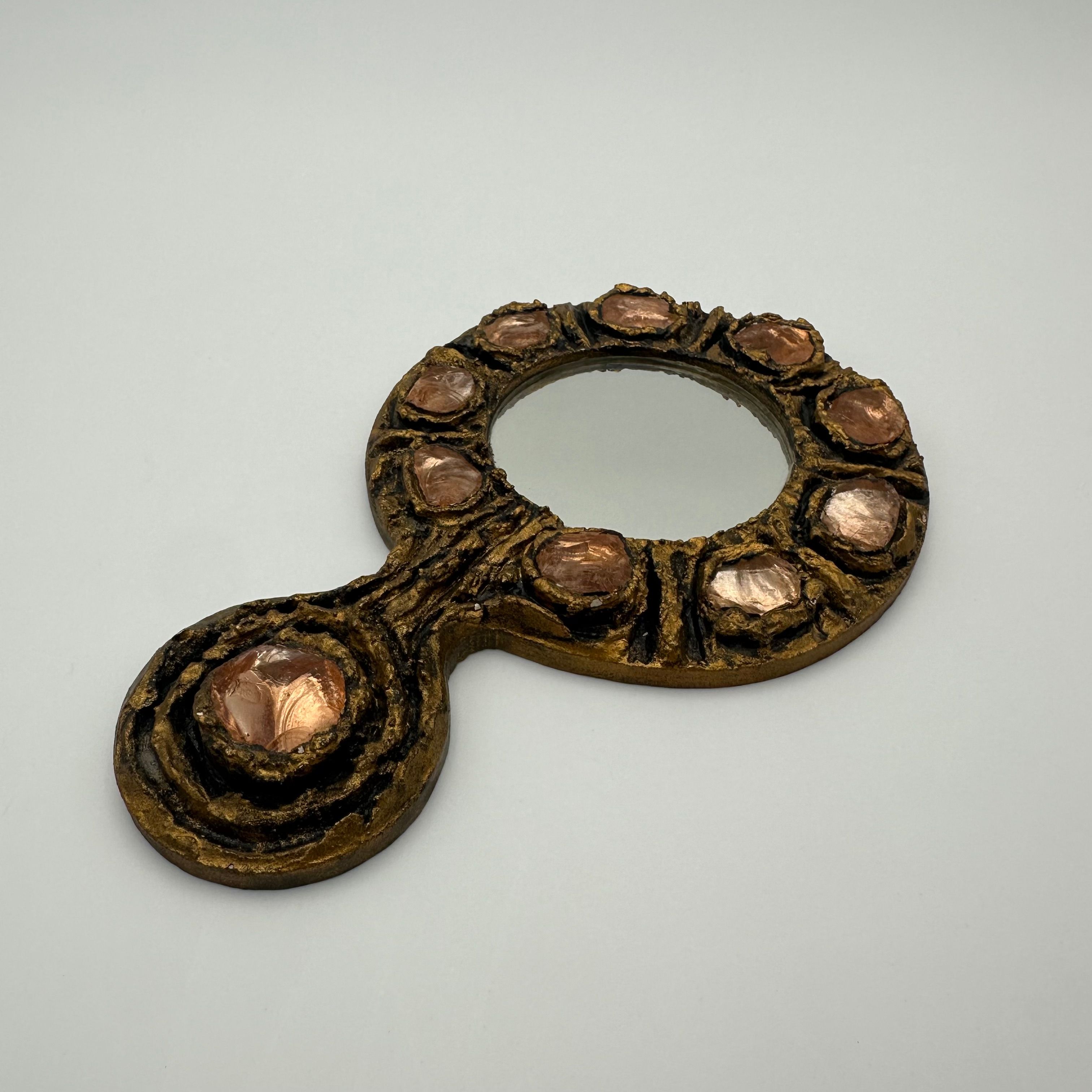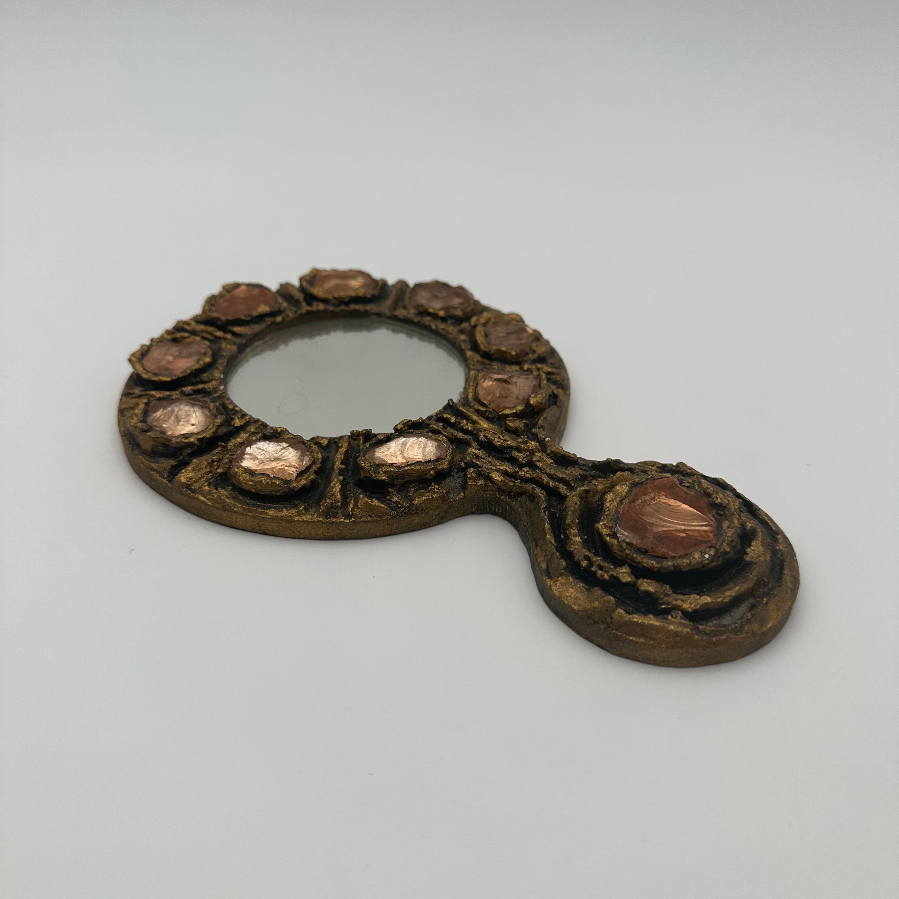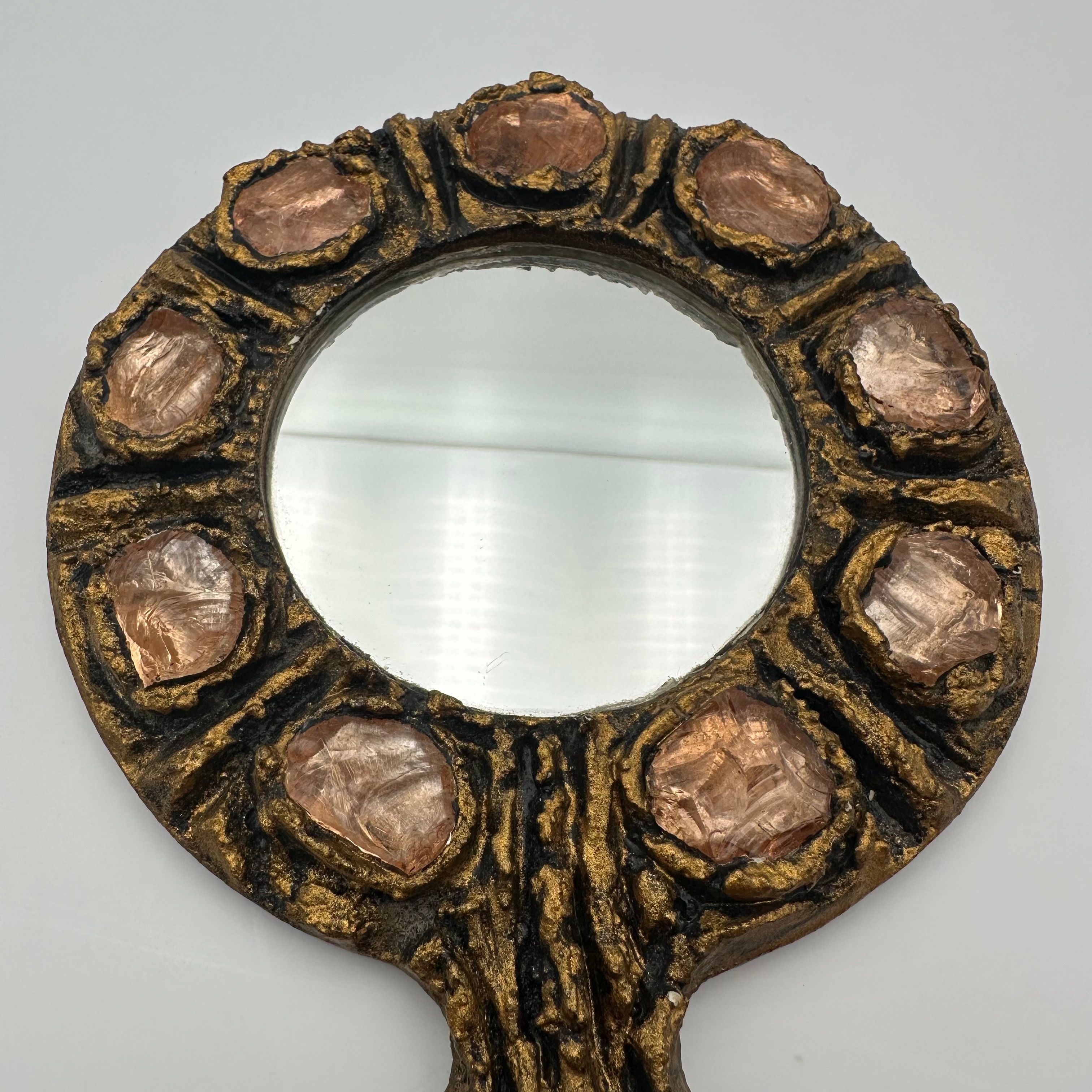 Gilt metal hand mirror featuring a richly textured surface, accented with circular pink glass cabochons, evoking the sculptural aesthetic and decorative spirit of Line Vautrin’s creations.