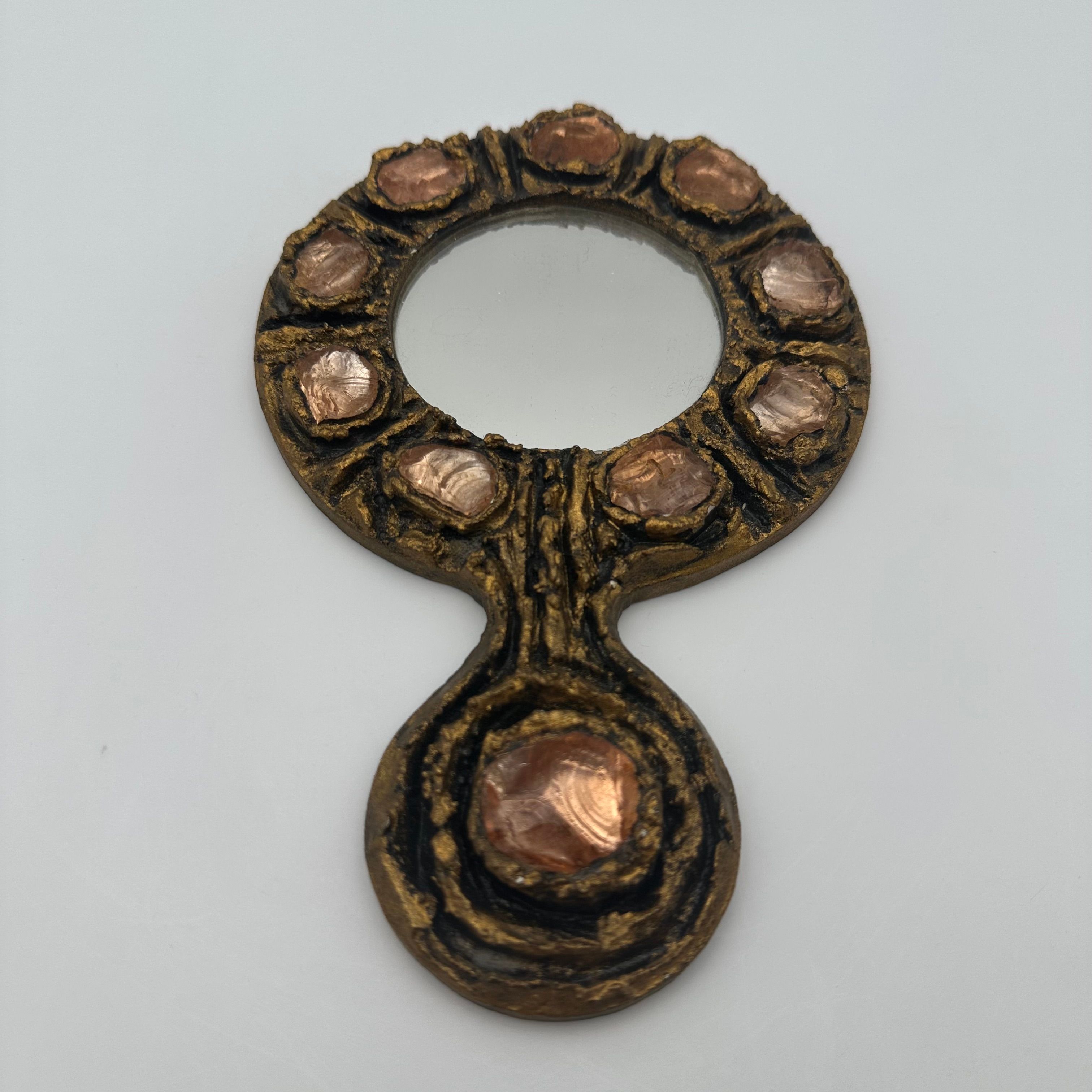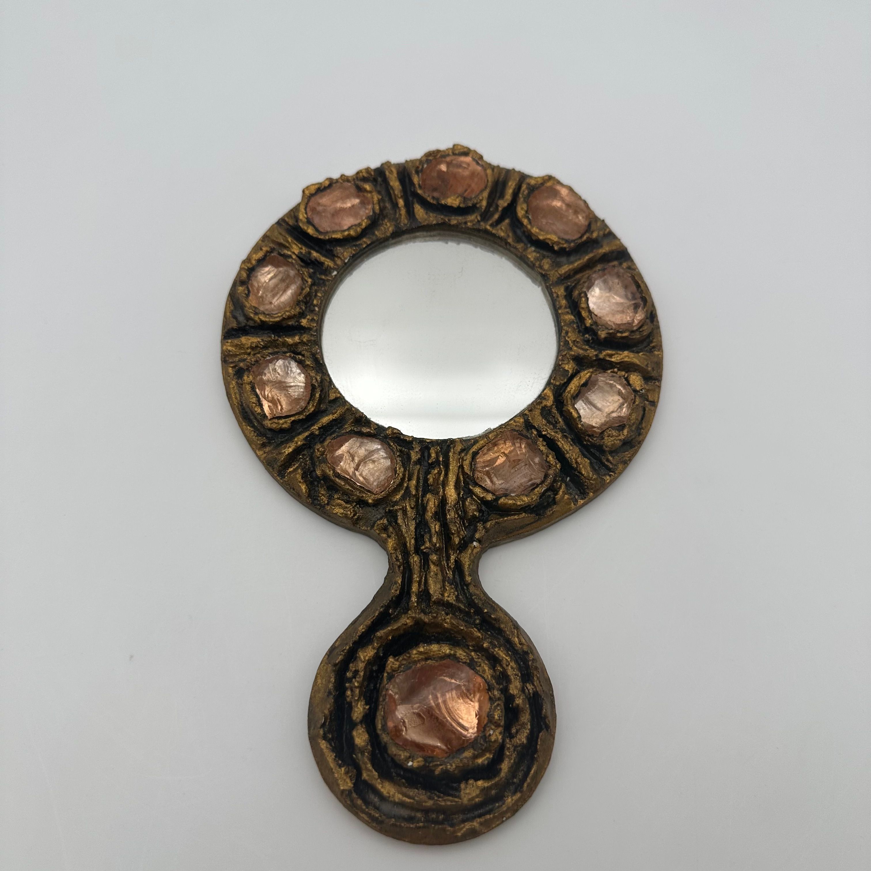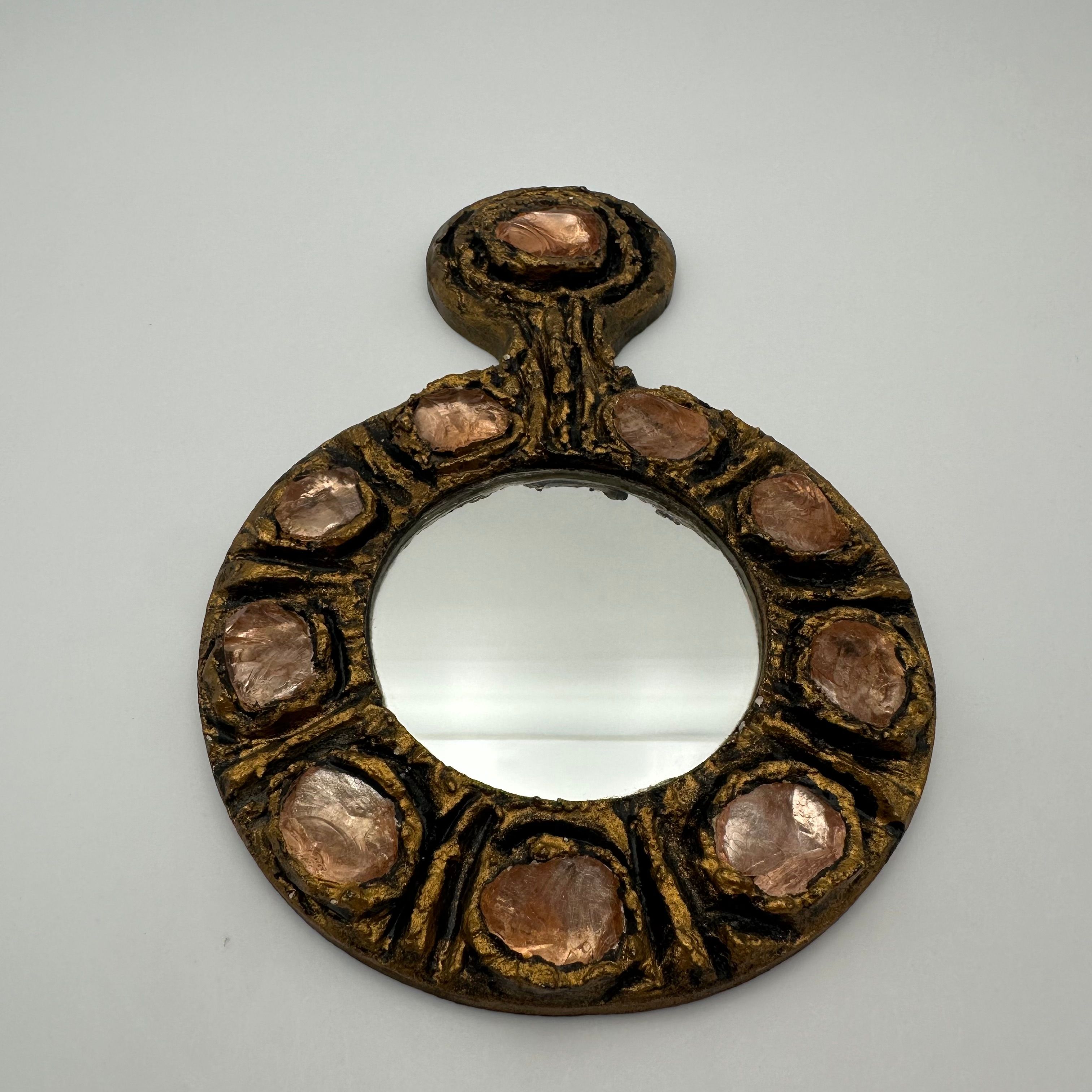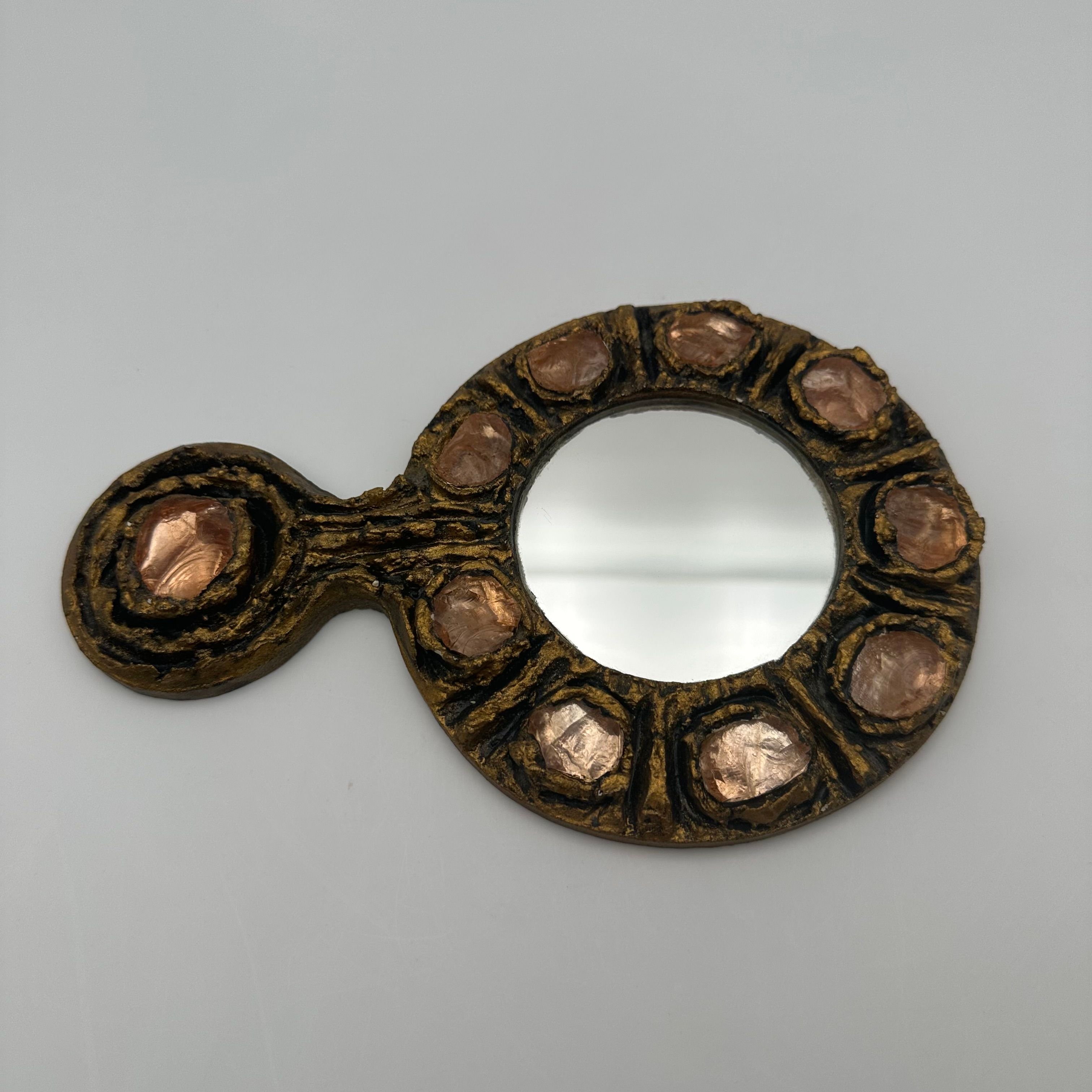 Gilt metal hand mirror featuring a richly textured surface, accented with circular pink glass cabochons, evoking the sculptural aesthetic and decorative spirit of Line Vautrin’s creations.