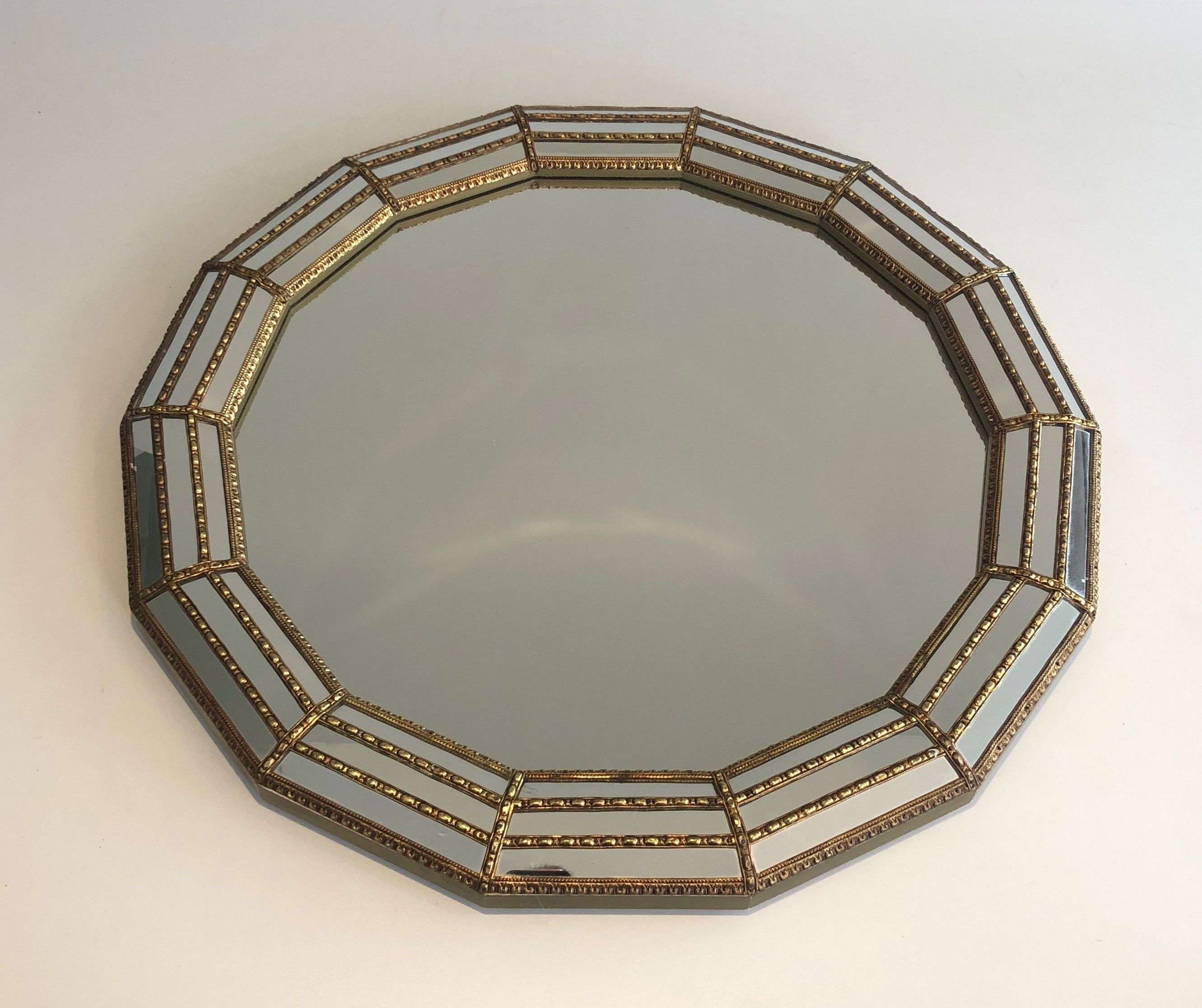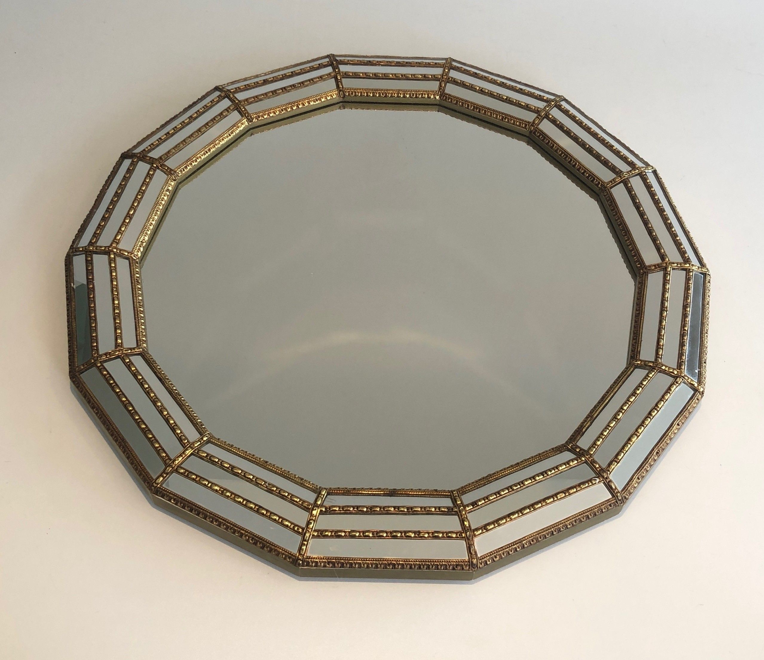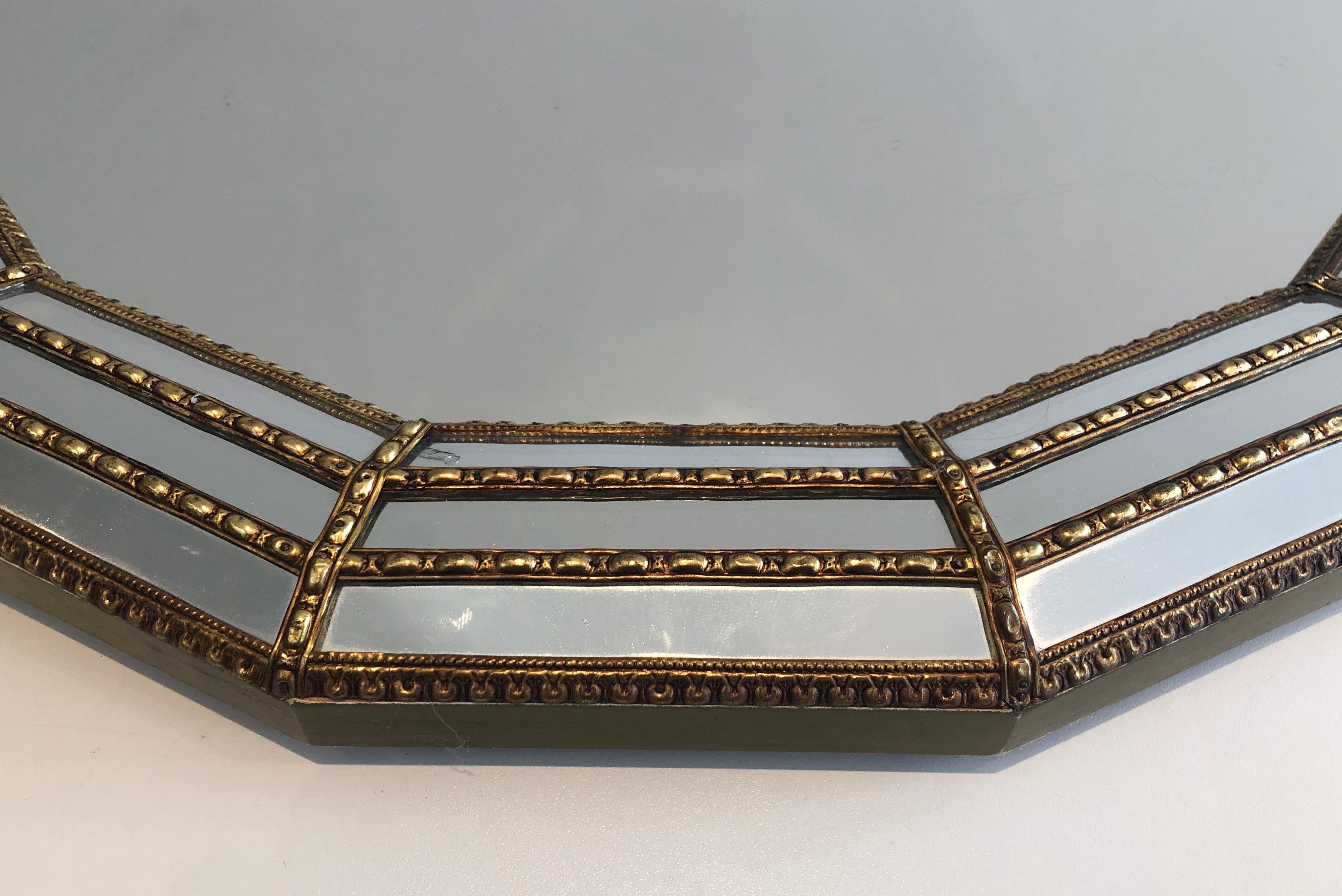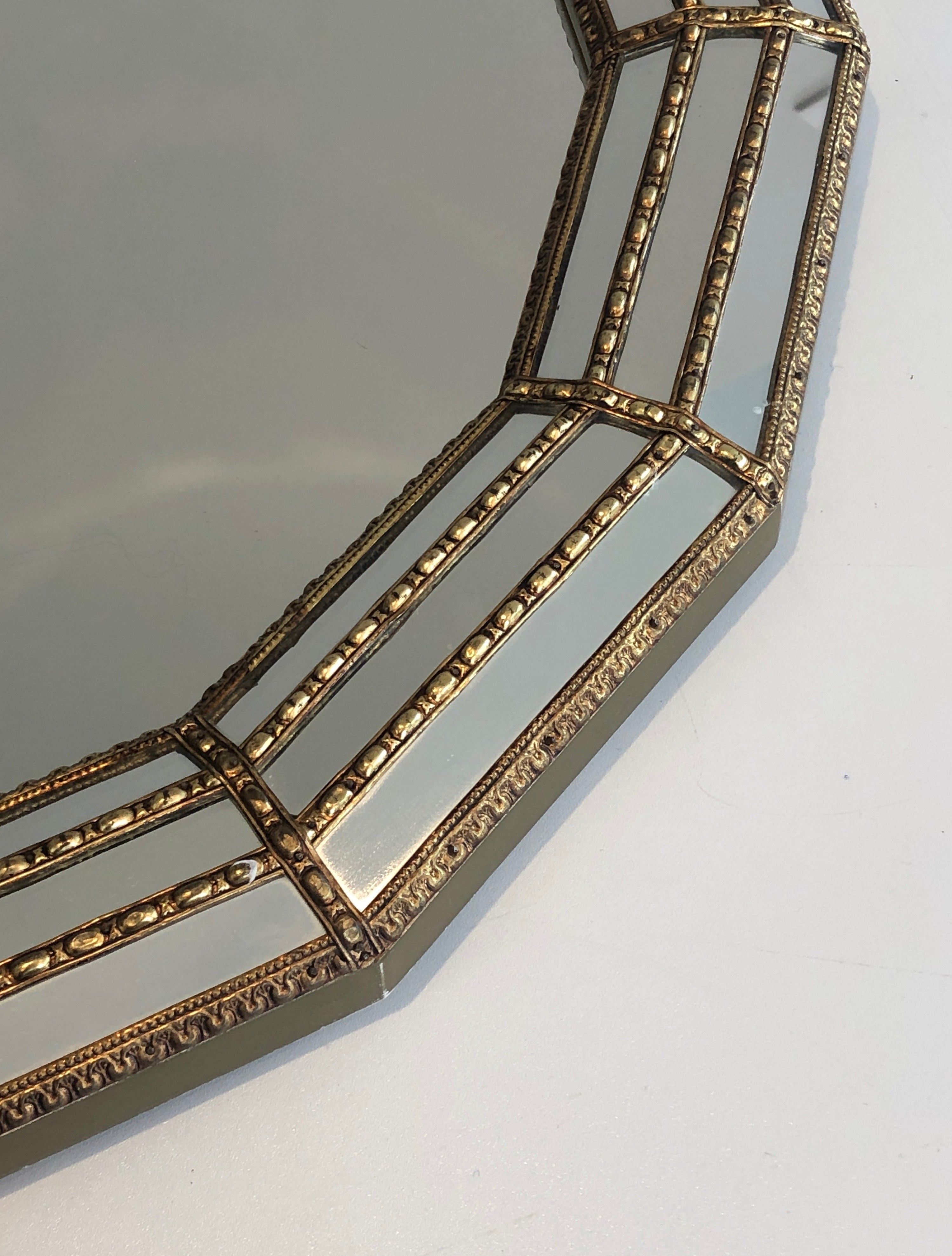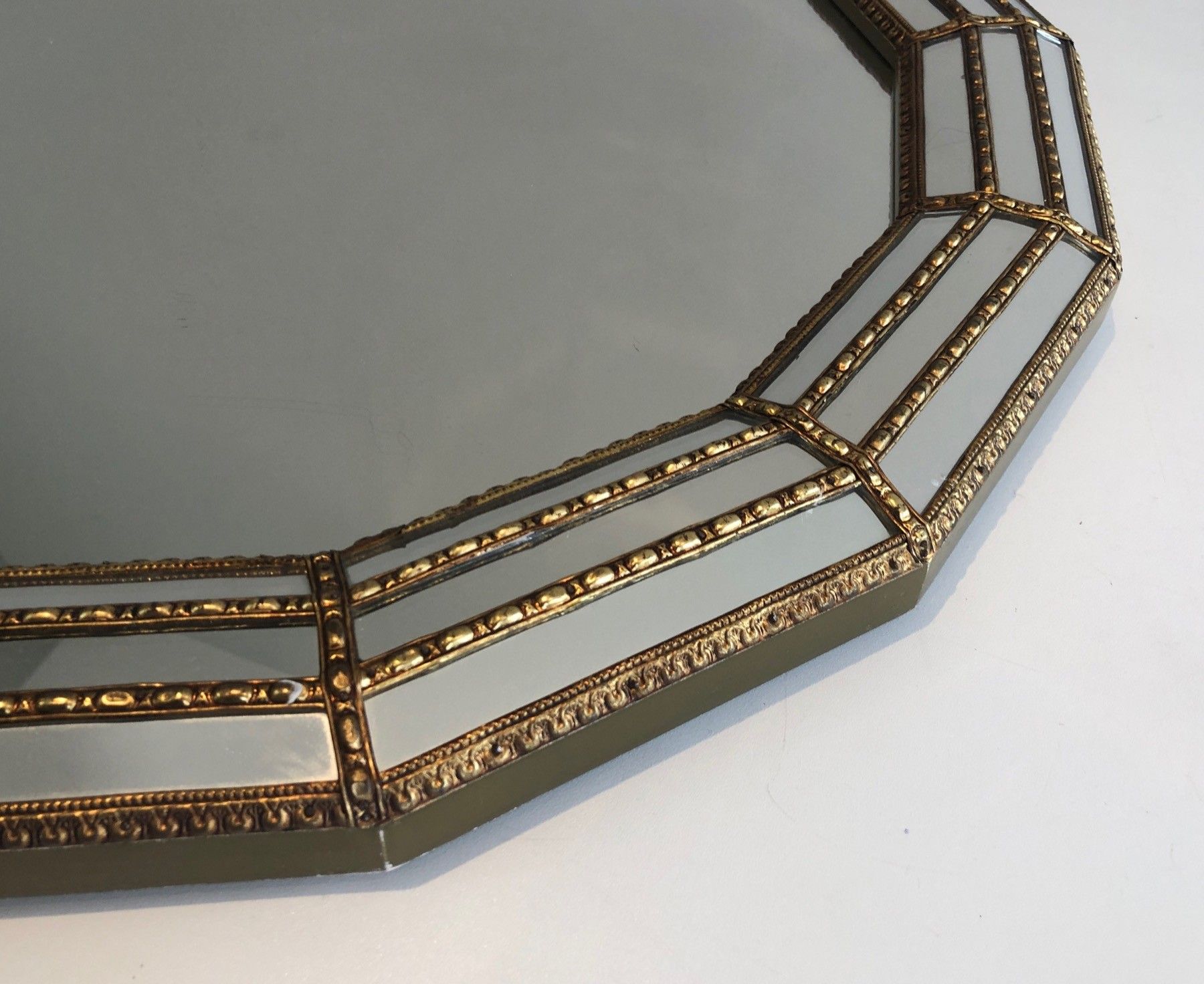 This octagonal wall mirror features a multi-faceted architectural structure. The assembly scheme revolves around a large central mirror plate, bordered by an angled frame consisting of eight peripheral mirror sections. The various glass panels are set and secured by a gilded brass frame, finely detailed with a raised continuous garland motif. This angled arrangement of the borders multiplies the reflections and adds depth and volume to the object. This type of multi-faceted construction, a direct legacy of 18th and 19th-century Venetian mirror making, experienced a significant reinterpretation in the mid-20th century. In the 1950s and 1960s, the Hollywood Regency movement and revived neoclassicism brought these brass-lined geometric mirrors back into fashion. Good overall condition. The brass frame shows natural oxidation and an even patina of use. The mirror silvering is well-preserved, with possible minor oxidation spots inherent to the age of the glass.