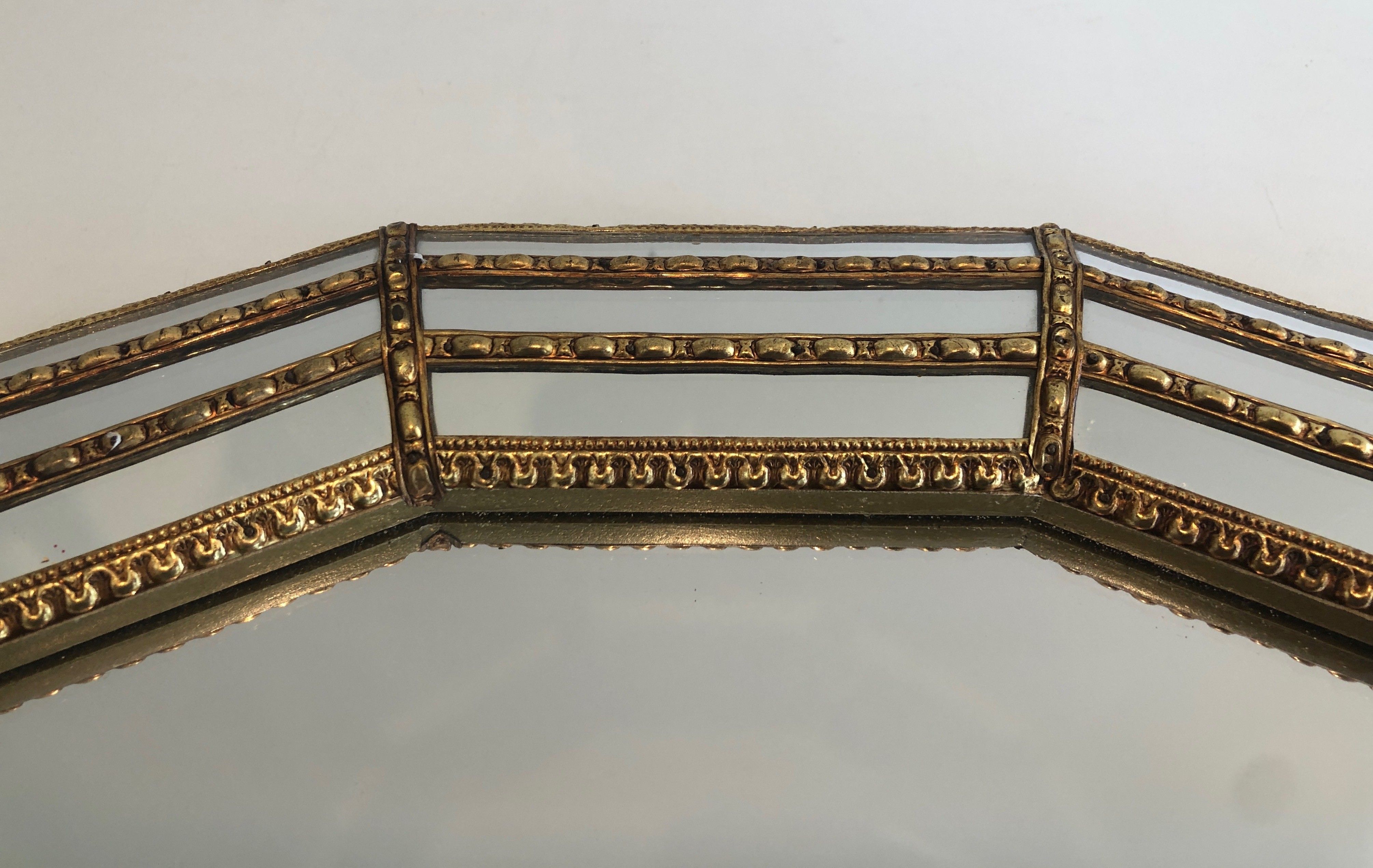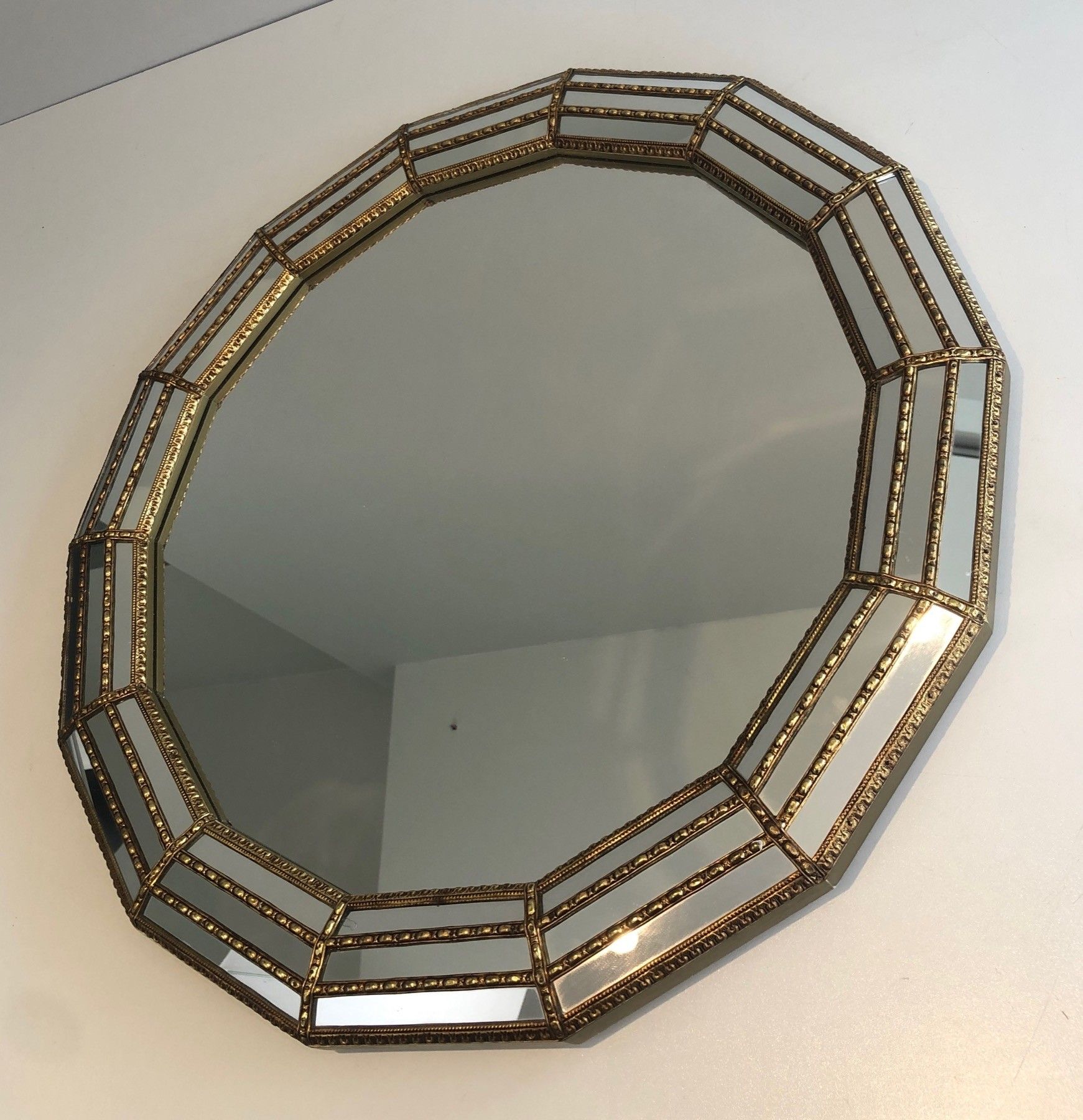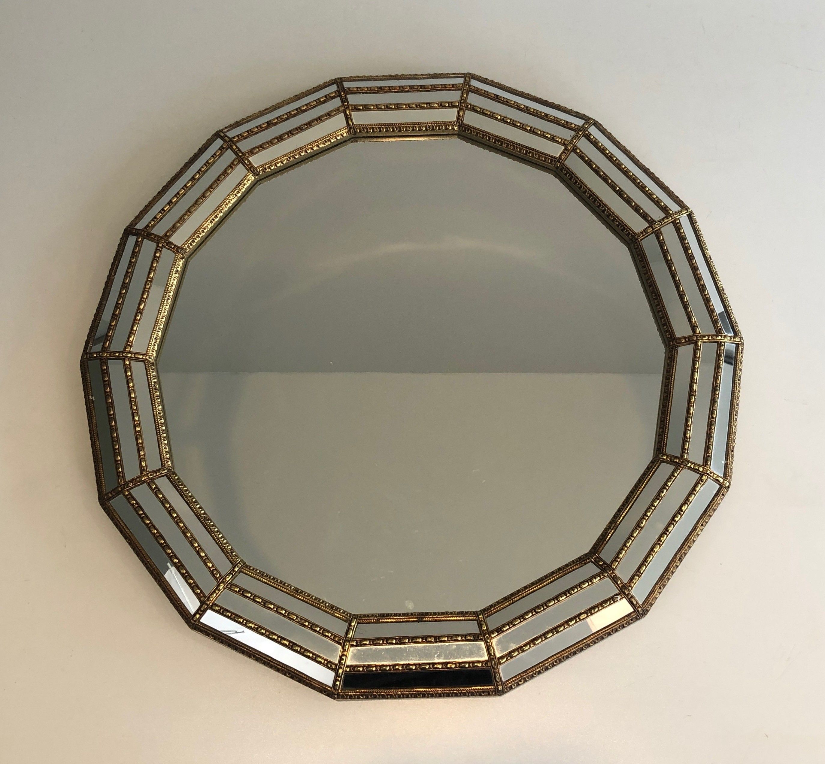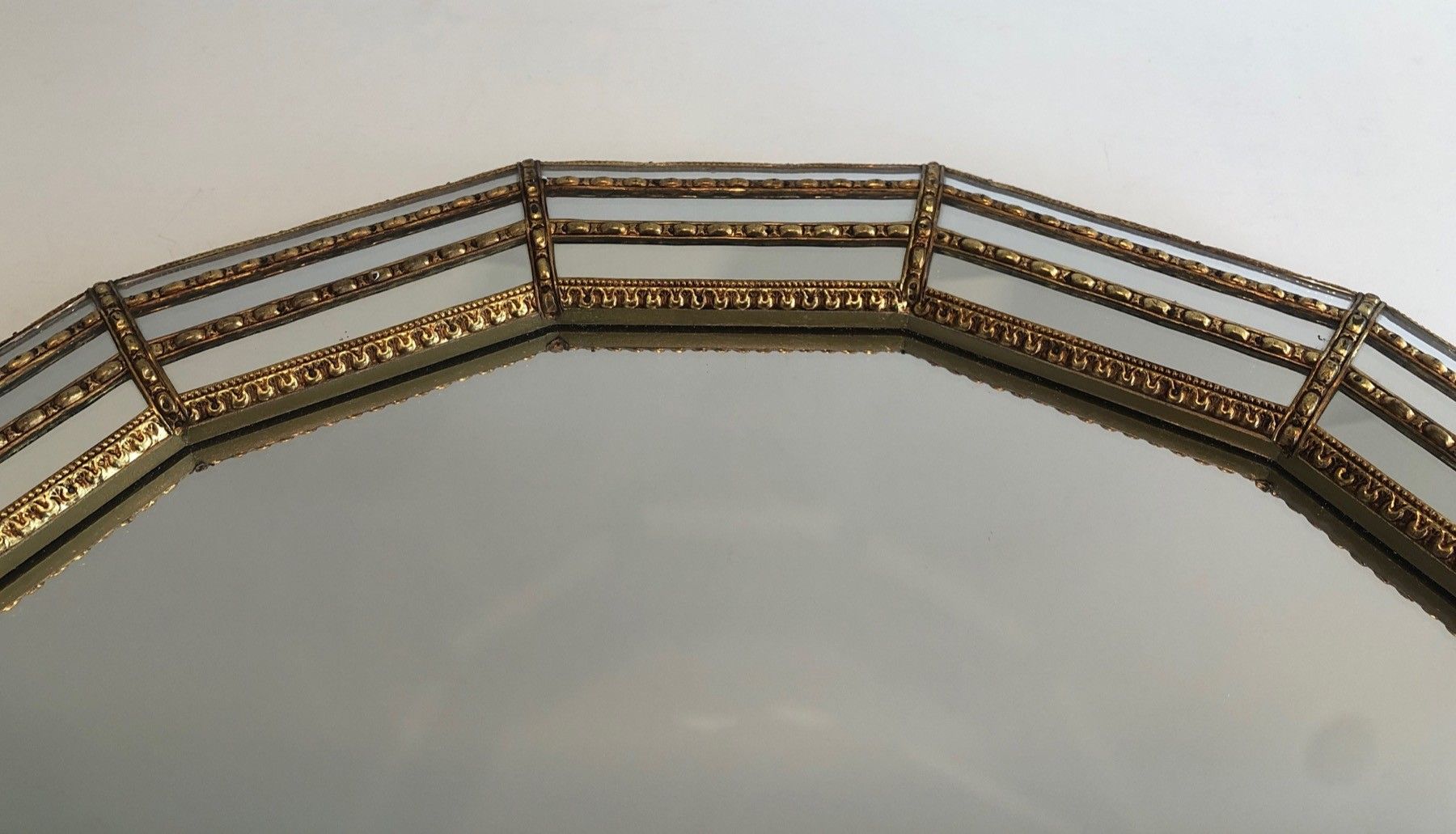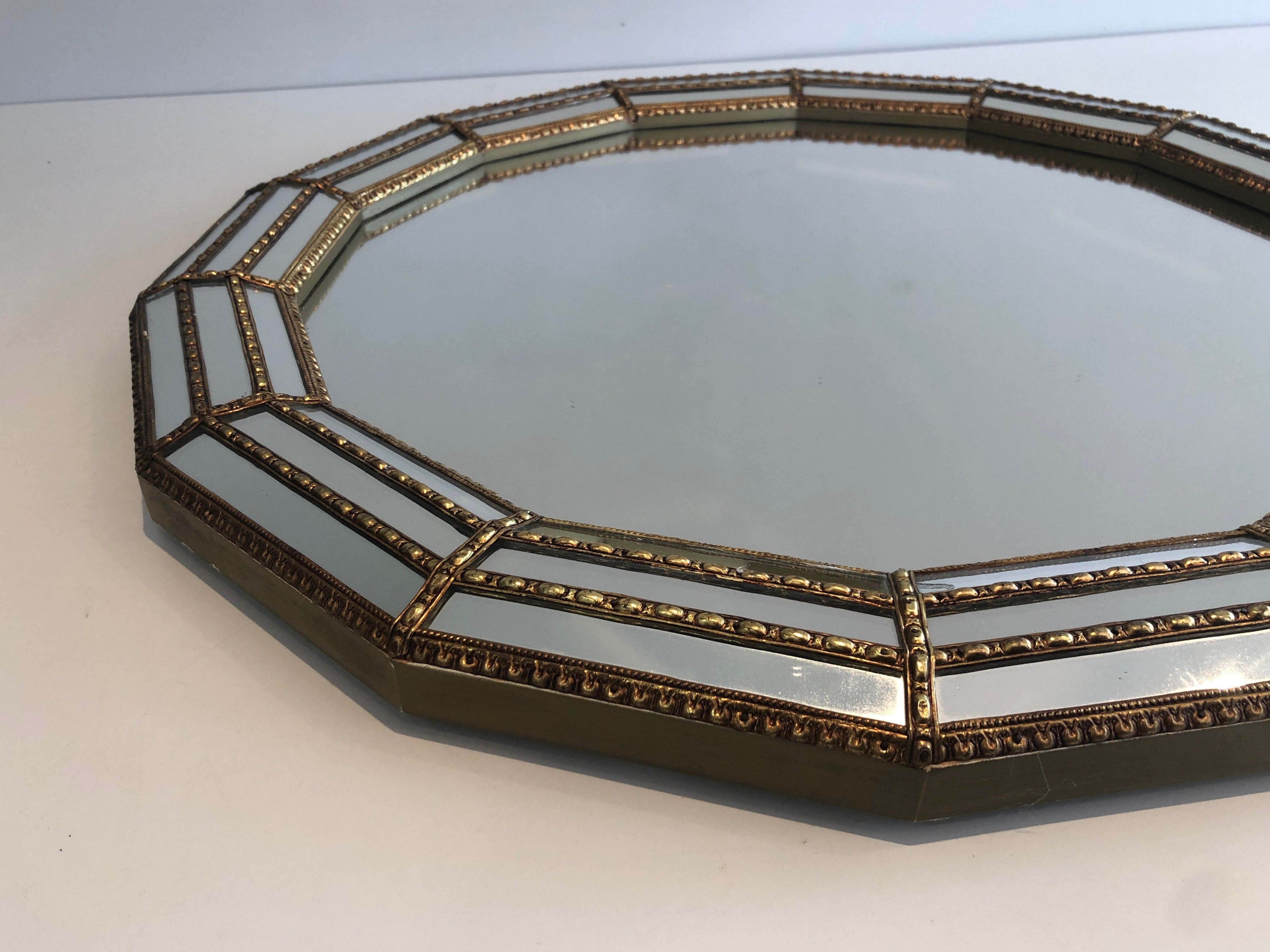 This octagonal wall mirror features a multi-faceted architectural structure. The assembly scheme revolves around a large central mirror plate, bordered by an angled frame consisting of eight peripheral mirror sections. The various glass panels are set and secured by a gilded brass frame, finely detailed with a raised continuous garland motif. This angled arrangement of the borders multiplies the reflections and adds depth and volume to the object. This type of multi-faceted construction, a direct legacy of 18th and 19th-century Venetian mirror making, experienced a significant reinterpretation in the mid-20th century. In the 1950s and 1960s, the Hollywood Regency movement and revived neoclassicism brought these brass-lined geometric mirrors back into fashion. Good overall condition. The brass frame shows natural oxidation and an even patina of use. The mirror silvering is well-preserved, with possible minor oxidation spots inherent to the age of the glass.