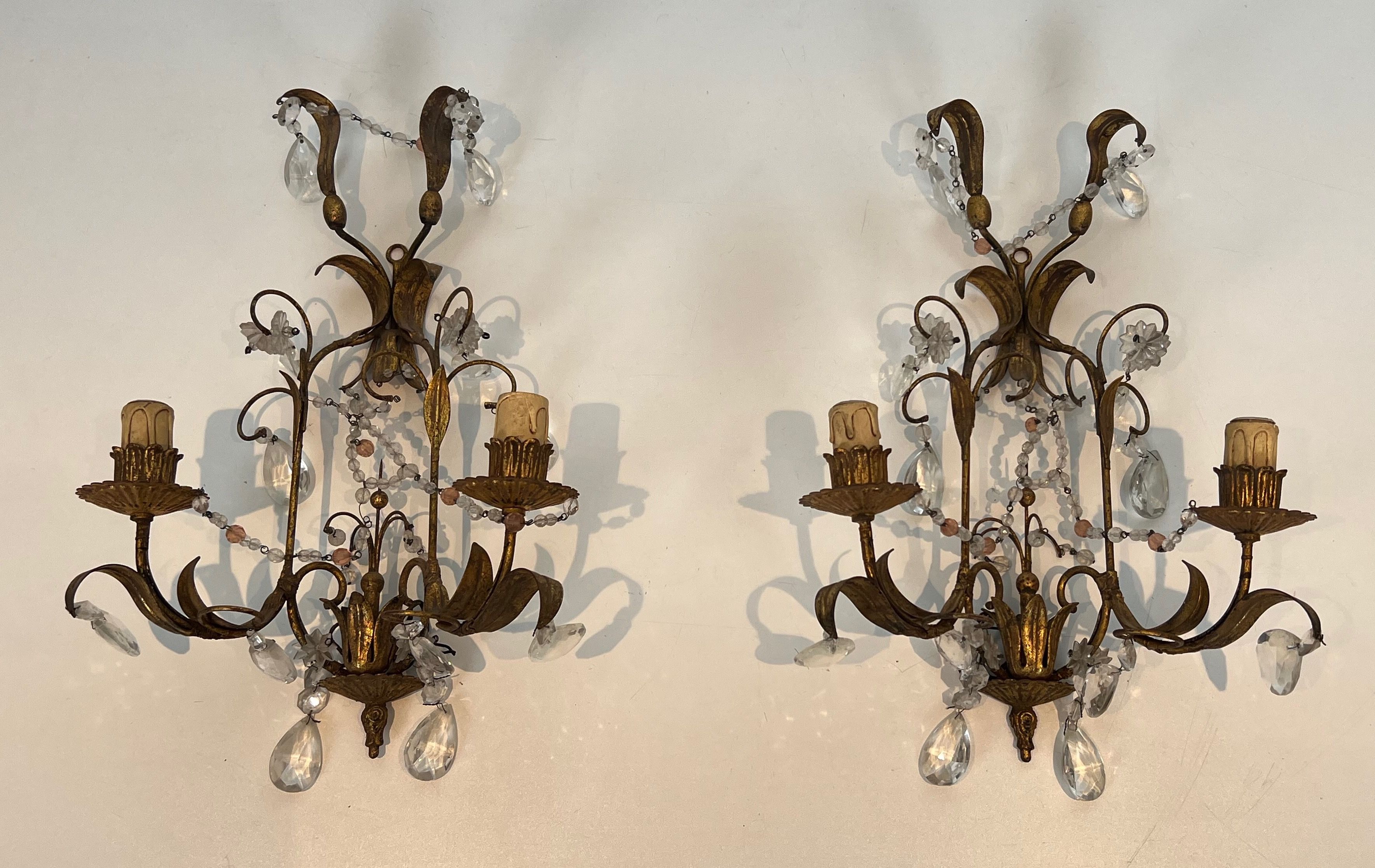 Pair of gilded metal and crystals wall sconces. French work in the style of Maison Baguès