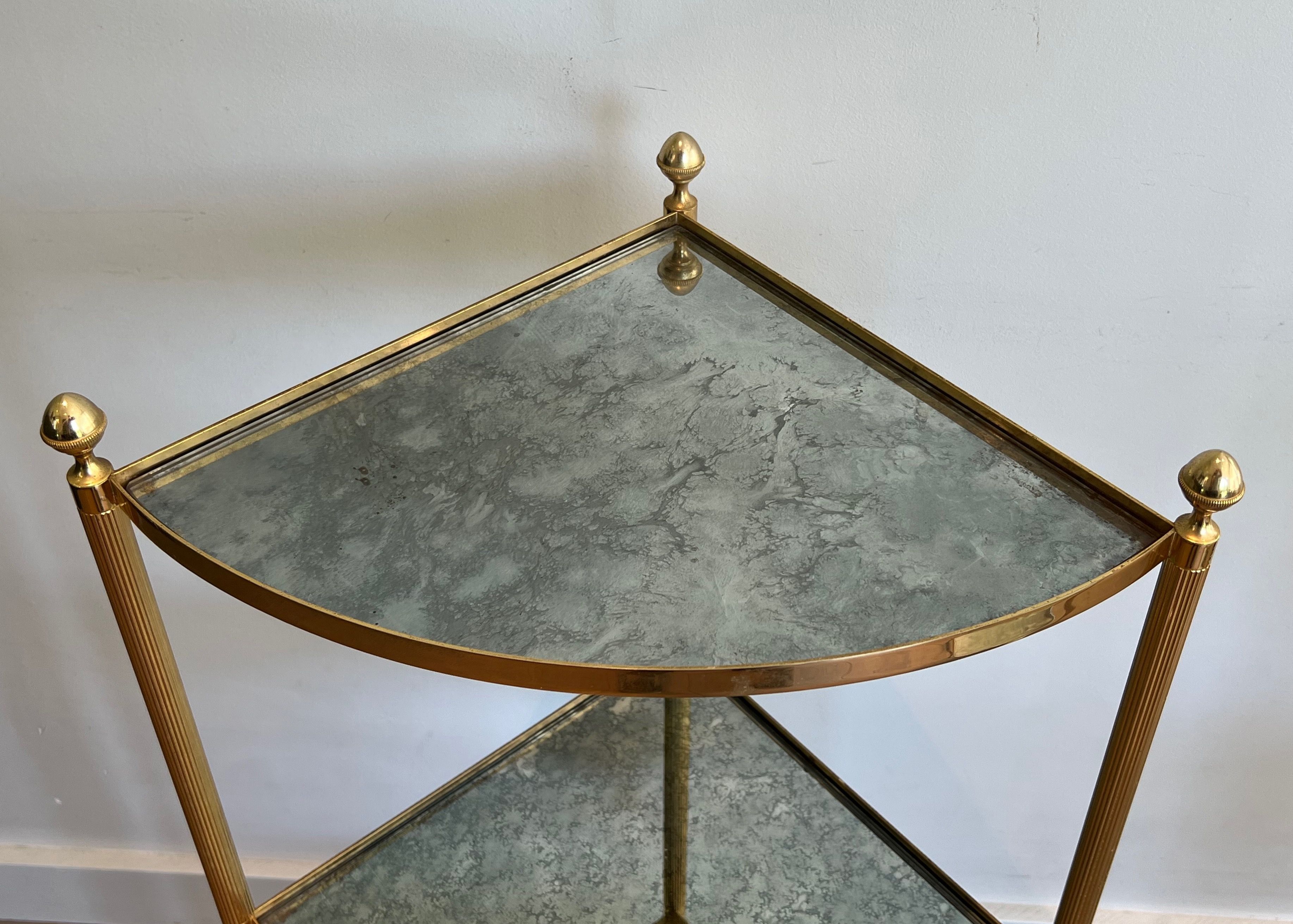 Pair of gilt metal corner side tables with eglomized mirror shelves. French work in the style of Maison Jansen. Circa 1940