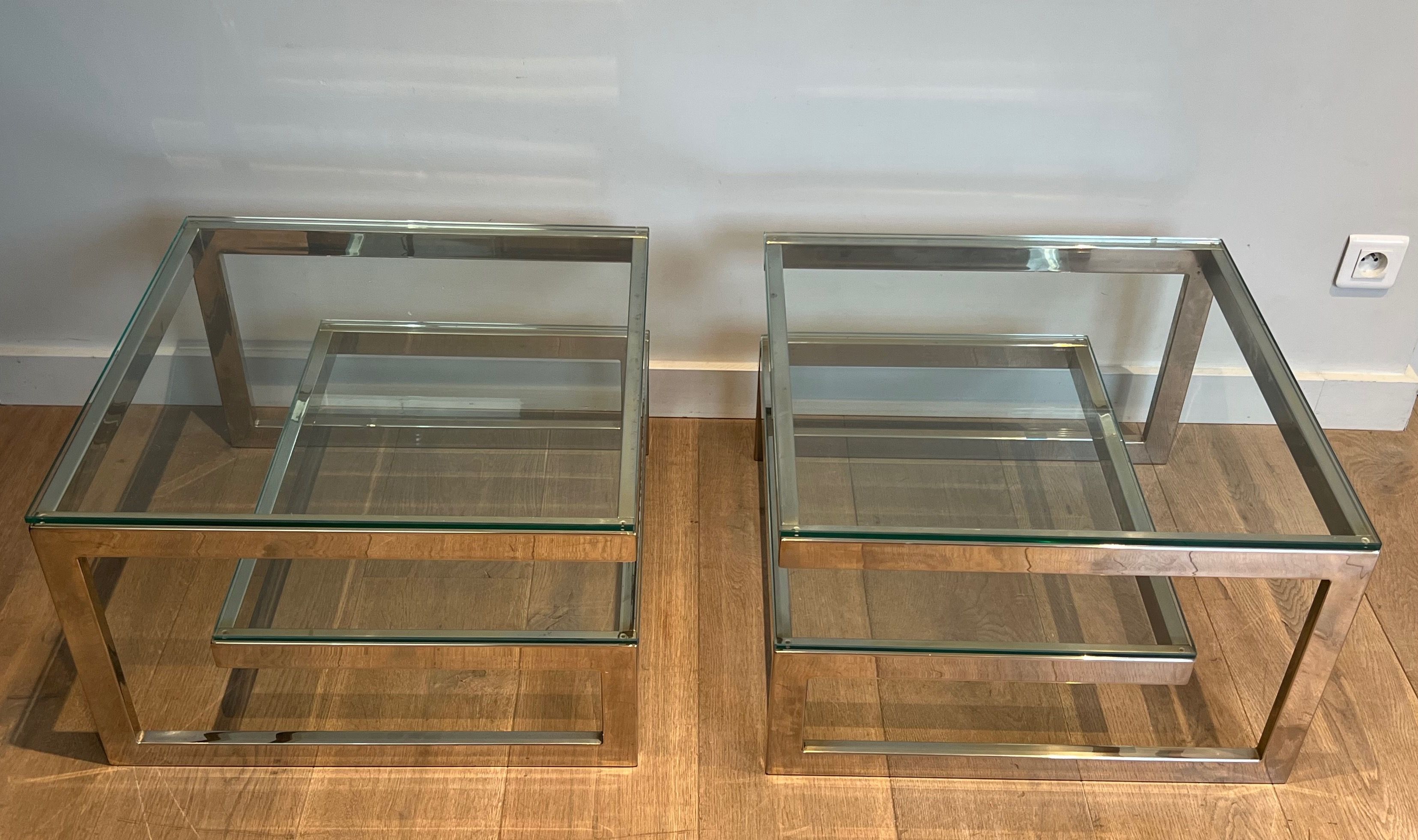 Pair of Design Chrome Side TablesPair of Design Chrome Side Tables with thick glass shelves. French work. Circa 1970Request priceDimensionsWidth23.62 inch60 cmDepth23.62 inch60 cmHeight14.96 inch38 cmInformationProduct code50's-55529