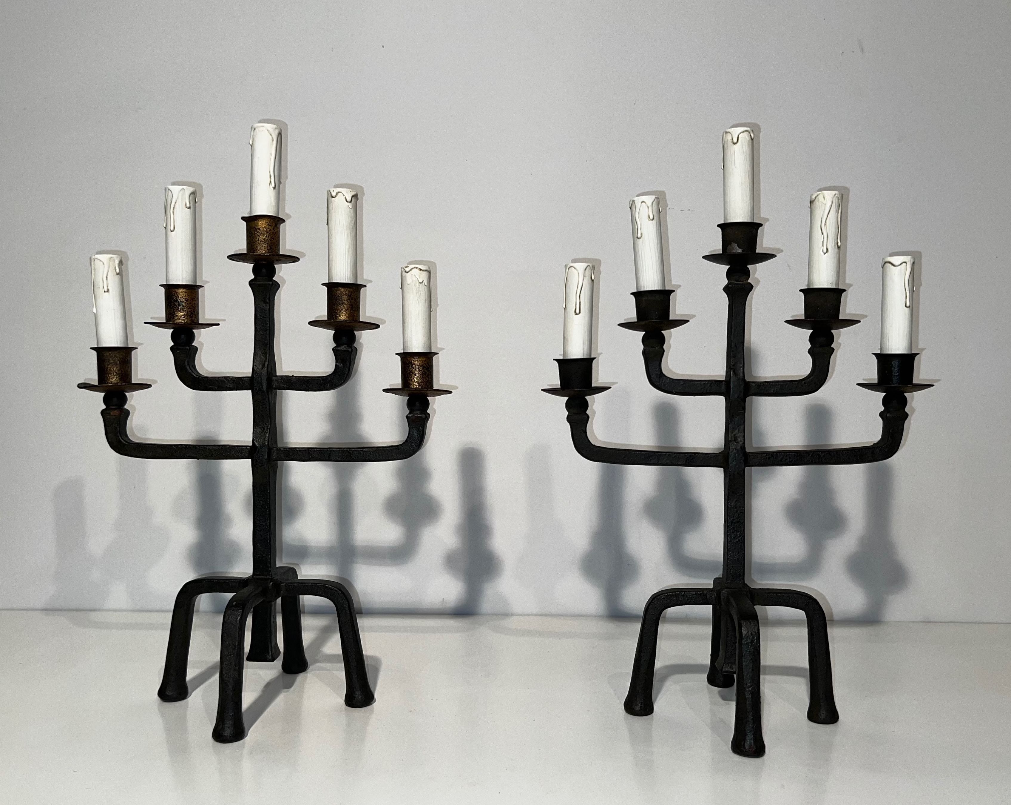 Pair of 5 Arms Wrought Iron CandelabrasPair of 5 arms patinated and gilt wrought iron candelabras. French work. Circa 1940Request priceDimensionsWidth14.17 inch36 cmDepth8.27 inch21 cmHeight18.5 inch47 cmInformationProduct codeTL-589