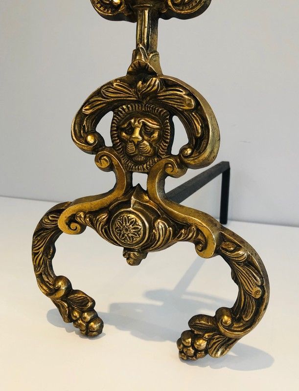 Pair of Neoclassical Style Bronze and Wrought IronAndirons with Lions Faces
