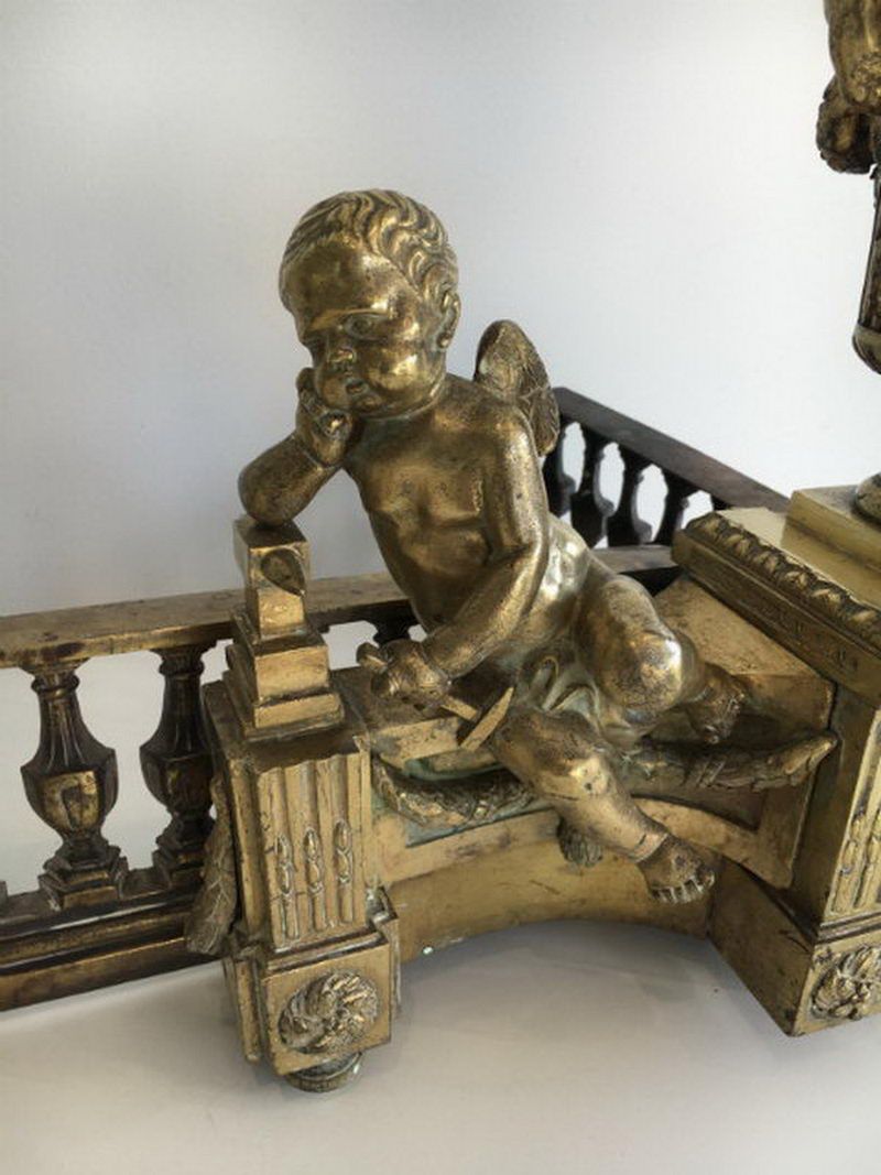 Beautiful Chiseled Bronze Andirons Representing March holding an helmet and Vulcan working with an anvil. Circa 1850
