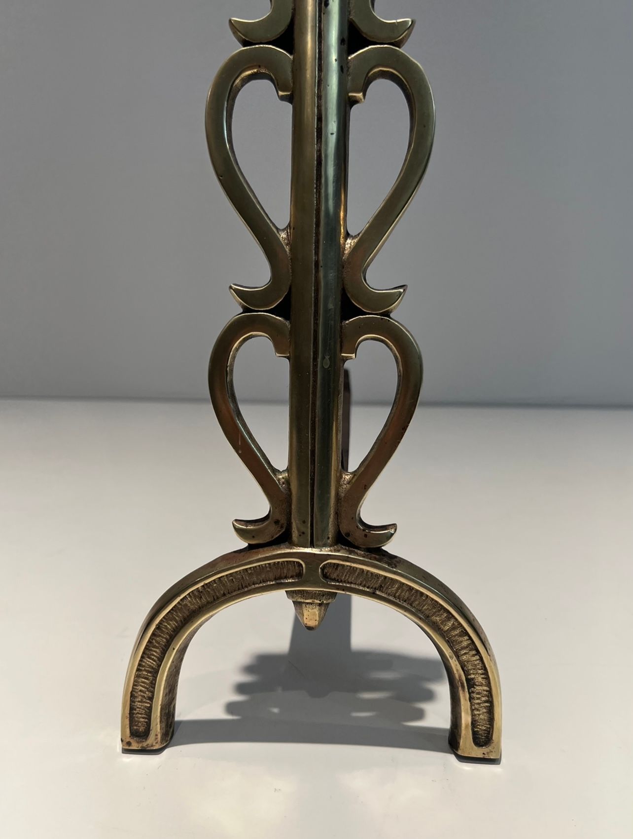 Pair of brass and wrought iron andirons. French work in the style of Raymond Subes. . Circa 1940