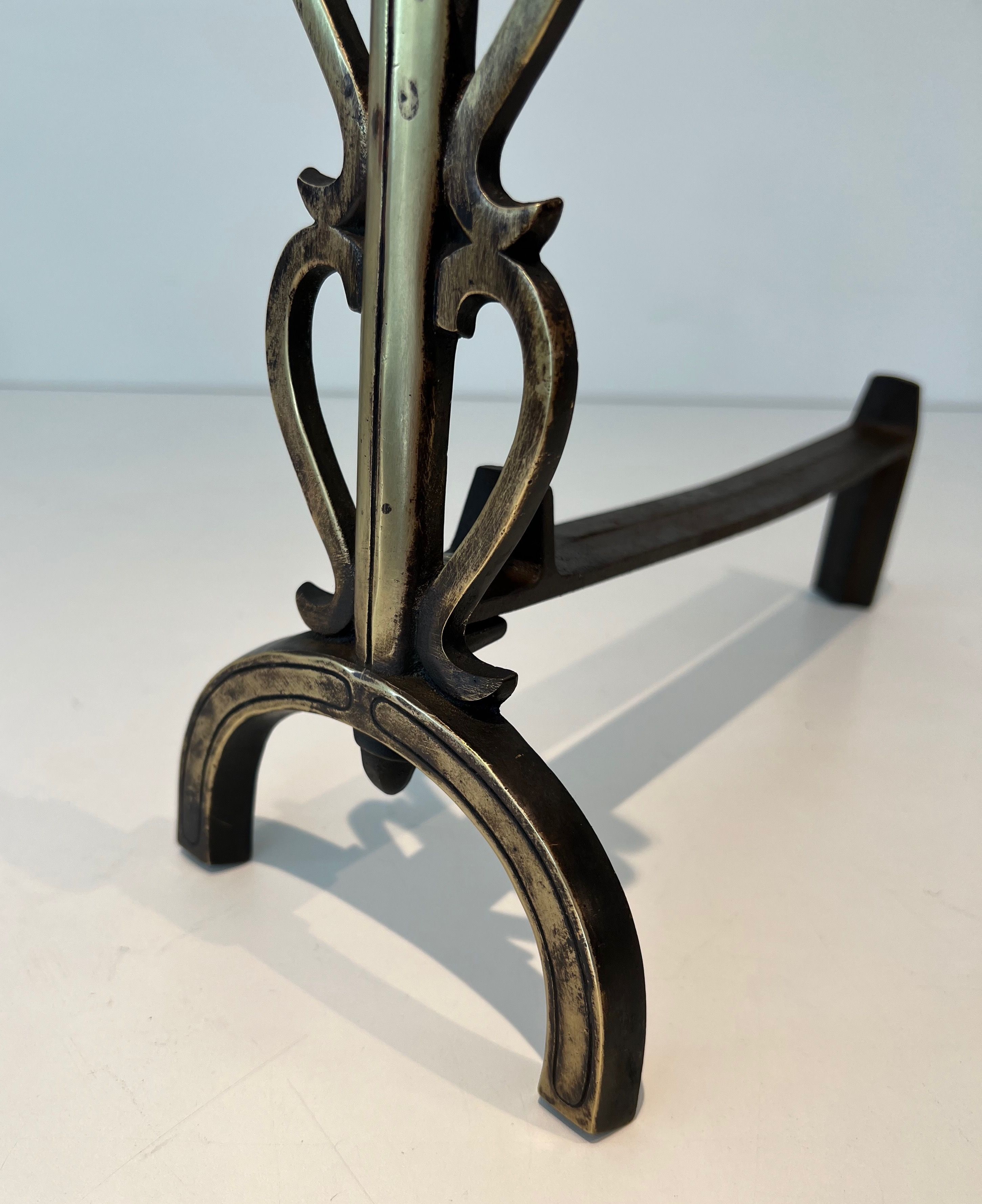 Pair of brass and wrought iron andirons. French work in the style of Raymond Subes. . Circa 1940