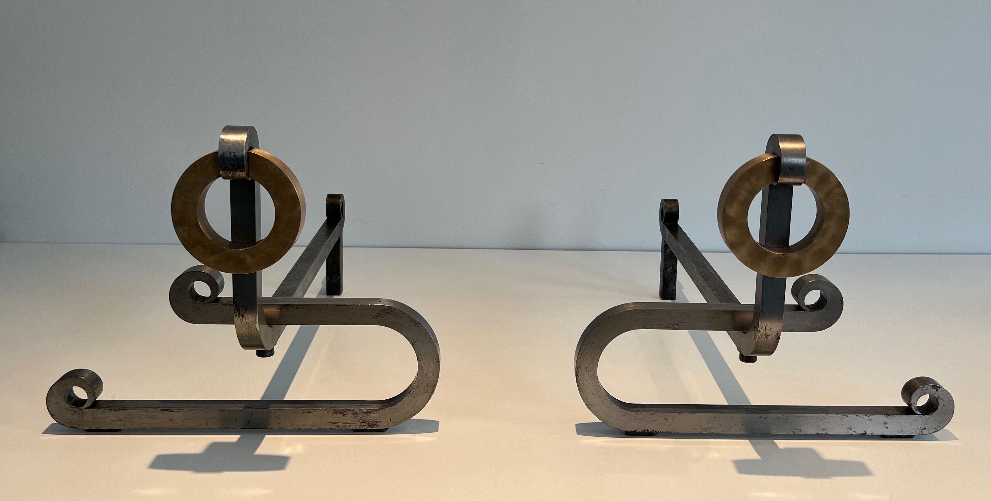 Pair of Modernist Chromed Steel and Iron AndironsPair of Modernist Chromed Steel, Brass and Iron Andirons. French work. Circa 1970Request priceDimensionsWidth13.78 inch35 cmDepth21.65 inch55 cmHeight11.61 inch29.5 cmInformationProduct codeFP-6458