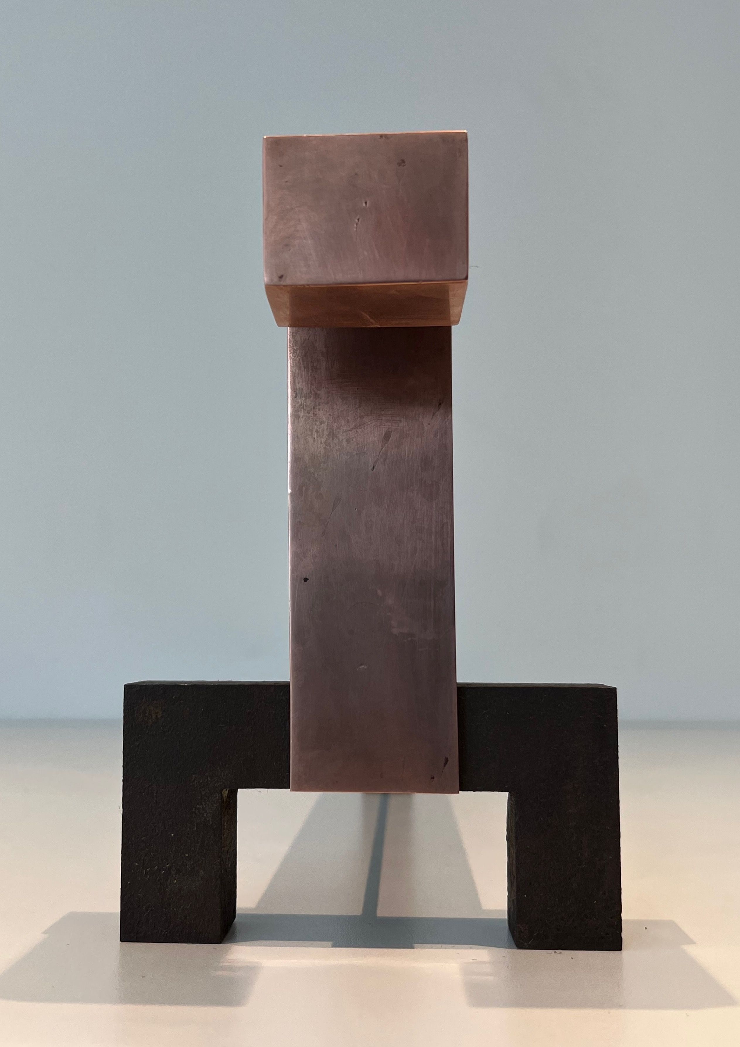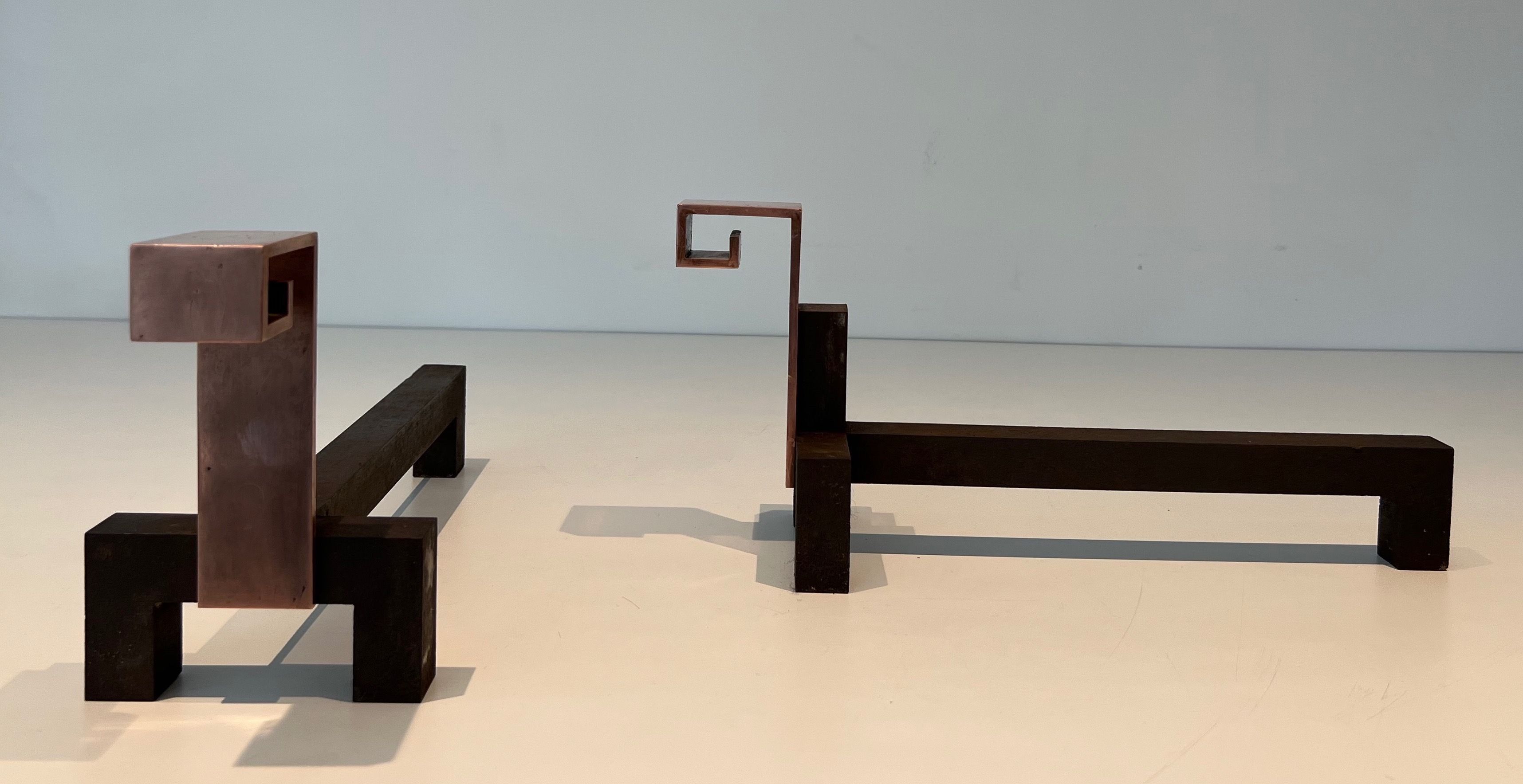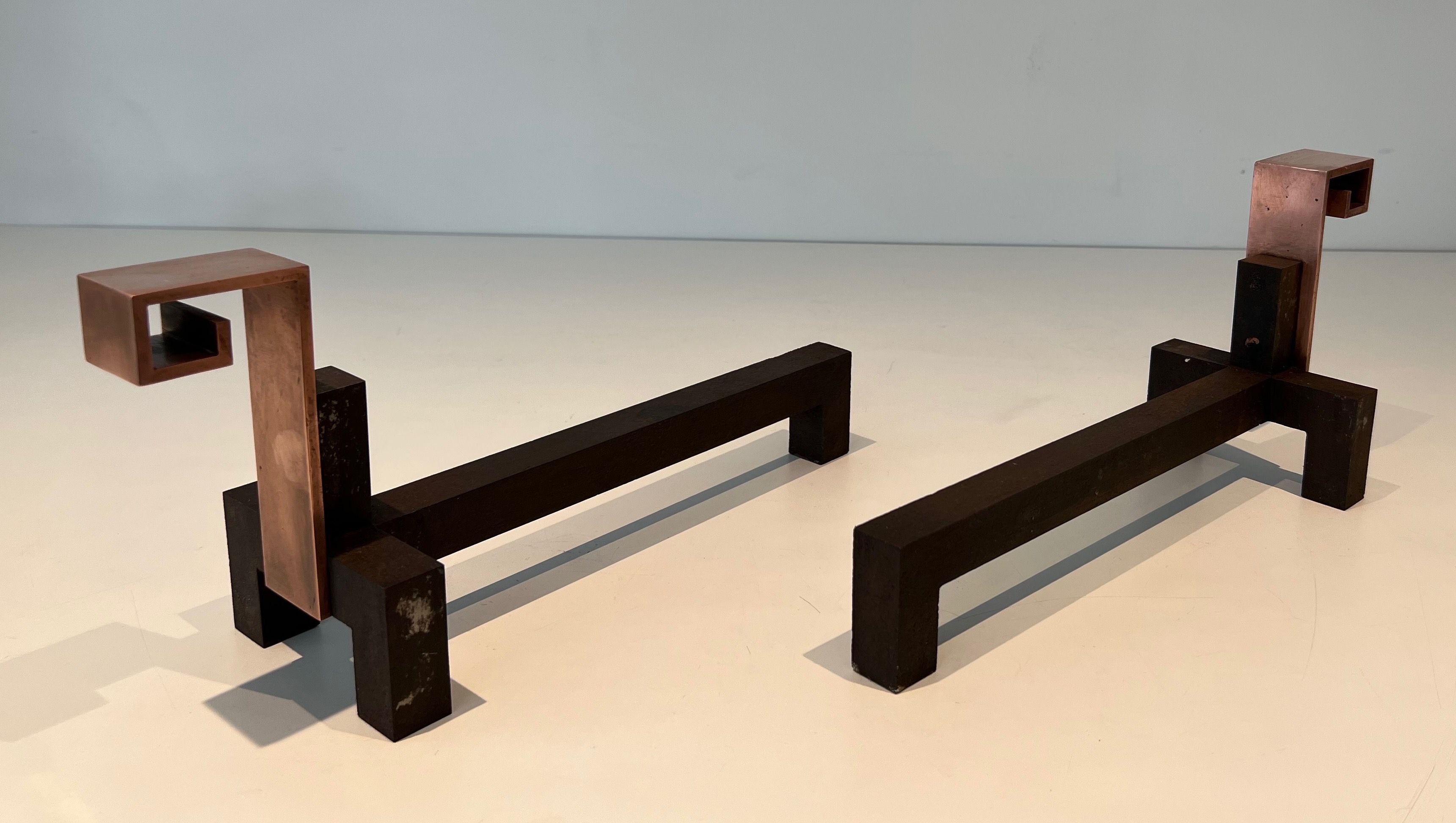 Pair of Modernist Copper and Wrought Iron AndironsPair of modernist copper and wrought iron andirons. French work. Circa 1970Request priceDimensionsWidth4.72 inch12 cmDepth14.96 inch38 cmHeight6.69 inch17 cmInformationProduct codeFP-7927