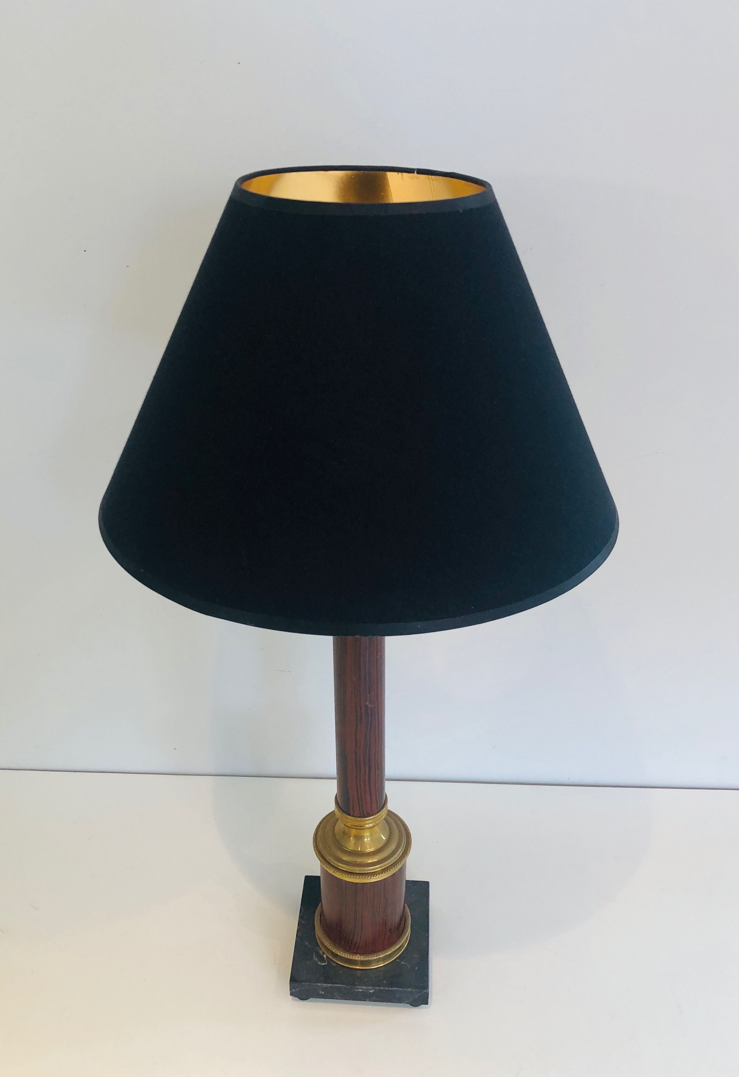 Pair of neoclassical style faux-bois metal and brass table lamps. French work. Circa 1940