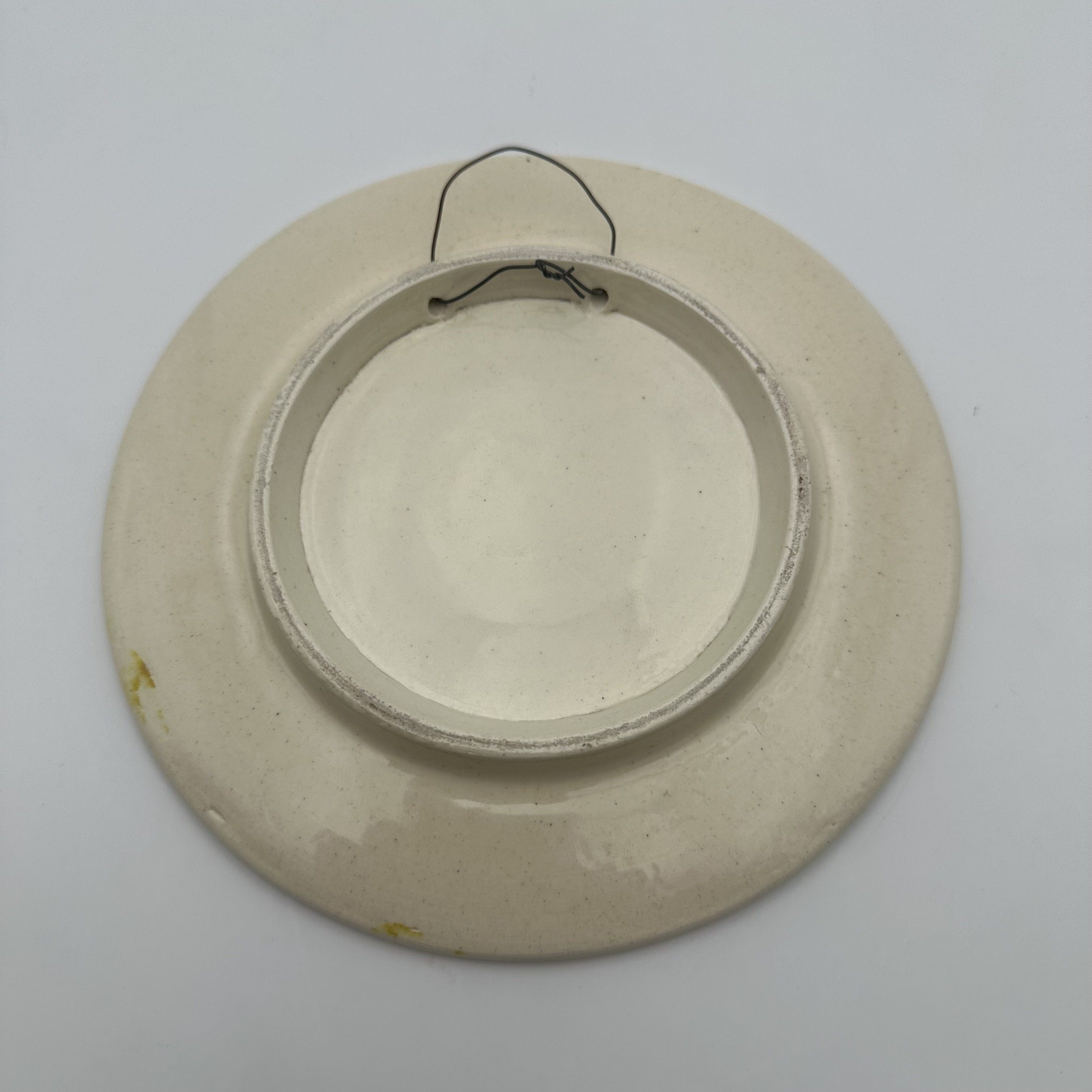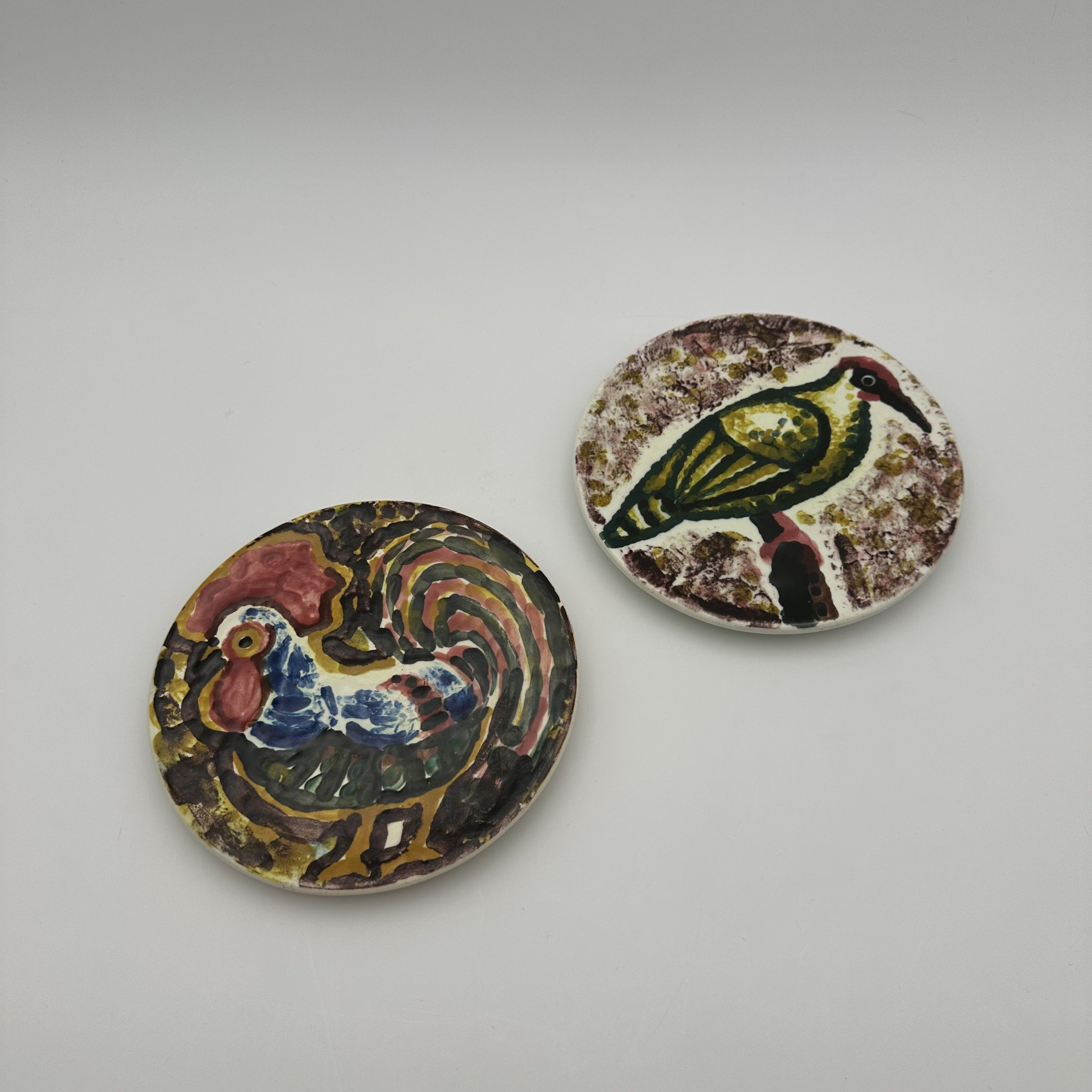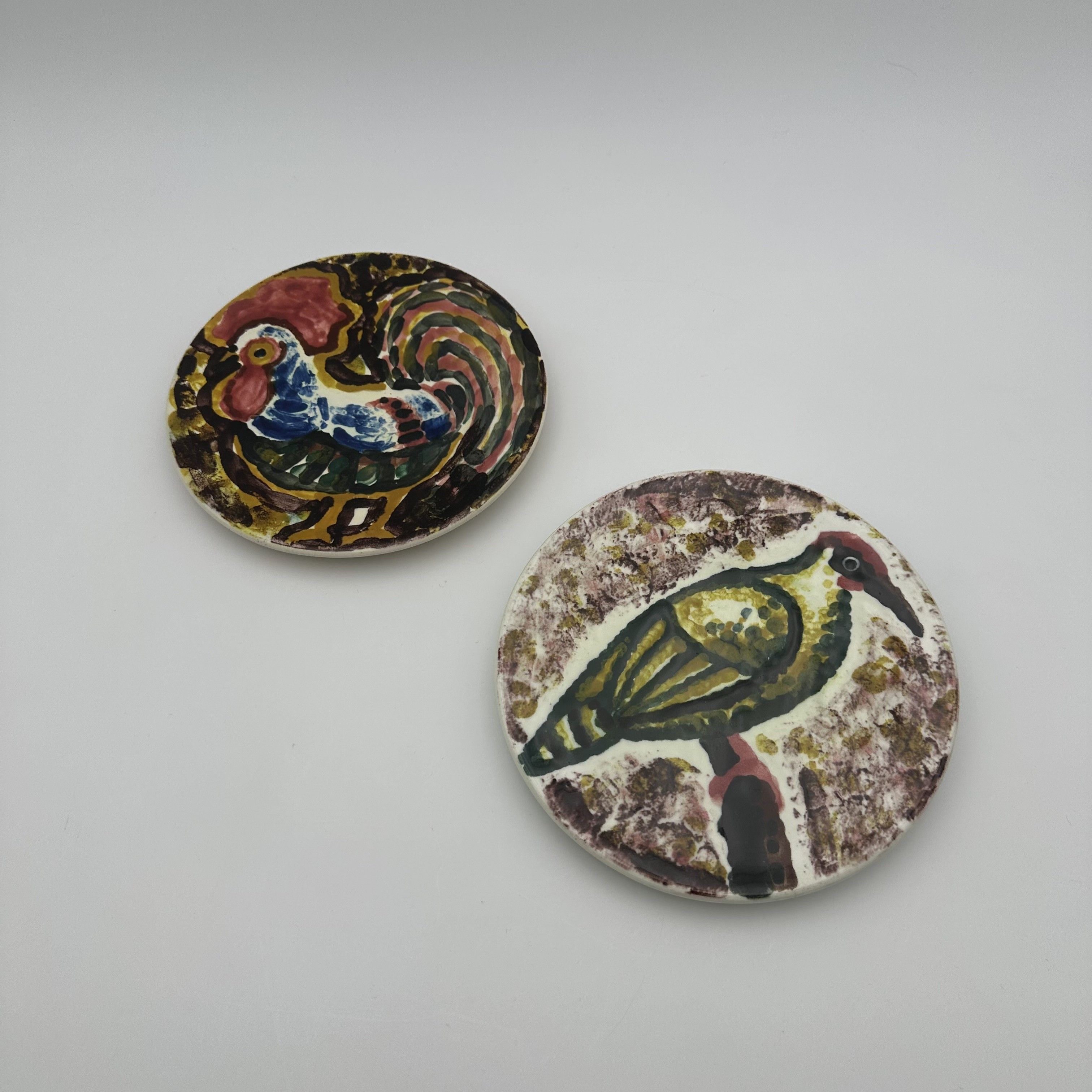 This delightful pair of small ceramic plates brilliantly illustrates the vitality and joy of life that characterize post-war French pottery. Strongly imbued with the Mediterranean spirit and the artistic revival driven by the Vallauris workshops, these pieces are perfectly in line with the creations of the famous ceramist Roger Capron or the Madoura studio. Each plate reveals a hand-painted animal motif, outlined with expressive black strokes and filled with vibrantly colored glazes. One features a proud rooster with abundant plumage, highlighted in red, blue, and yellow—a quintessential motif of the modernist bestiary. The other showcases a stylized green and yellow bird perched on a branch against a subtly speckled purple background. The brushstrokes, free, spontaneous, and deliberately naive, elevate these works to the status of true small ceramic paintings. Offered in beautiful vintage condition, this colorful set will bring an undeniable sunny and artistic touch to your decor. These pieces can be used as precious catch-alls, displayed on a console table, or fitted with plate hangers to create a very 'Mid-Century' wall composition.