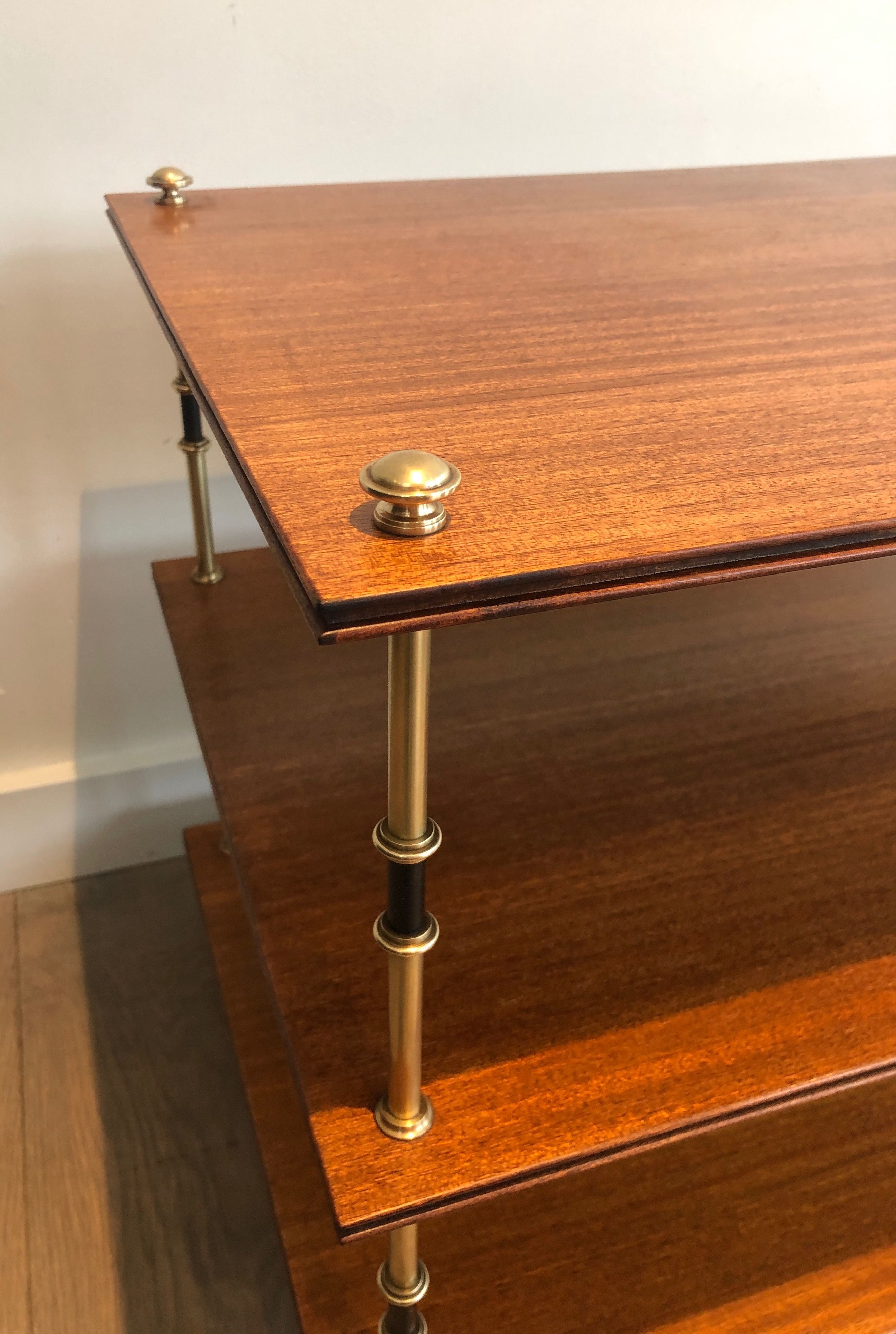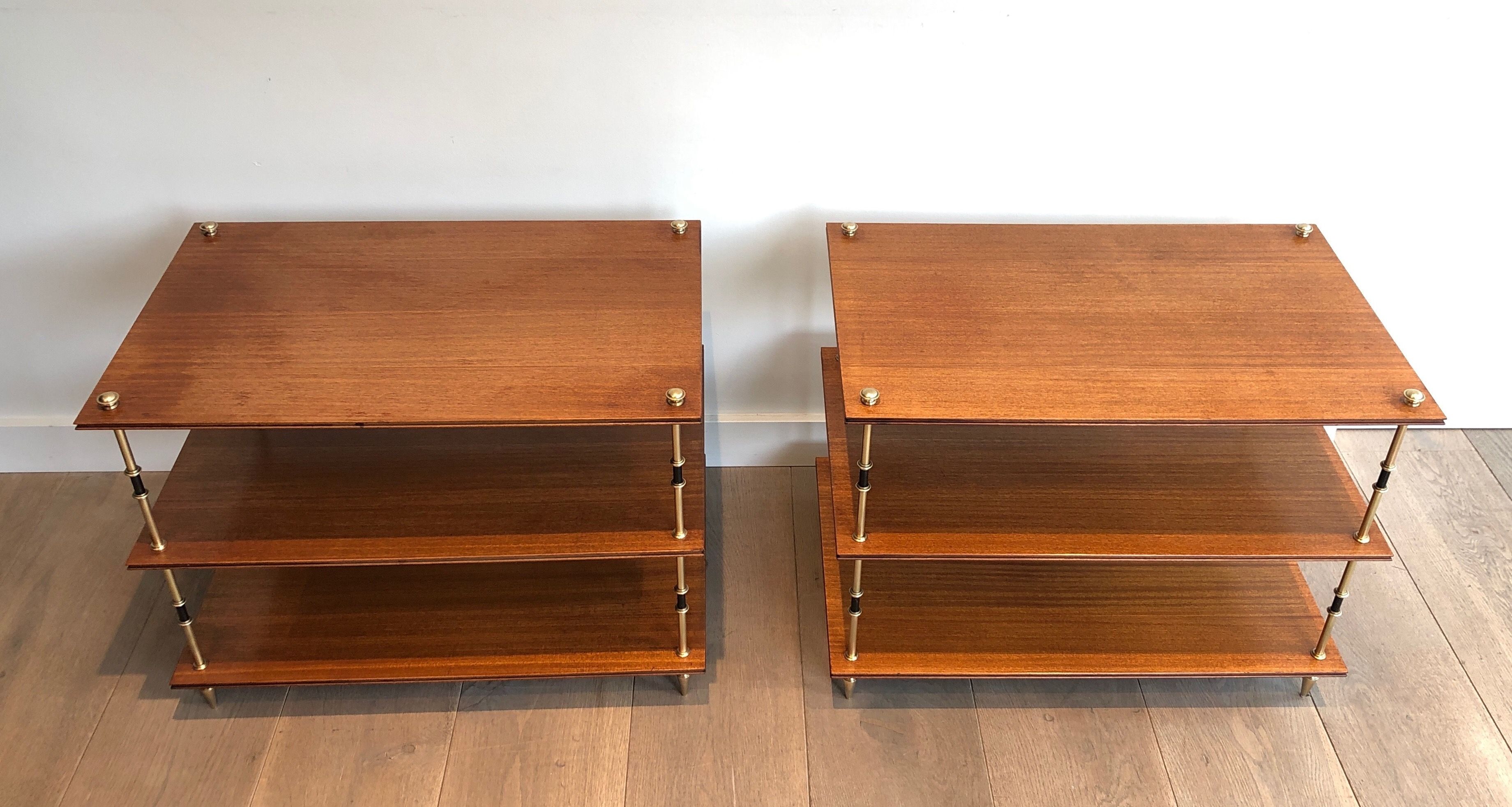 Pair of mahogany and brass three tiers console or side tables. French work by Maison Jansen. Circa 1940