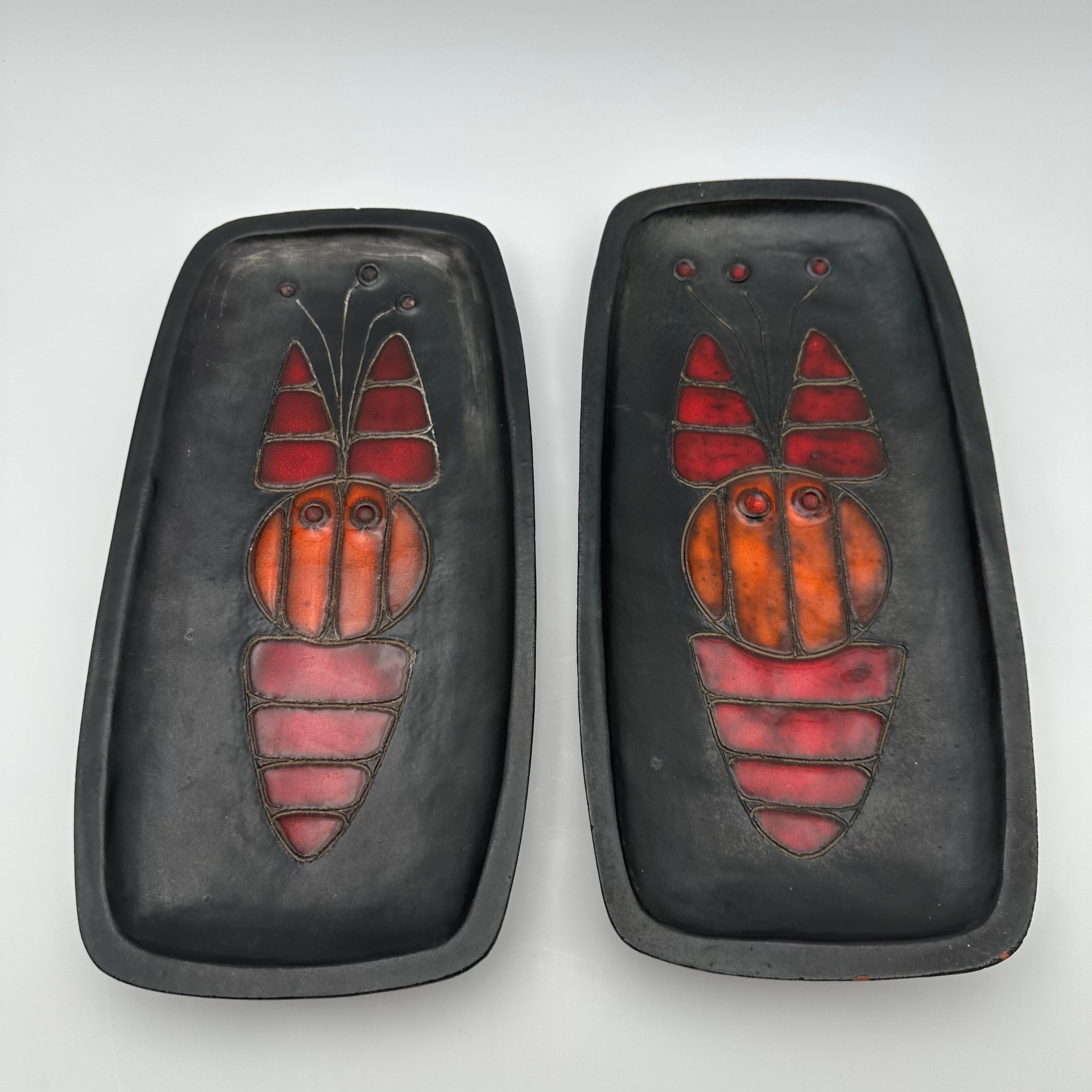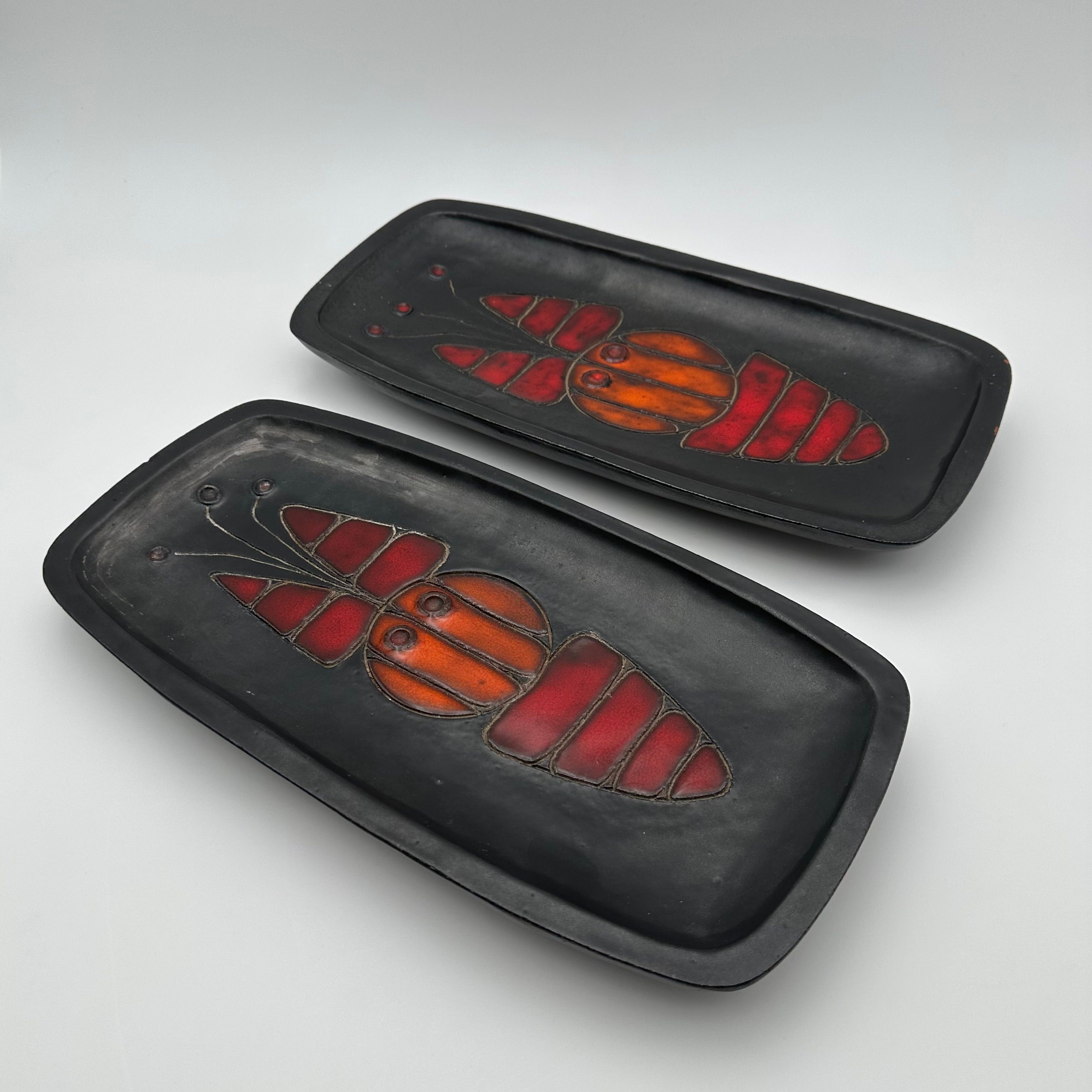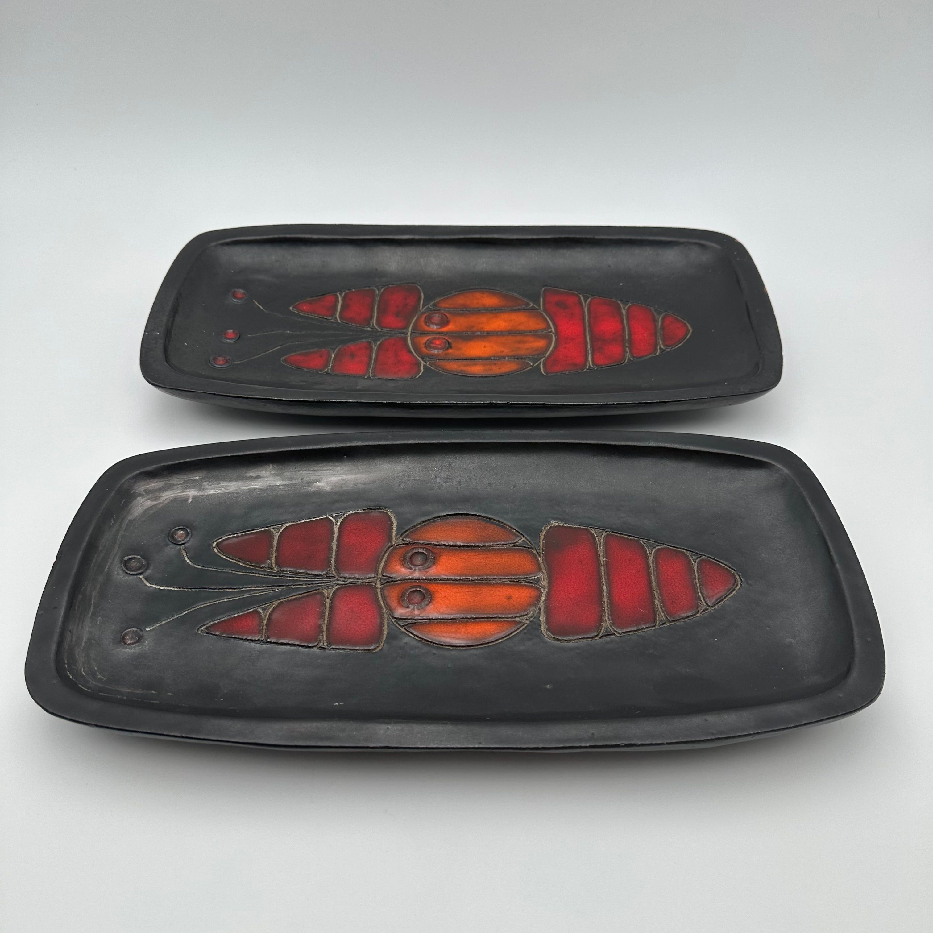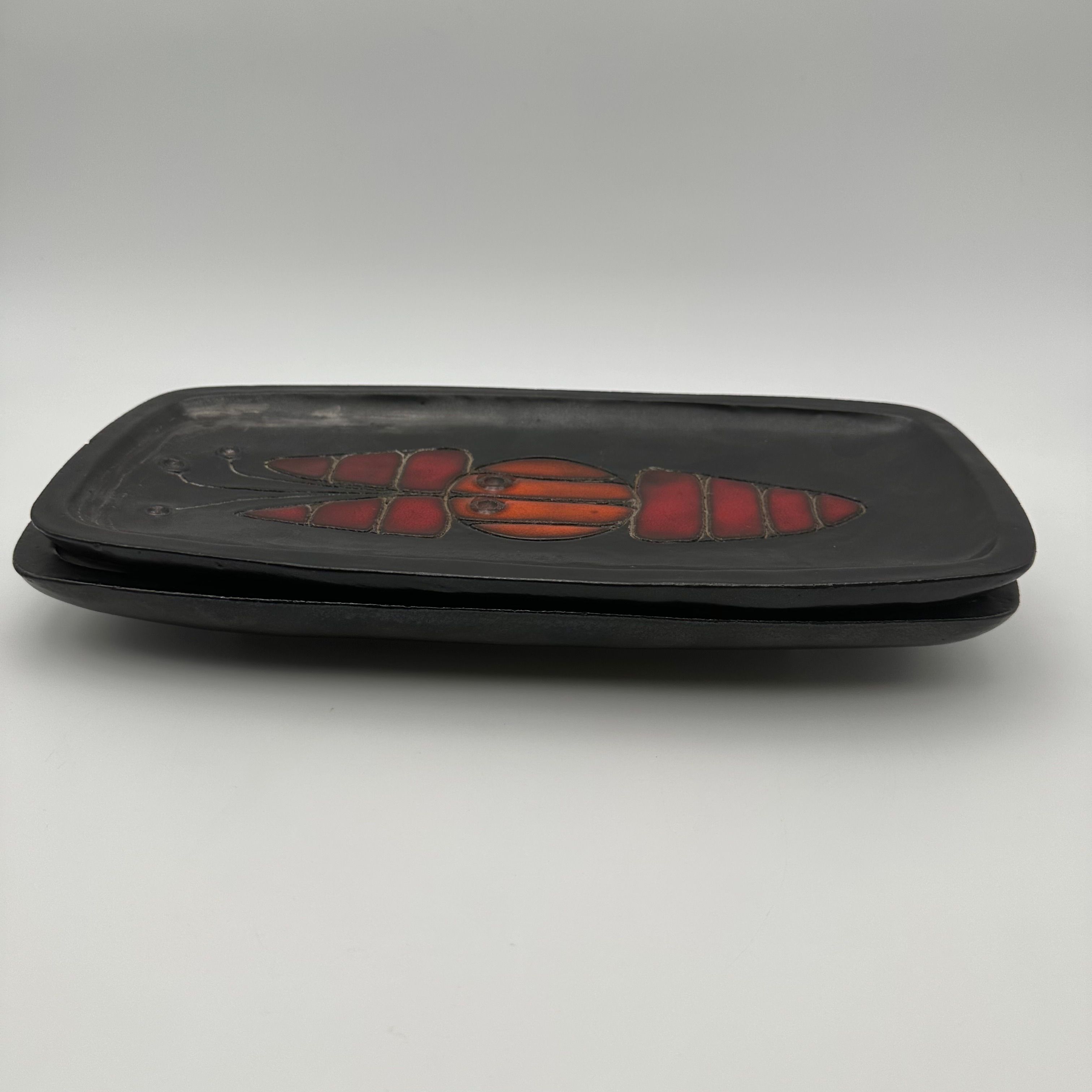 A set of two rectangular black ceramic dishes, each decorated with a stylized fish motif in warm red and orange tones. Graphic and refined, the design reflects Oswald Tieberghien’s distinctive modern aesthetic and his mastery of deep, expressive glazes.