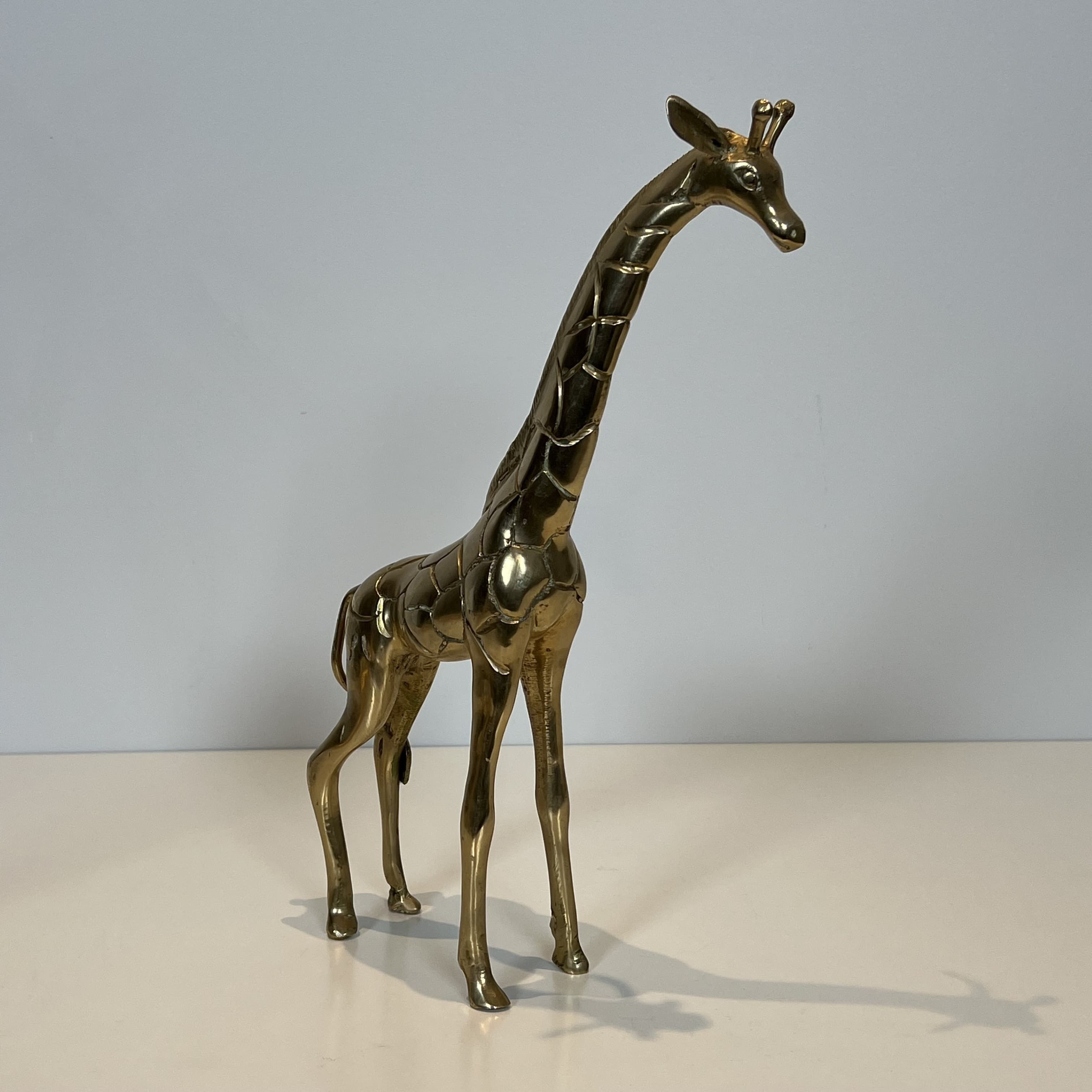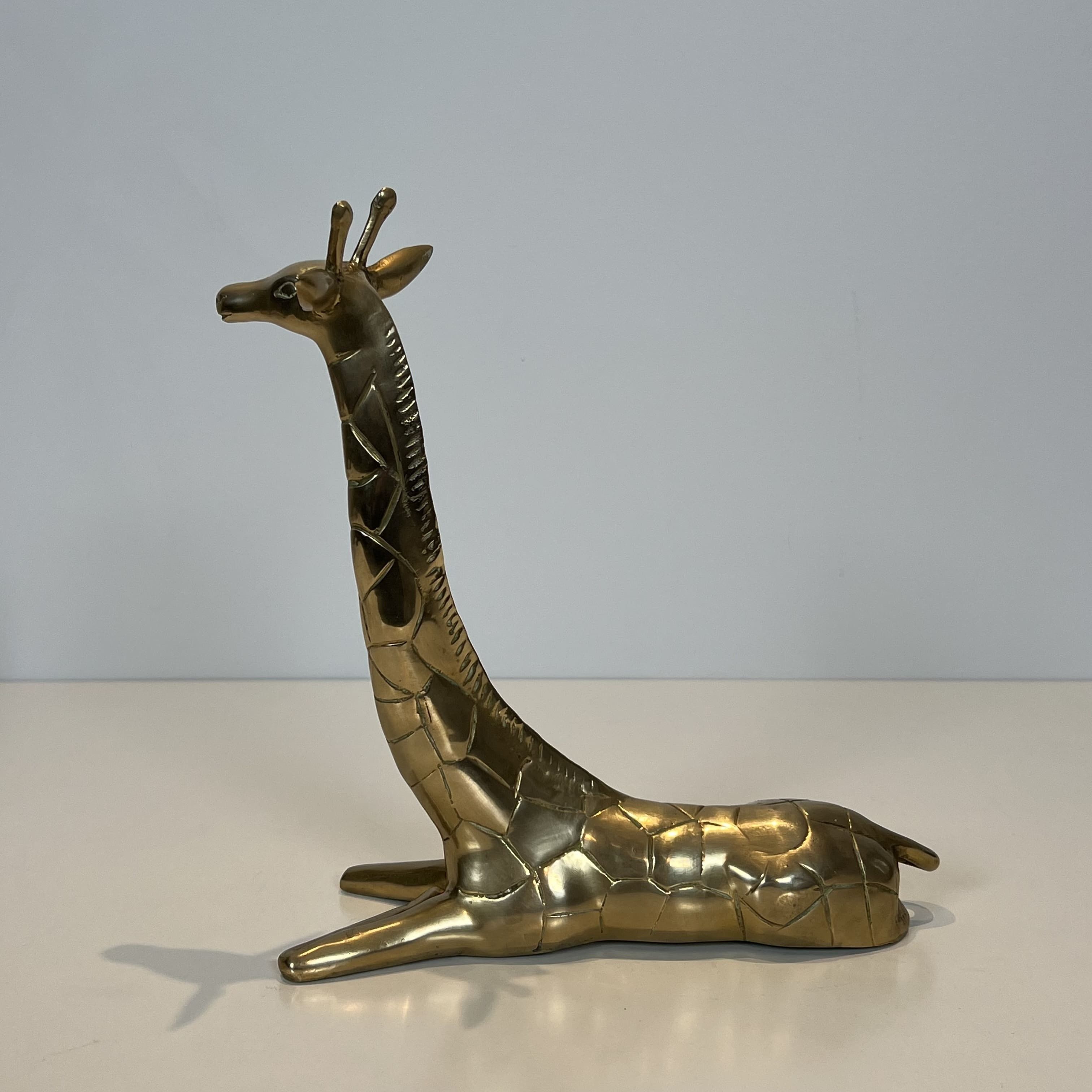 This pair of sculptures is a characteristic creation of 1970s decorative arts. The set features two giraffes in complementary postures: the first stands on all four legs, while the second is depicted lying down with its limbs folded beneath its body. The execution relies on solid cast brass. The visual interest of these pieces lies in their surface treatment: the metal, intensely polished to catch the light, is traversed by a network of incised lines accurately imitating the animal's geometric (reticulated) coat. Anatomical details (ossicones, ears, snout) are finely highlighted. During the 1970s, high-end interior decoration experienced a major craze for the 'Safari chic' aesthetic, a branch of the Hollywood Regency movement. Italian and French decorators heavily integrated polished brass and figures of African wildlife to create eclectic, luxurious, and exotic interiors. Condition report: Very good overall condition. The brass displays a preserved shine, with minute traces of natural oxidation in the recesses of the chasing, accentuating the relief of the pattern.
