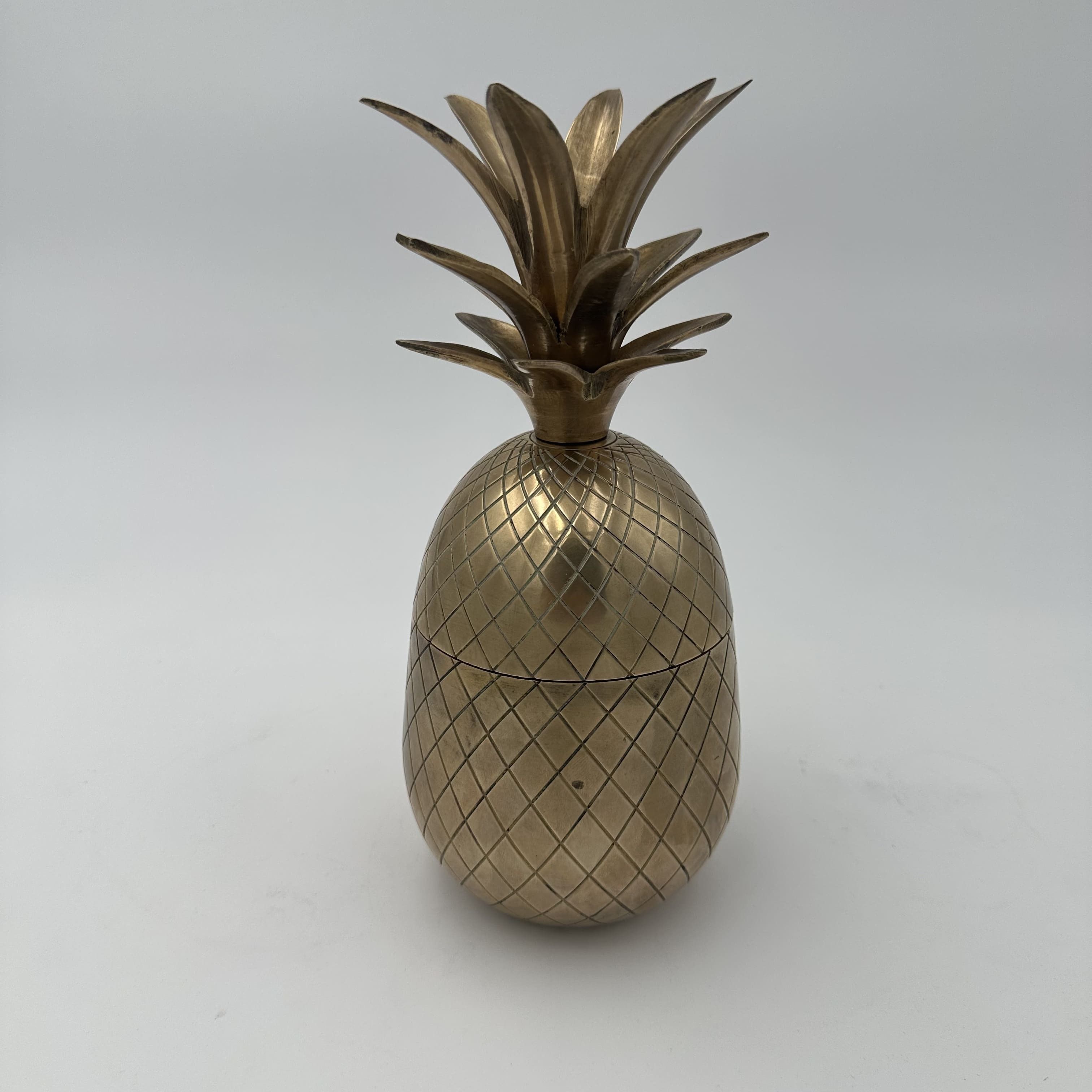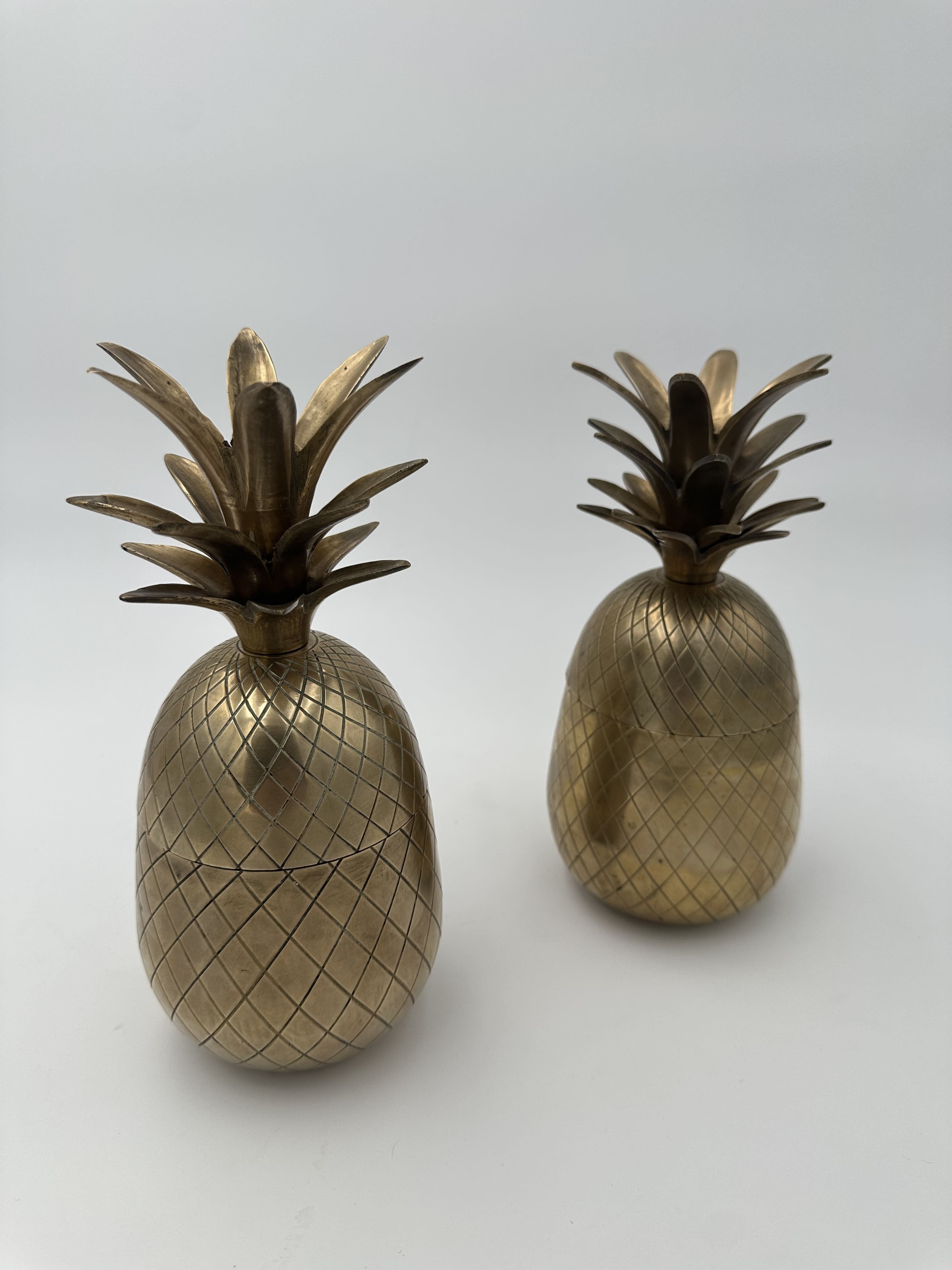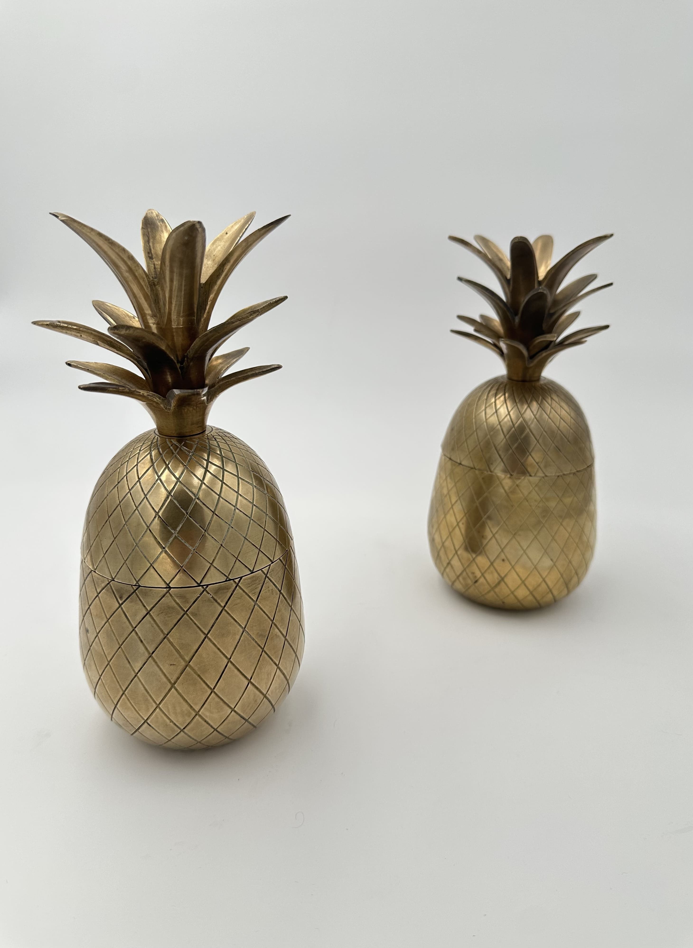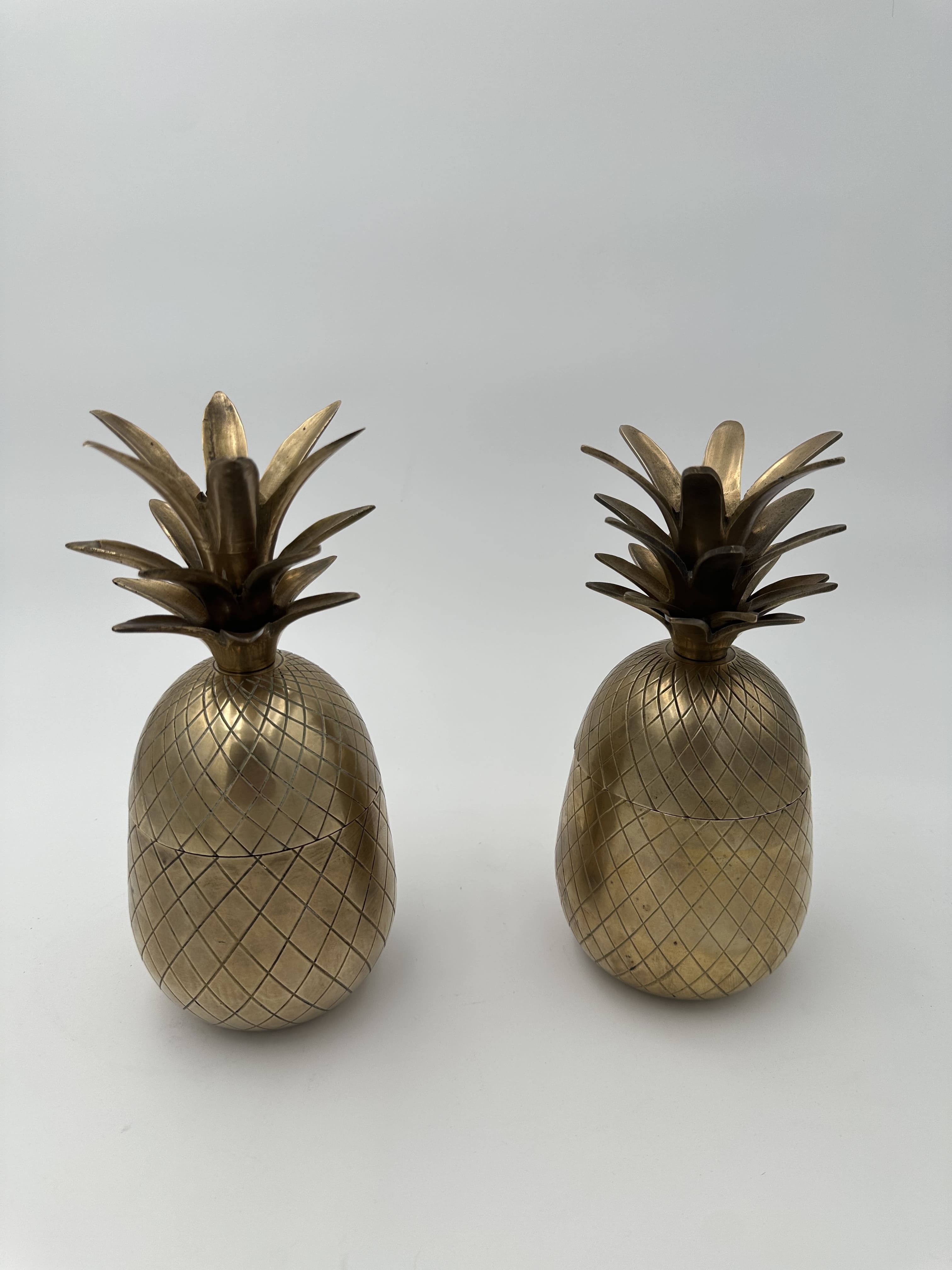 This pair of bar accessories belongs to the luxury metalwork and tableware of the 1970s. The structural design of each piece takes the shape of a pineapple, composed of two solid brass hemispheres that interlock at mid-height. The surface of the body is entirely chased with a geometric network (lozenge crosshatches) strictly imitating the texture of the fruit's rind. The upper section, serving as a removable lid, is crowned with an imposing tuft of serrated cast brass leaves. The pineapple motif, a classic symbol of hospitality since the 18th century, experienced a major surge in popularity in 1970s decorative arts driven by the Hollywood Regency movement. This pair follows the strict lineage of luxurious Italian productions by Mauro Manetti (Fonderia d'Arte Firenze) or Parisian editions by Maison Charles. Good overall condition. The brass displays a preserved shine and a natural patina of use, with discreet traces of oxidation in the recesses of the chasing. The opening mechanism is functional.