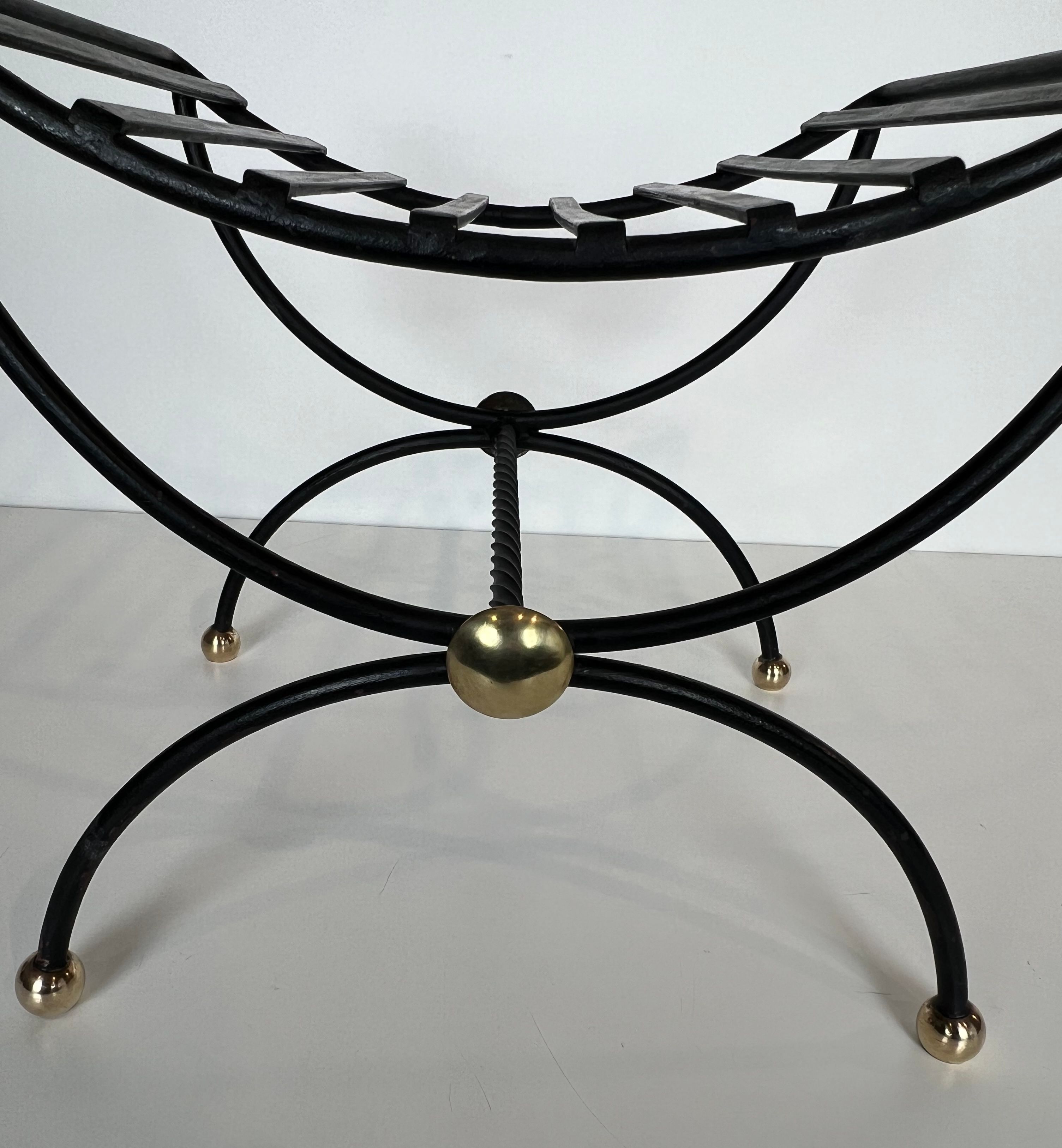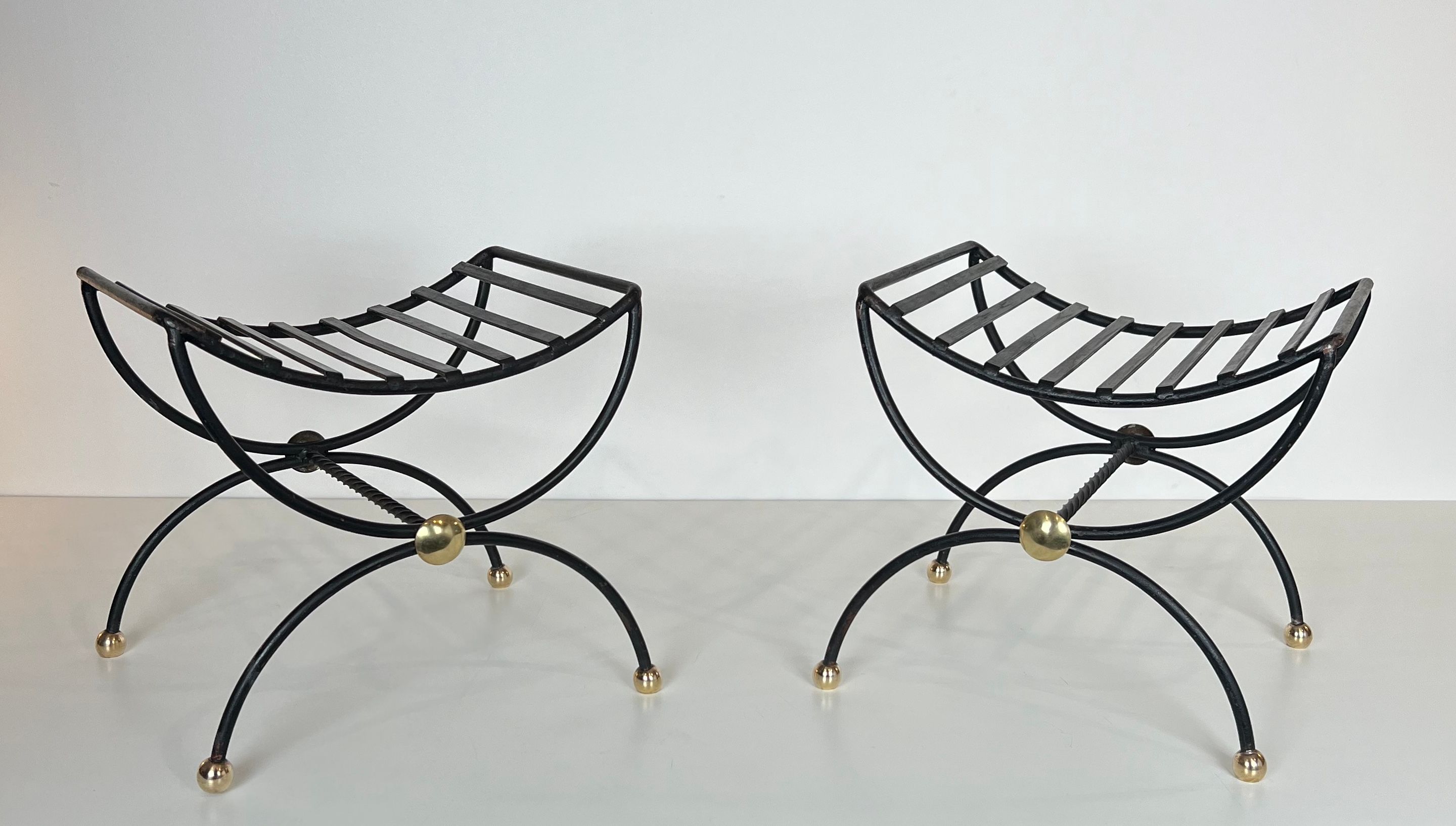 Pair of Design Wrought Iron and Brass Curule StoolsPair of design wrought iron and brass curule stools. French work. Circa 1950Request priceDimensionsWidth16.73 inch42.5 cmDepth13.98 inch35.5 cmHeight15.16 inch38.5 cmInformationProduct code50's-59403