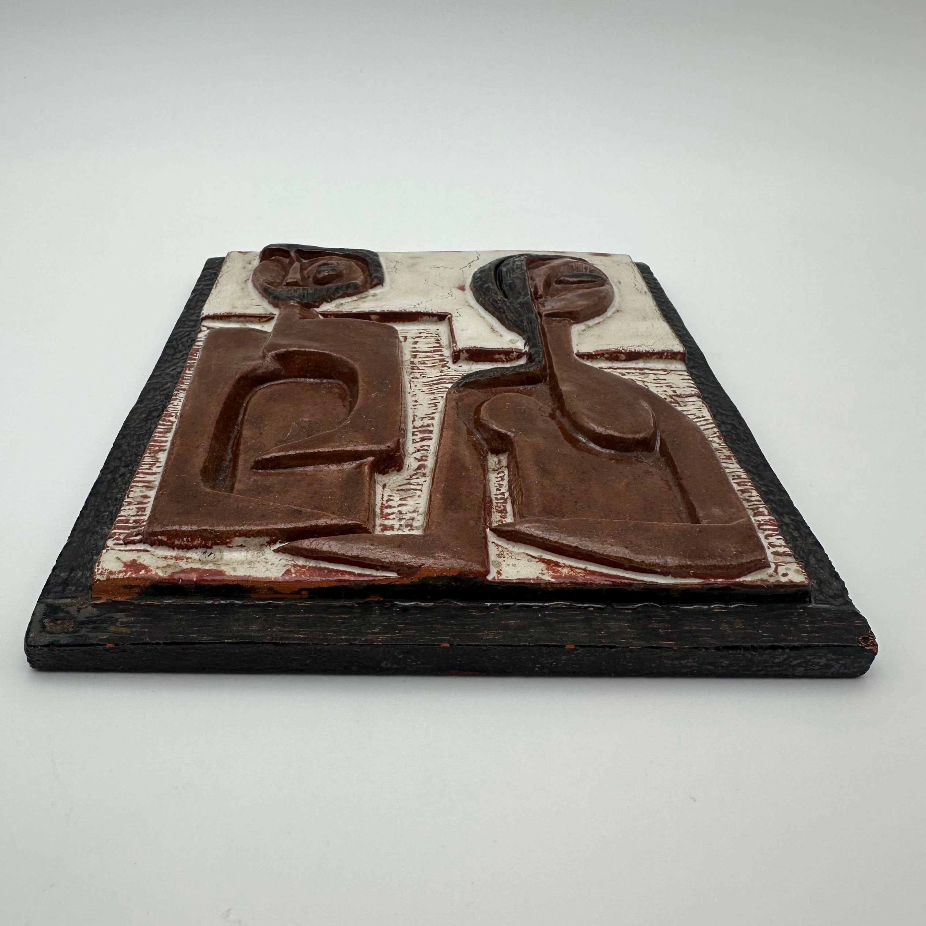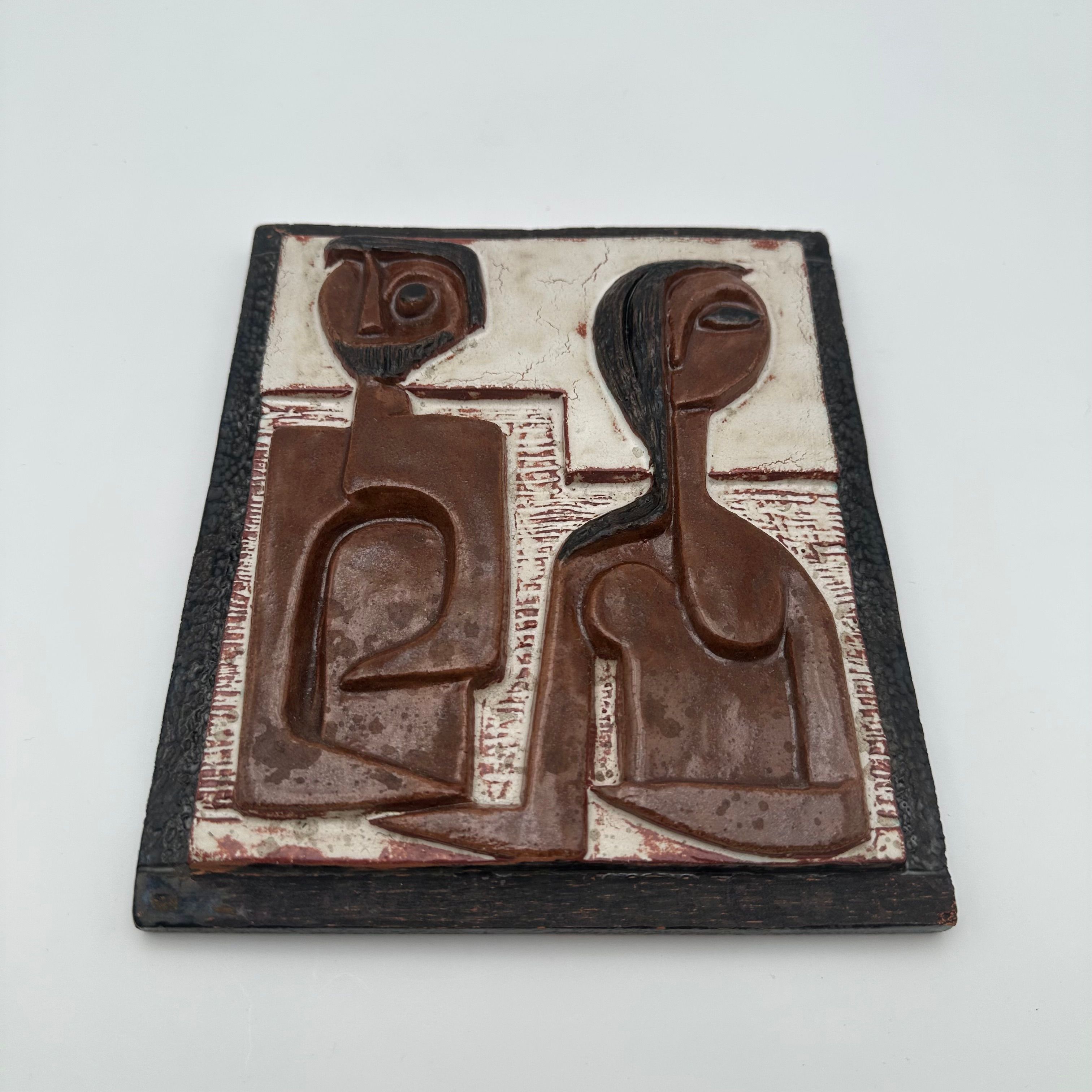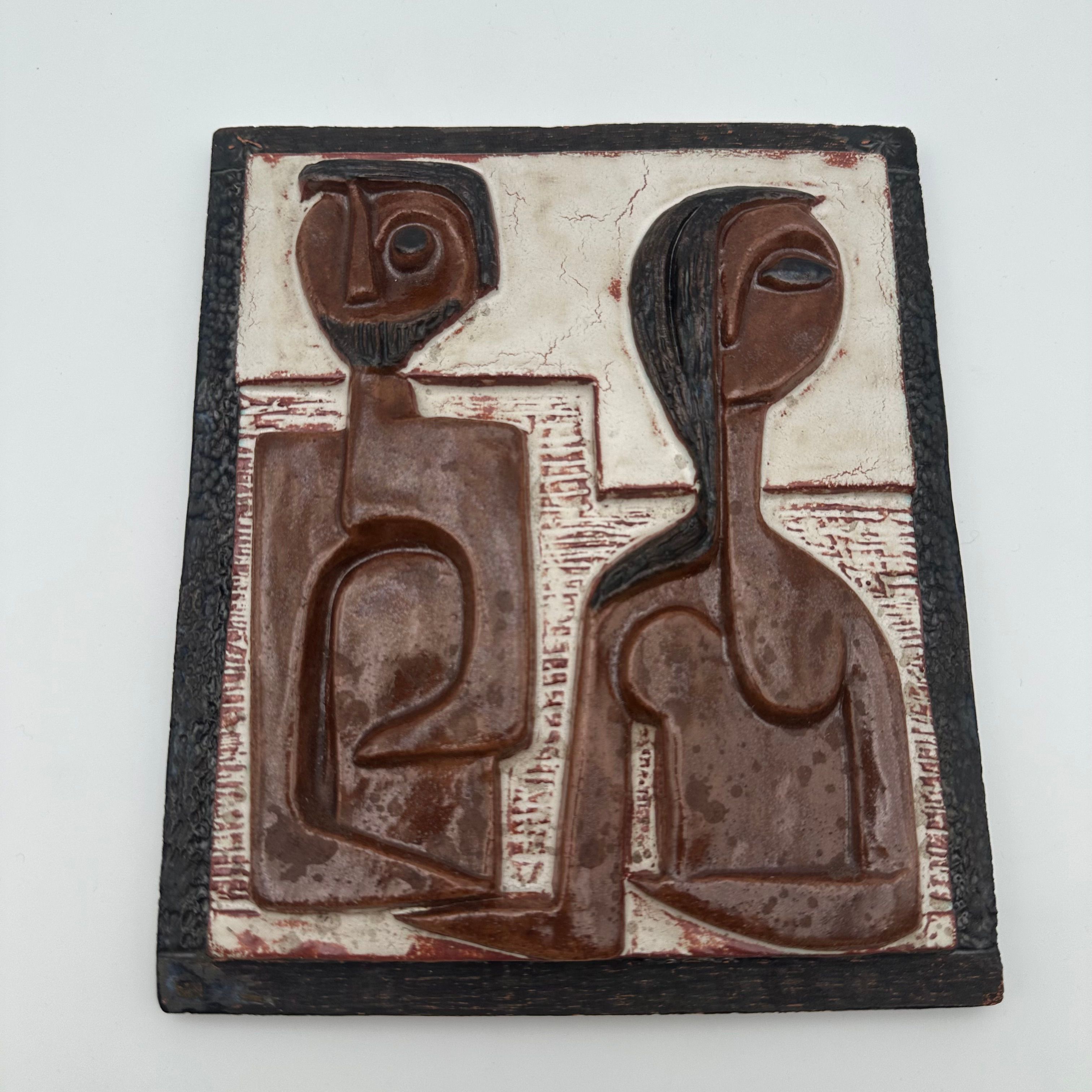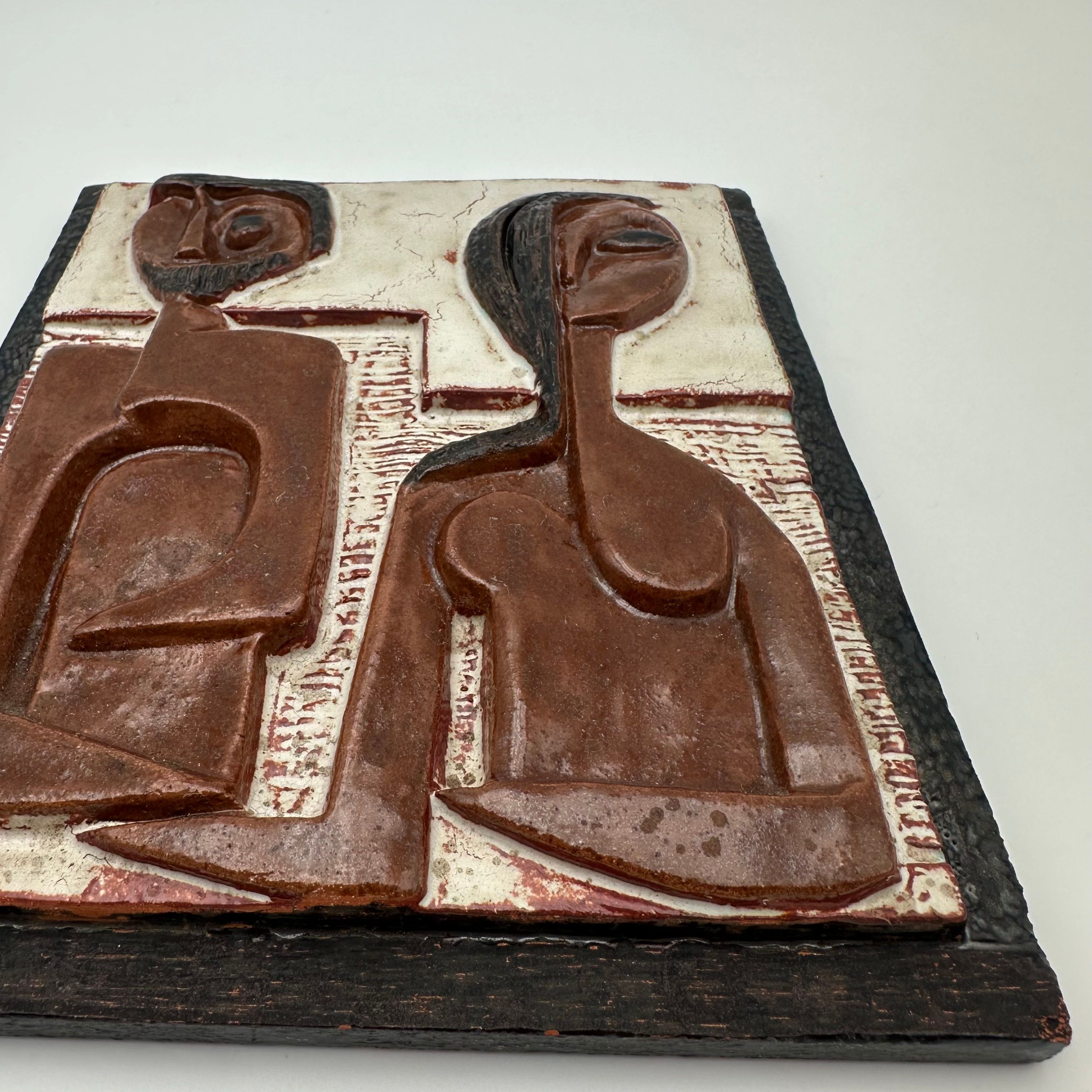 This sculptural composition depicts two stylized figures forming a couple, rendered in an abstract graphic language characteristic of modernist productions from the 1960s–70s. The relief is enhanced by an earthy brown and black glaze, bringing depth and presence to the piece.