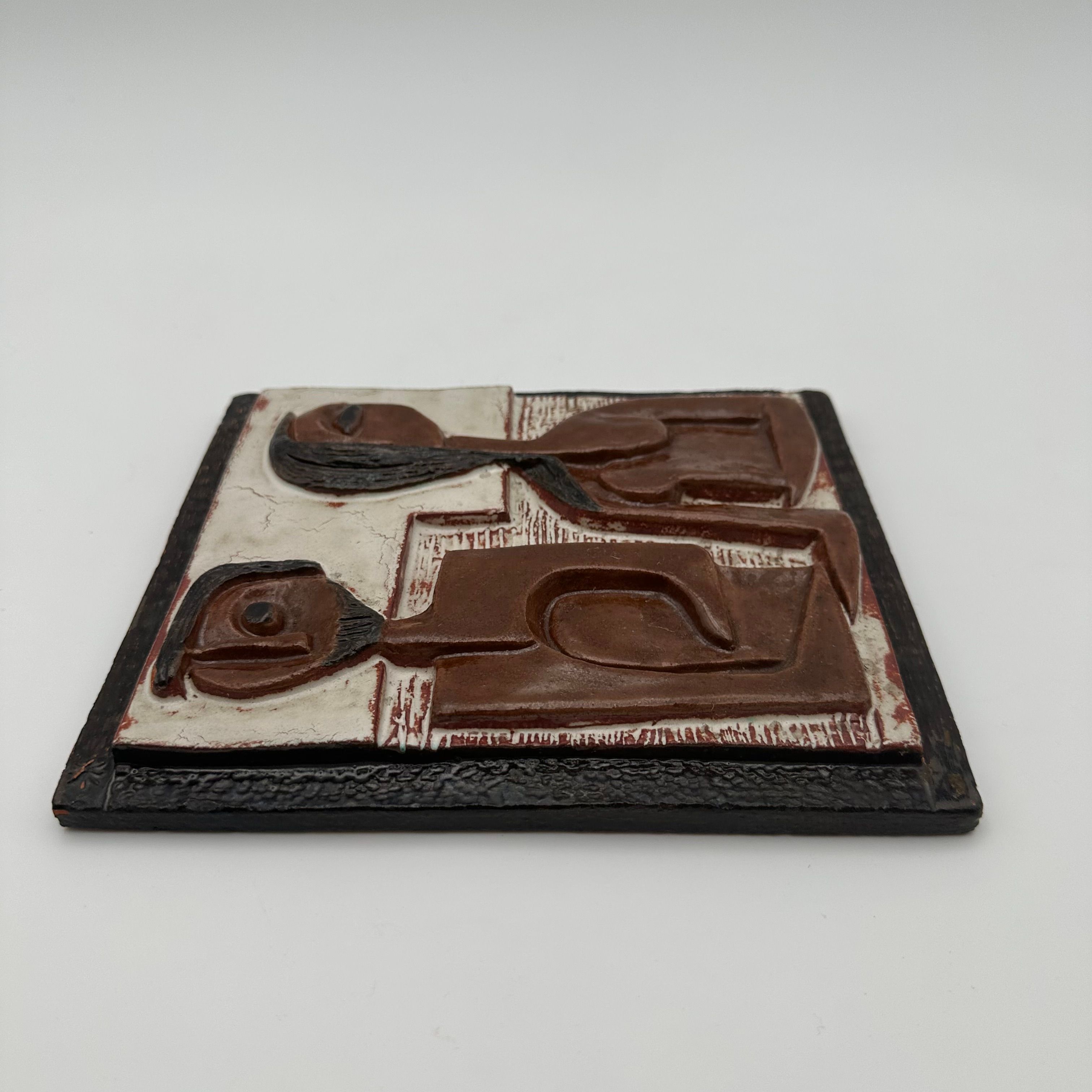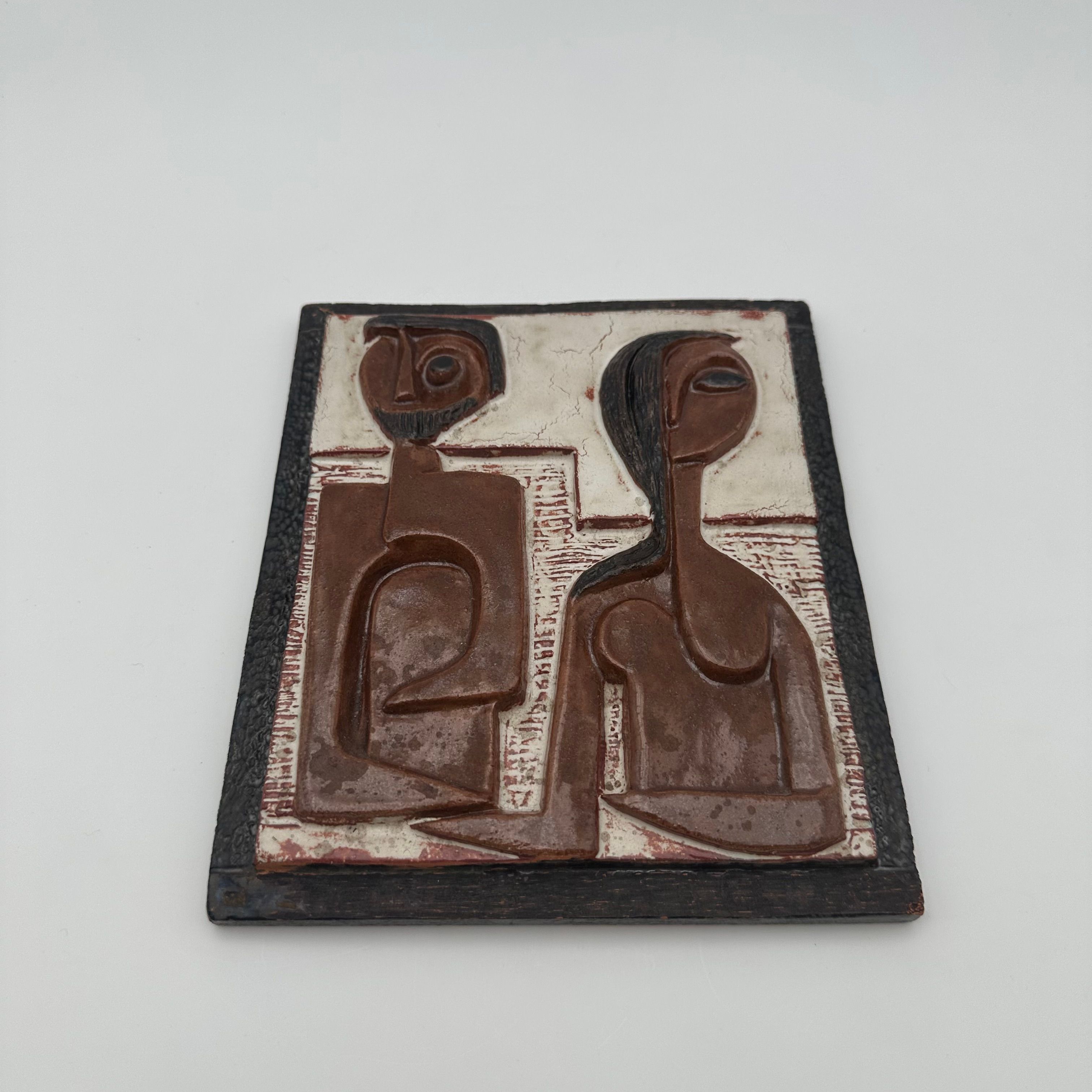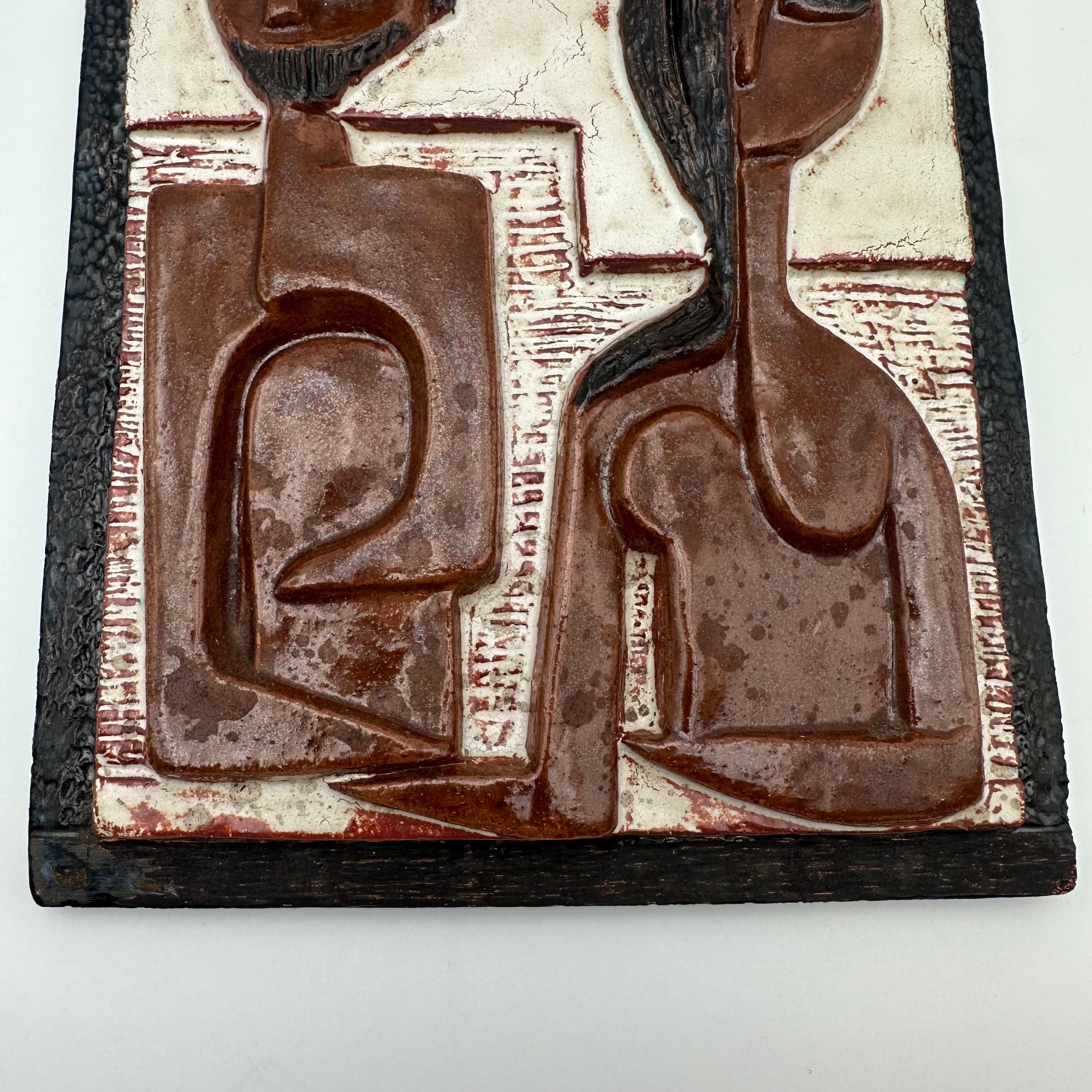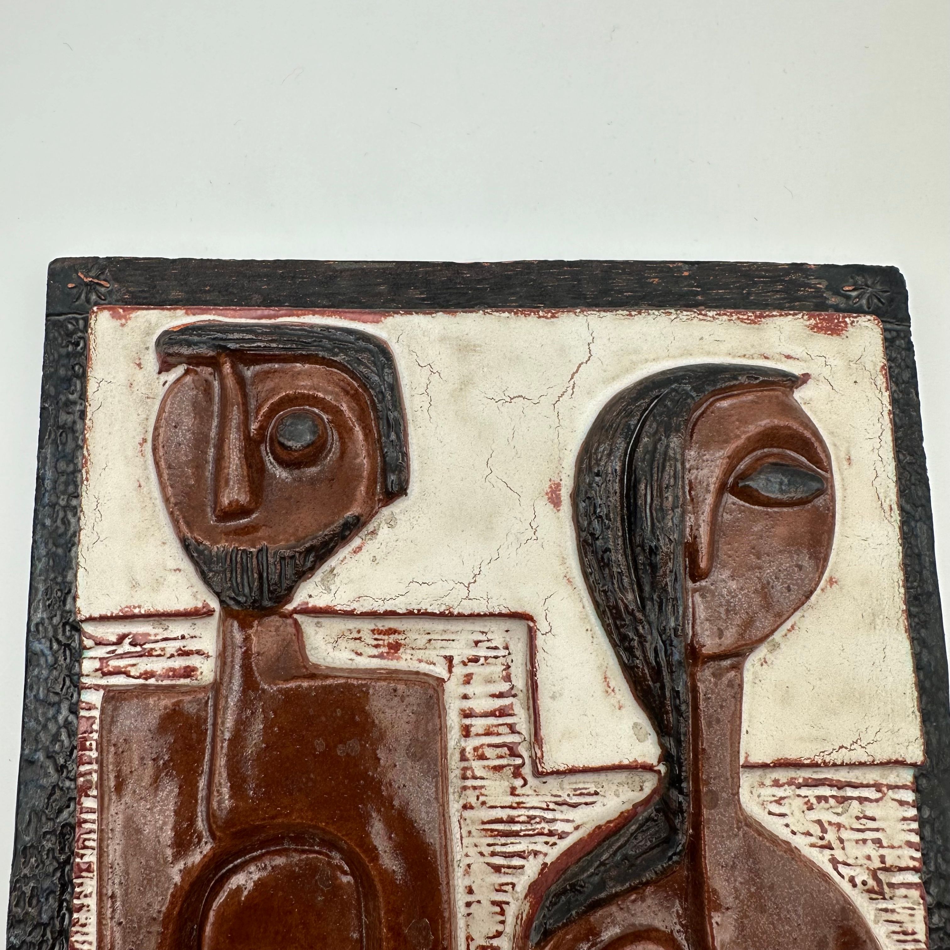This sculptural composition depicts two stylized figures forming a couple, rendered in an abstract graphic language characteristic of modernist productions from the 1960s–70s. The relief is enhanced by an earthy brown and black glaze, bringing depth and presence to the piece.