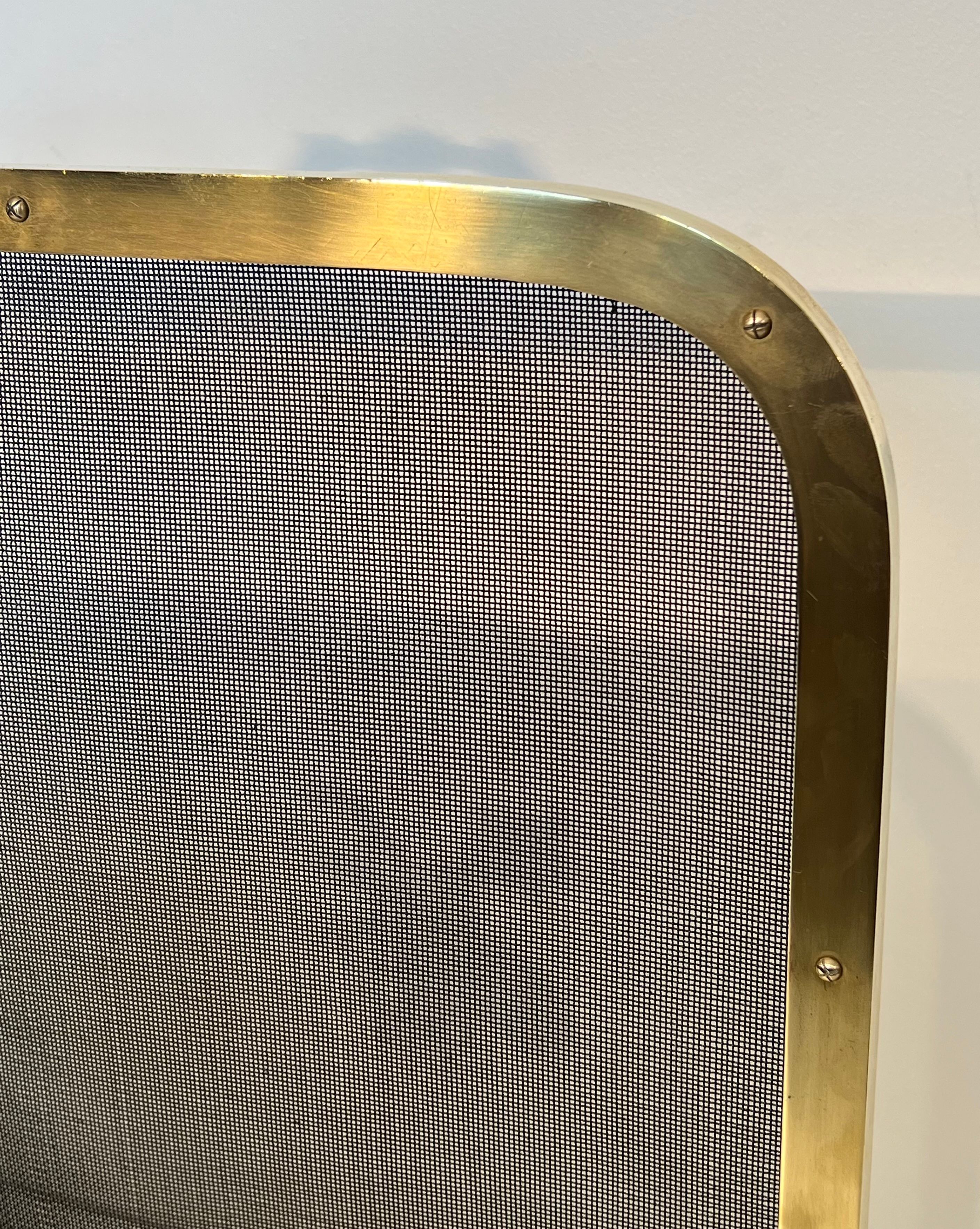 Neoclassical style brass and mesh fireplace screen with mandolin decorations and bouquet of flowers and horse hoof bases. French work marked "MS" intaglio. Circa 1970