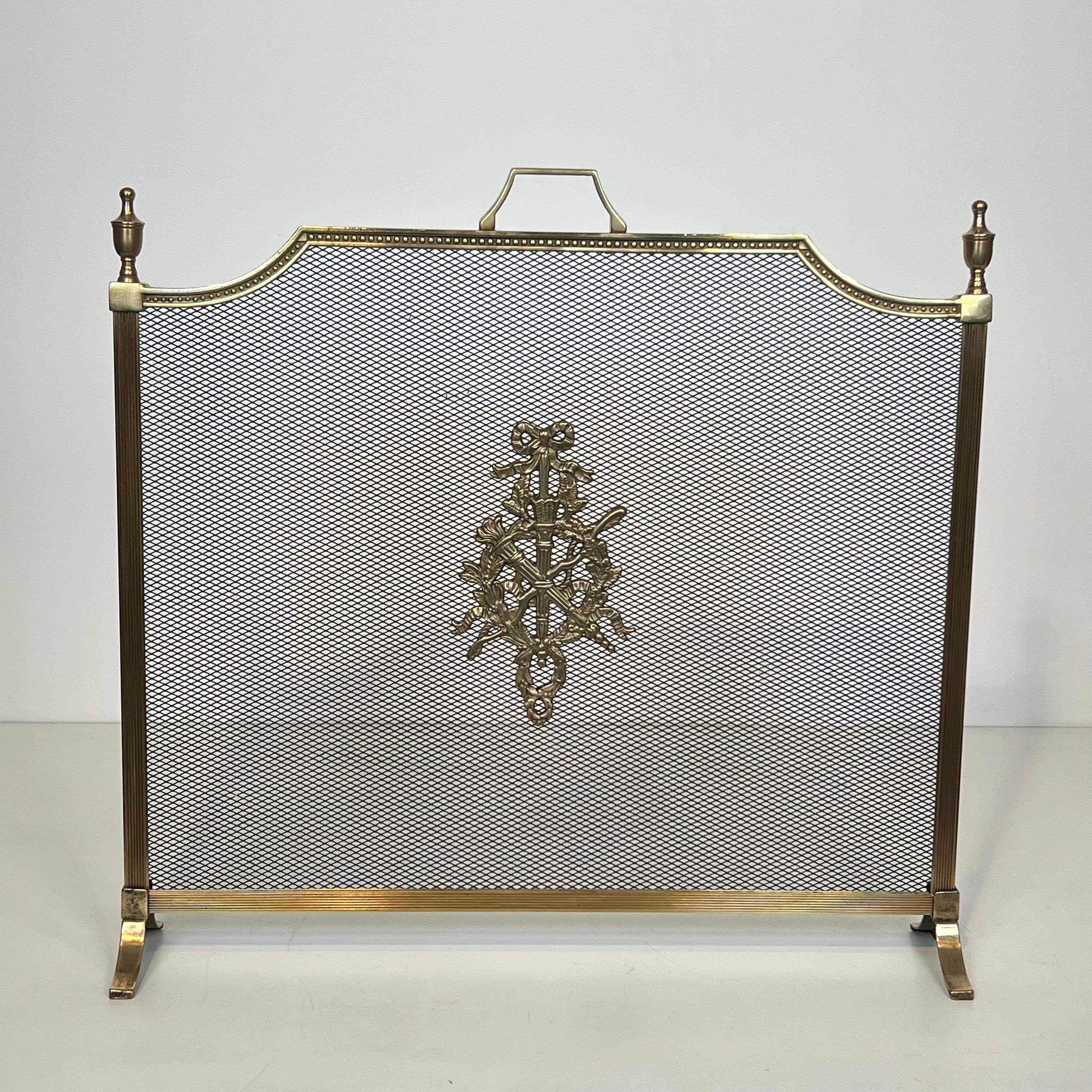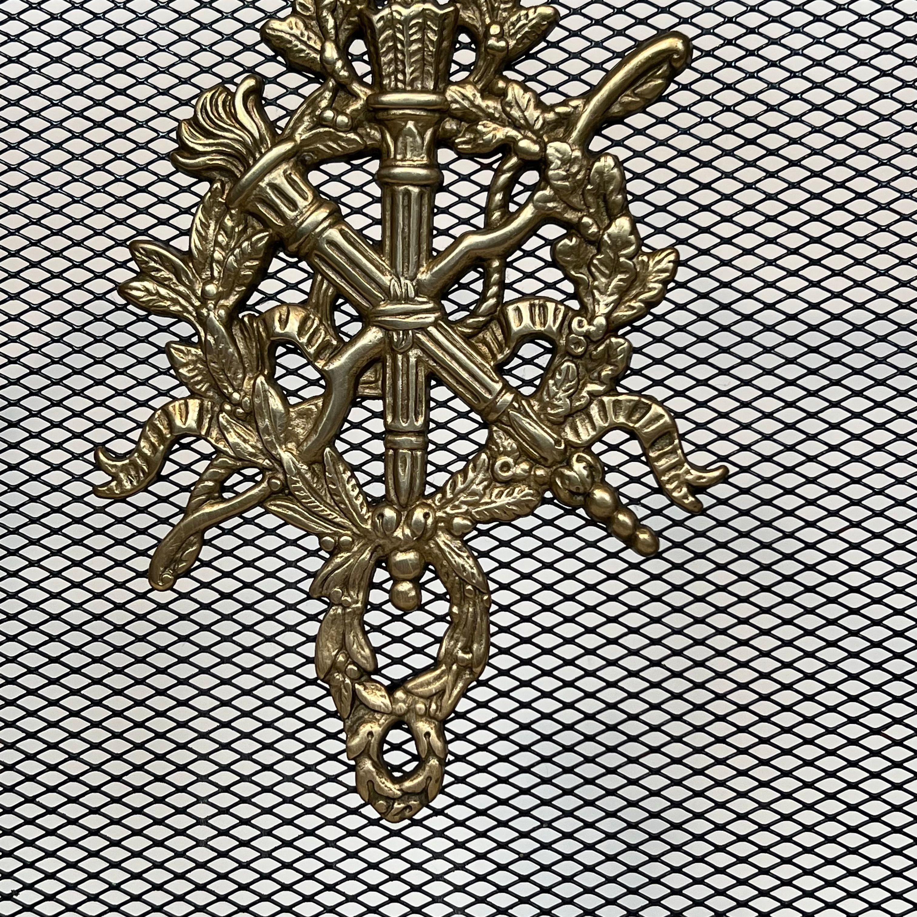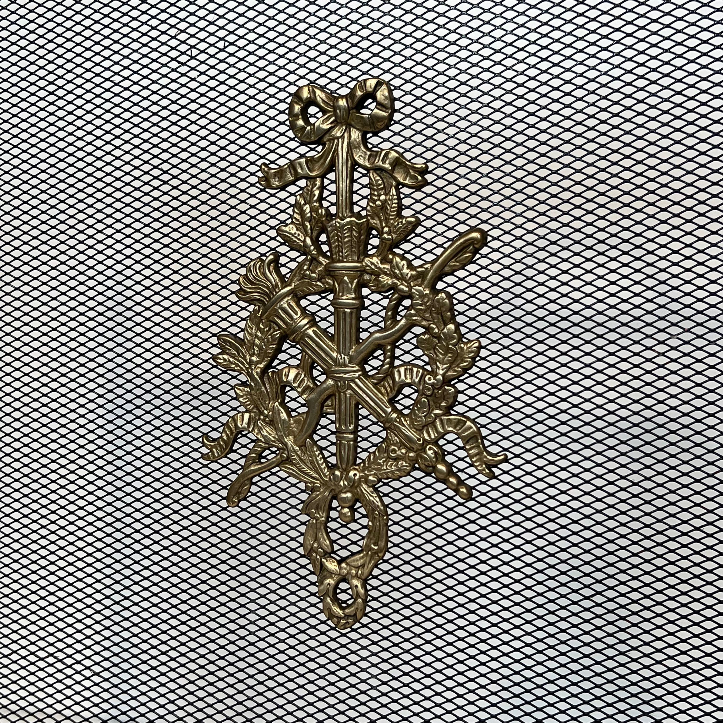 Louis XVI style brass fireplace screen with mesh decorated with knots, ribbons, laurel wreaths, bow and quiver. French work in the style of Maison Jansen. Circa 1940