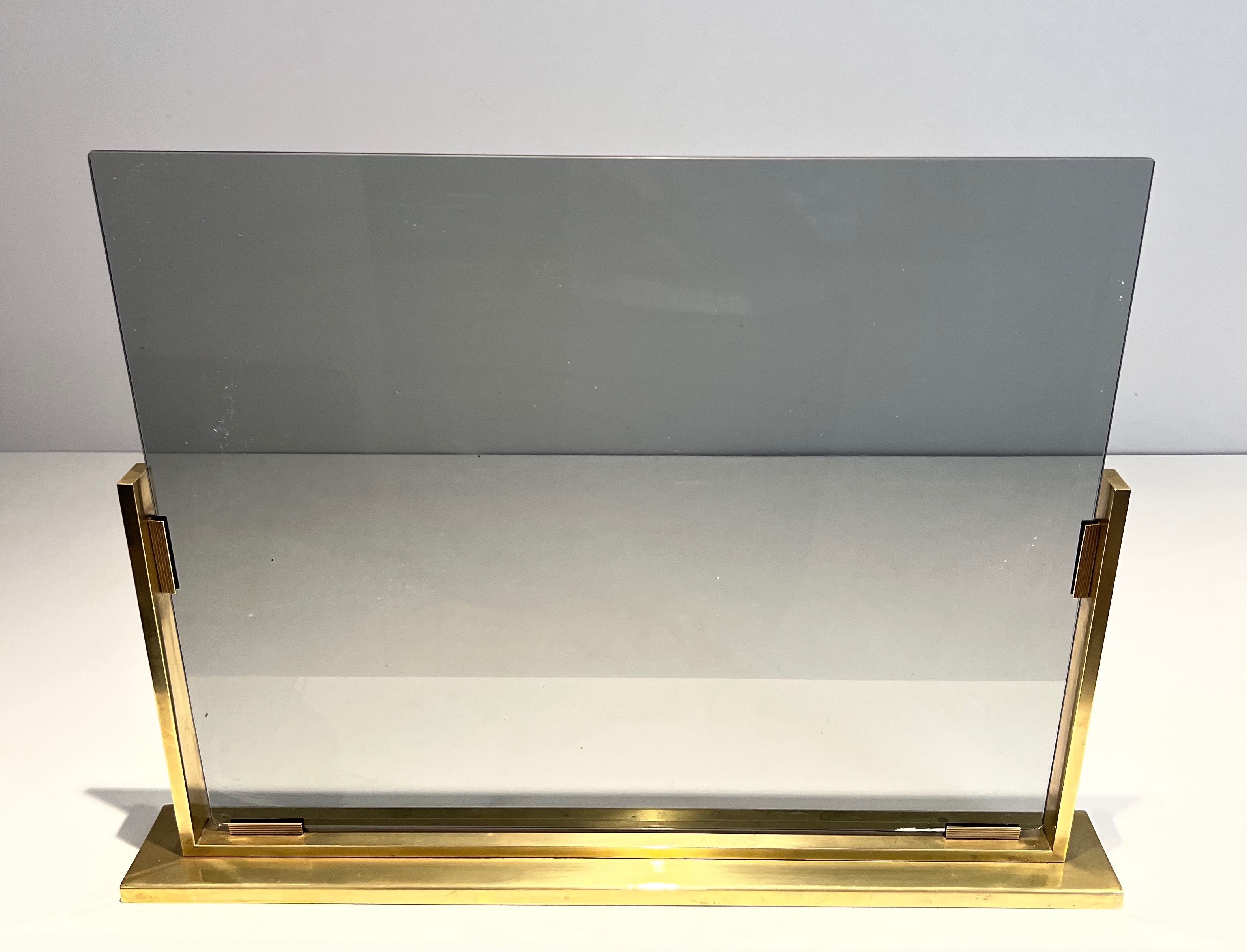 Smoked Glass and Brass Fireplace ScreenSmoked Glass and brass fireplace screen with brass feet. French work. Circa 1970Request priceDimensionsWidth26.18 inch66.5 cmDepth3.15 inch8 cmHeight19.29 inch49 cmInformationProduct codeFP-6317