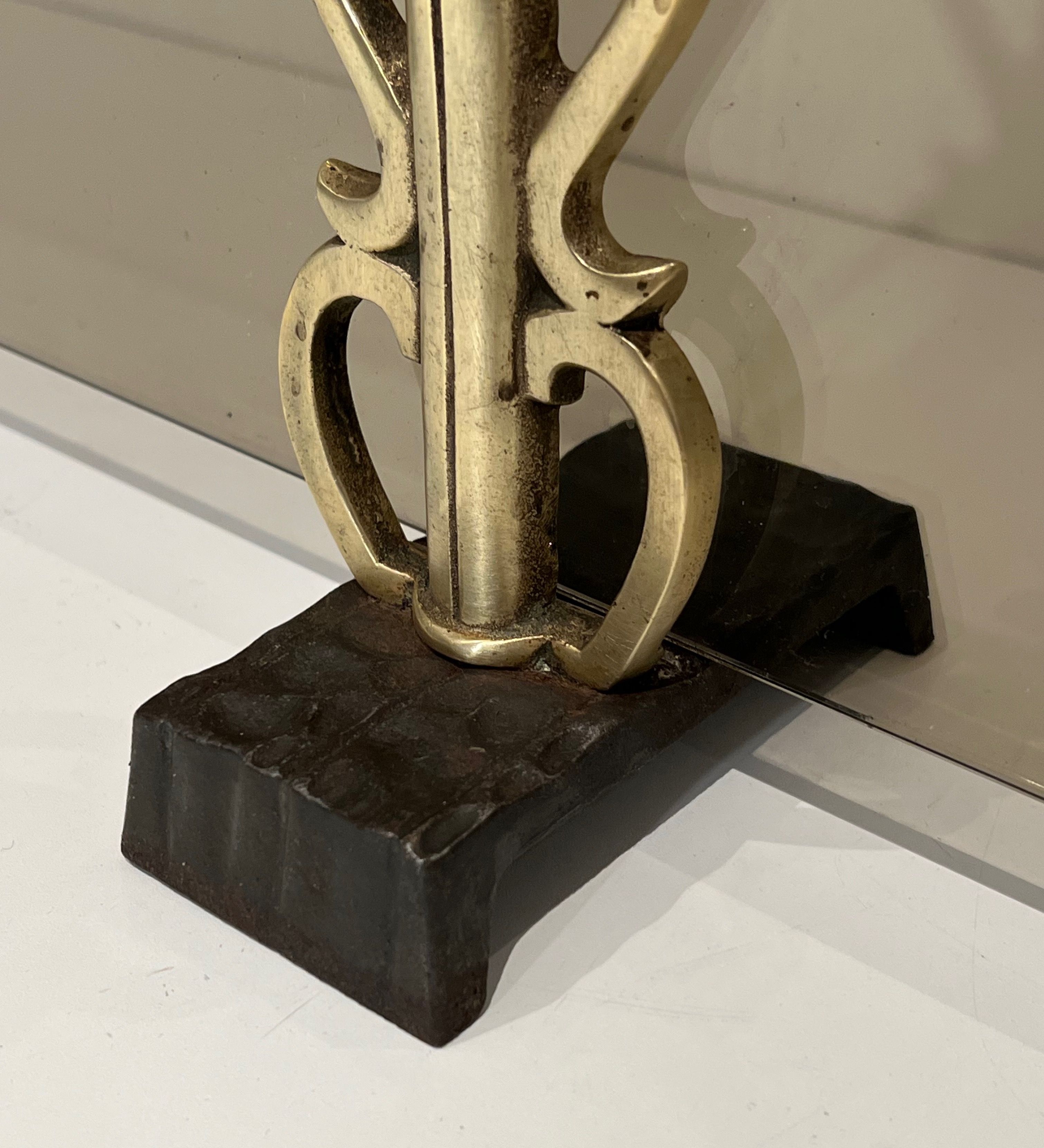 Smoked glass fireplace screen with modernist bronze elements. French work in the style of Raymond Subes. Circa 1970